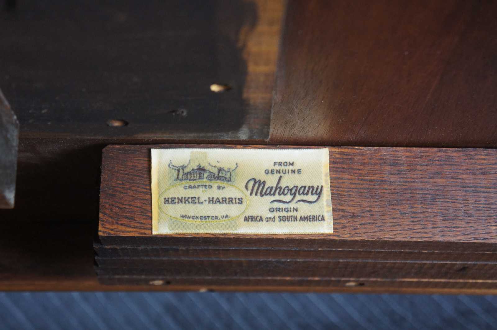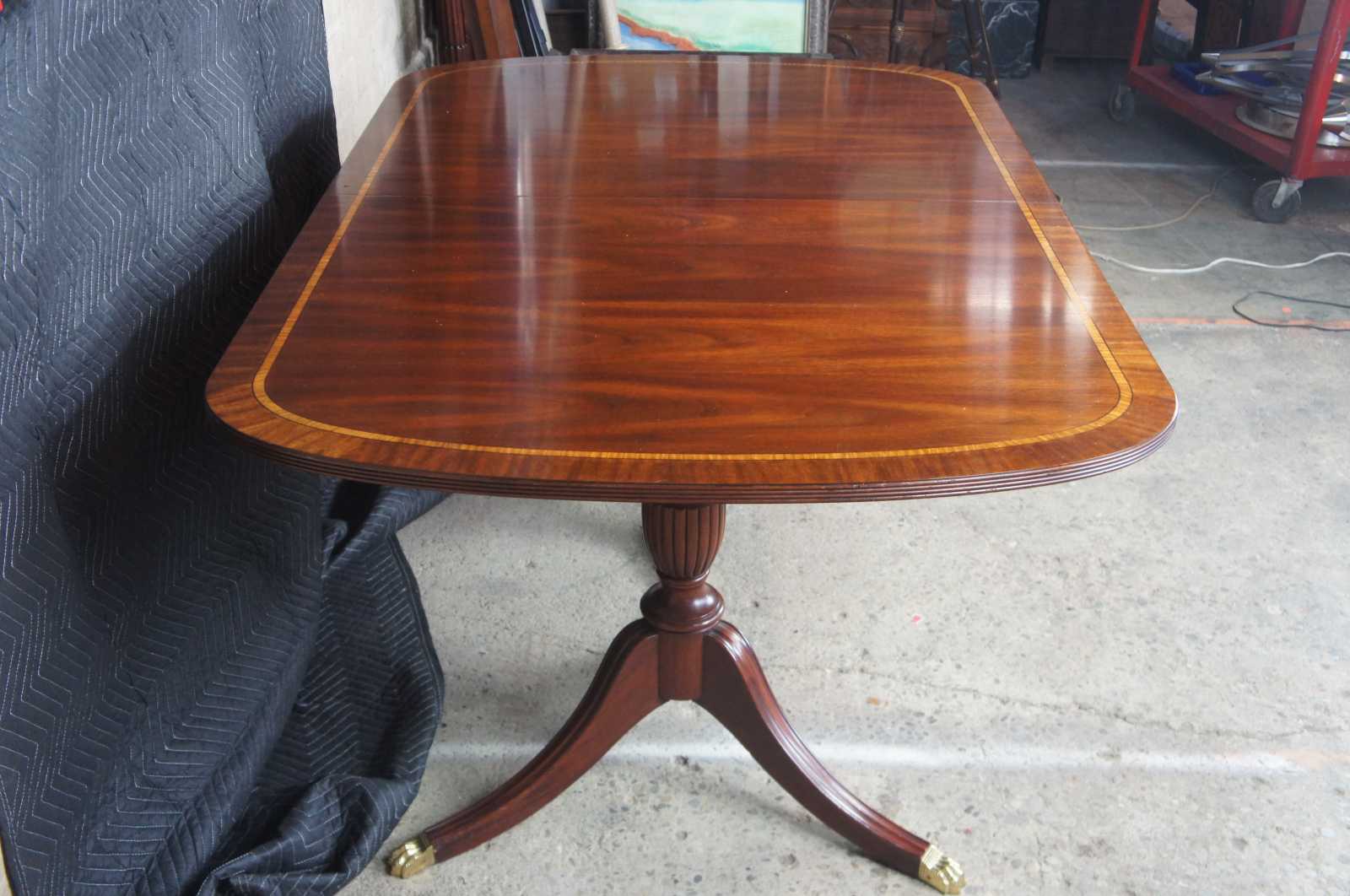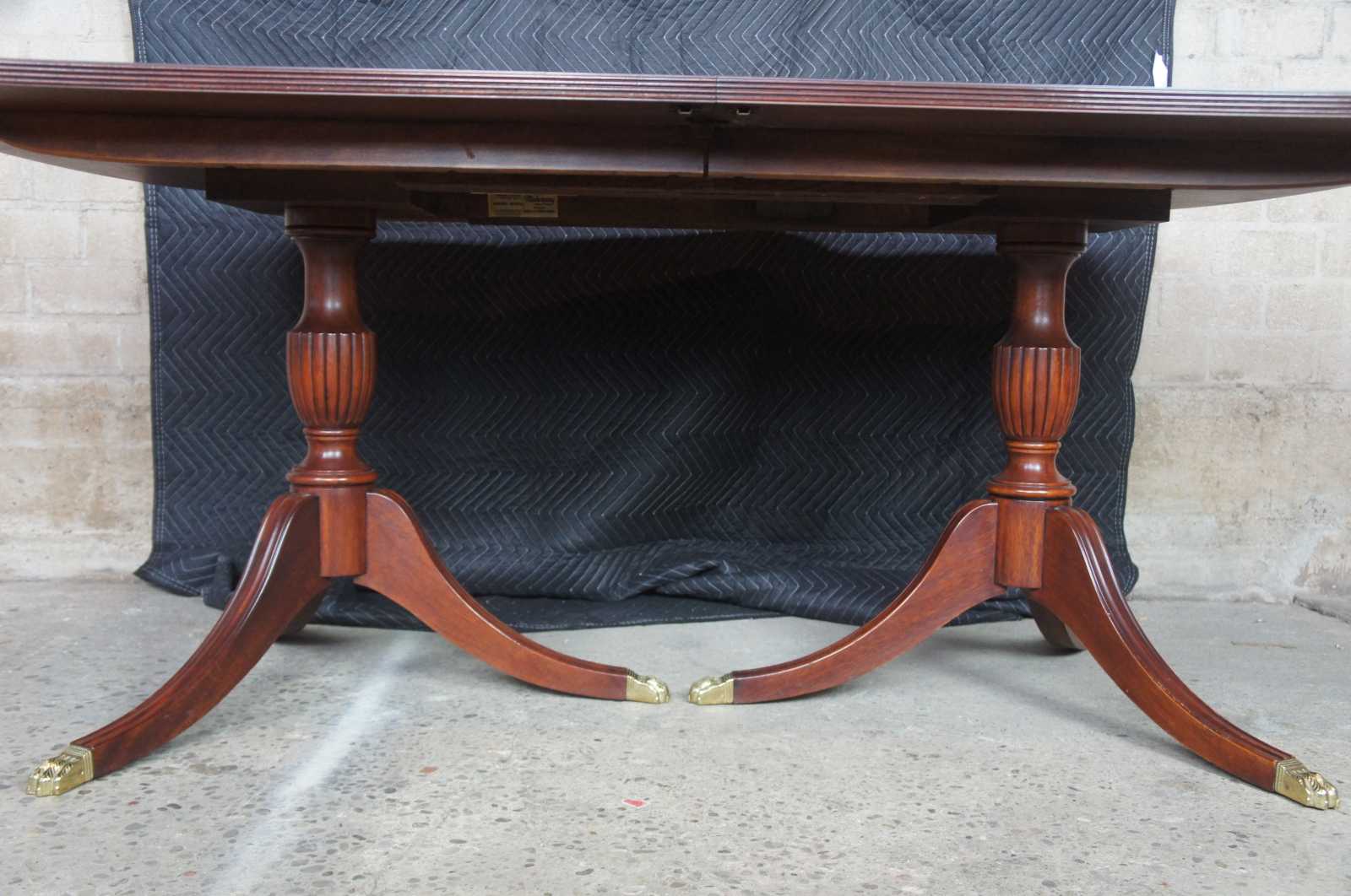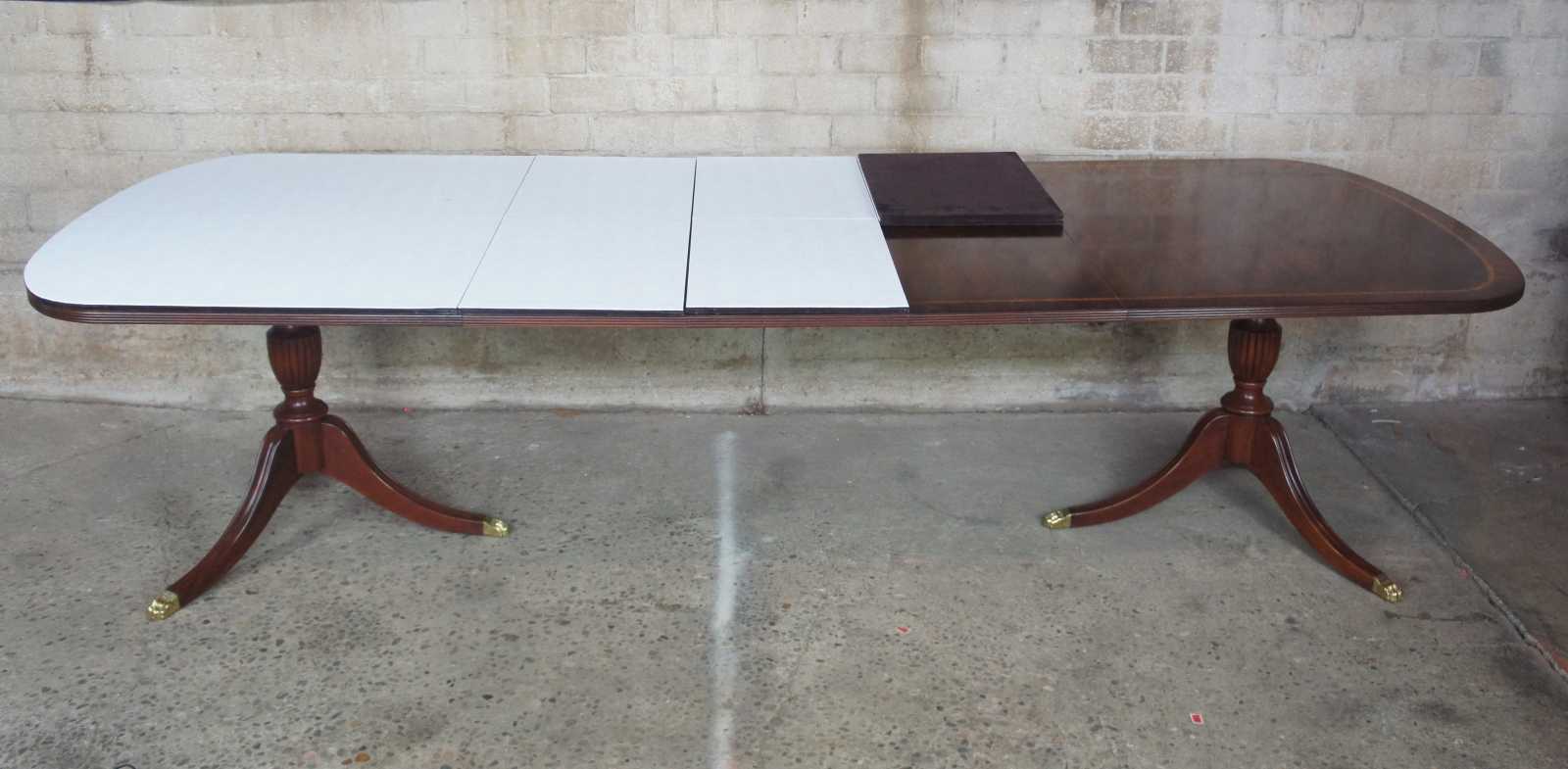 Cathedral figured mahogany veneer top with ribbon stripe border, pau amarilla inlay and anigre separators. Fillers are numbered and matched to each table. Reeded urn pedestal with three sweeps and brass terminals. Pedestals are reversible. Wood table slides. Pads included.