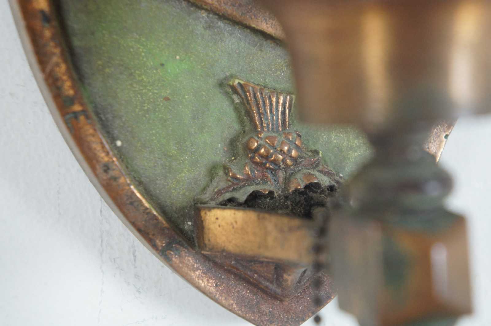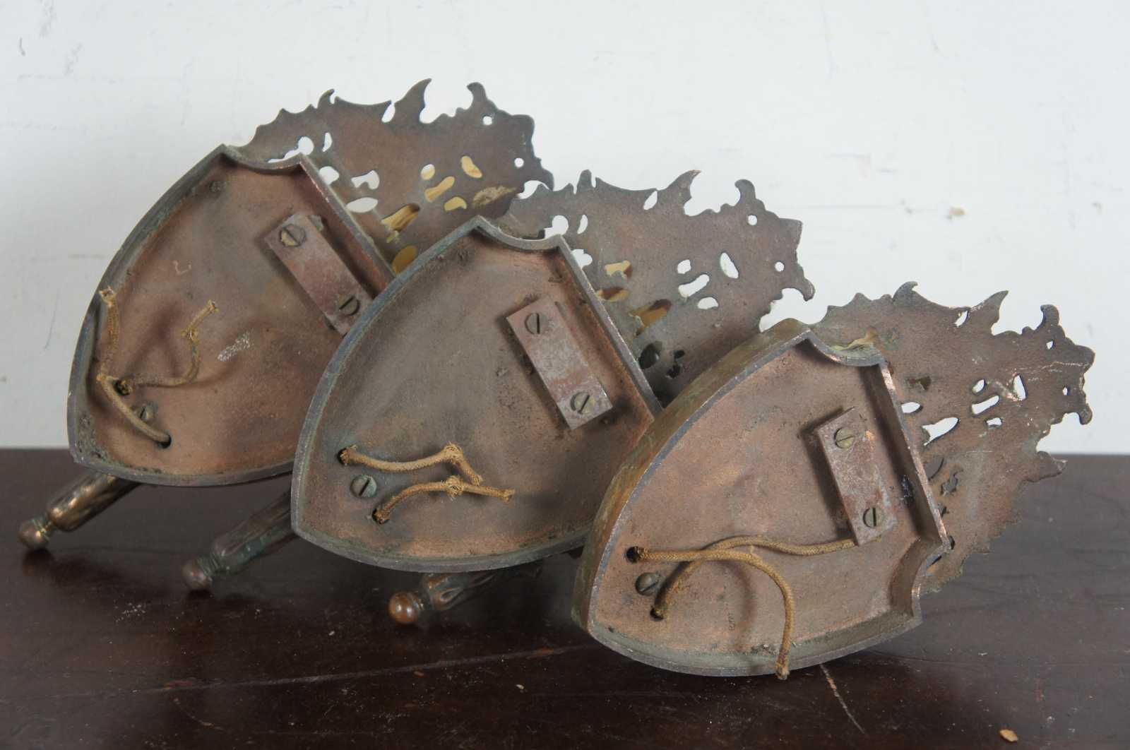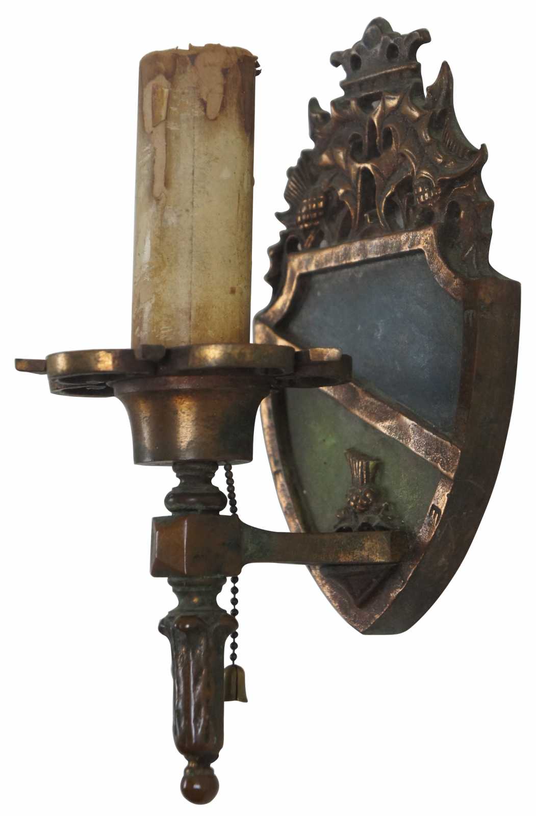 Three early 20th century sheild back sconces. The perfect edition for any early 20th century period home. Features a colorful sheild back with ornate pierced crown, candlestick covers and a thistle accents. Comes from one of the first homes built in Oakwood, Ohio by Harry I Schenck.