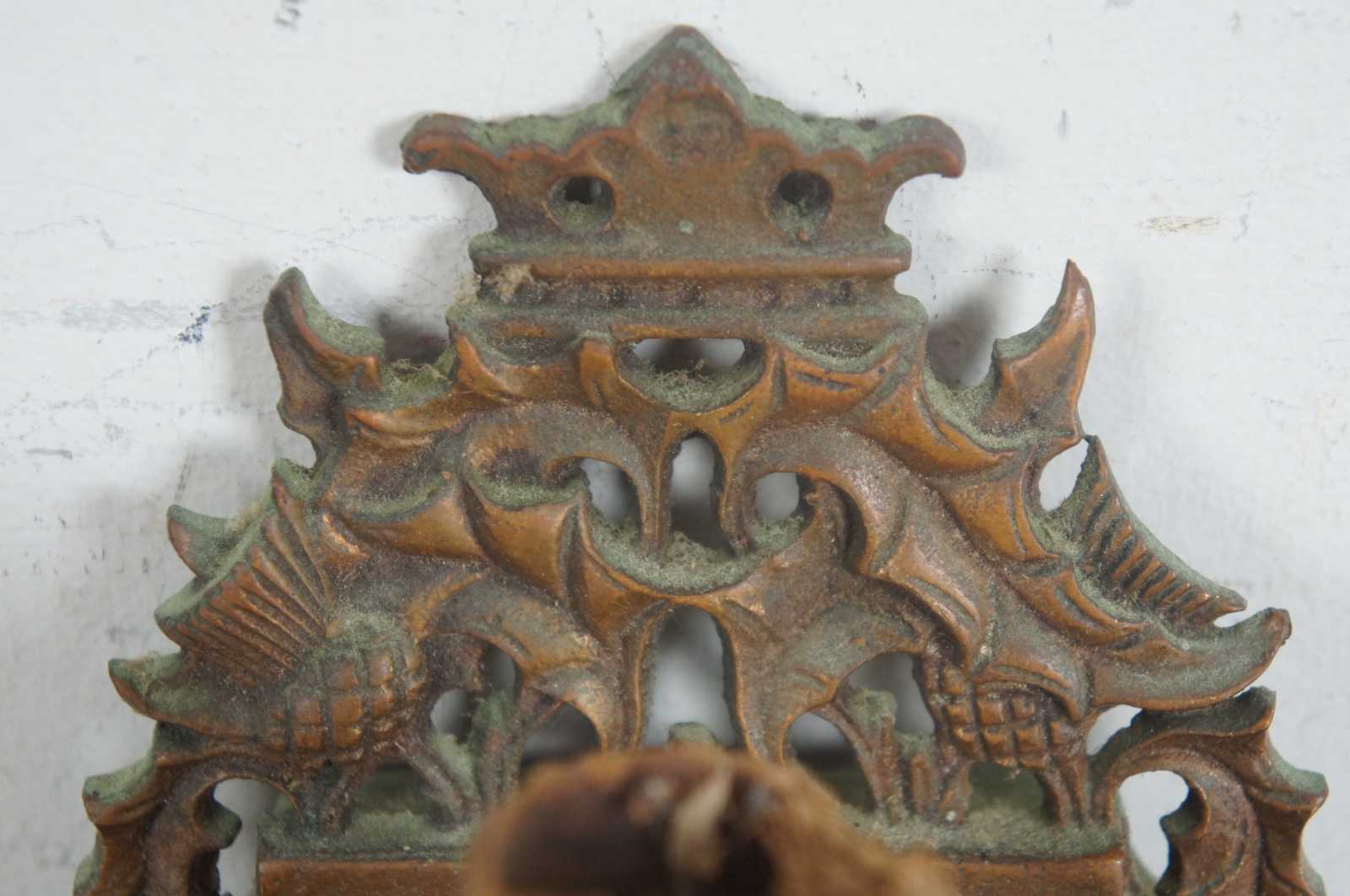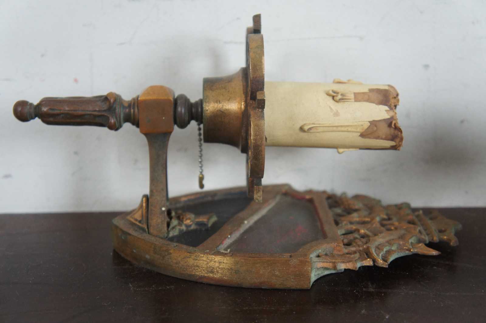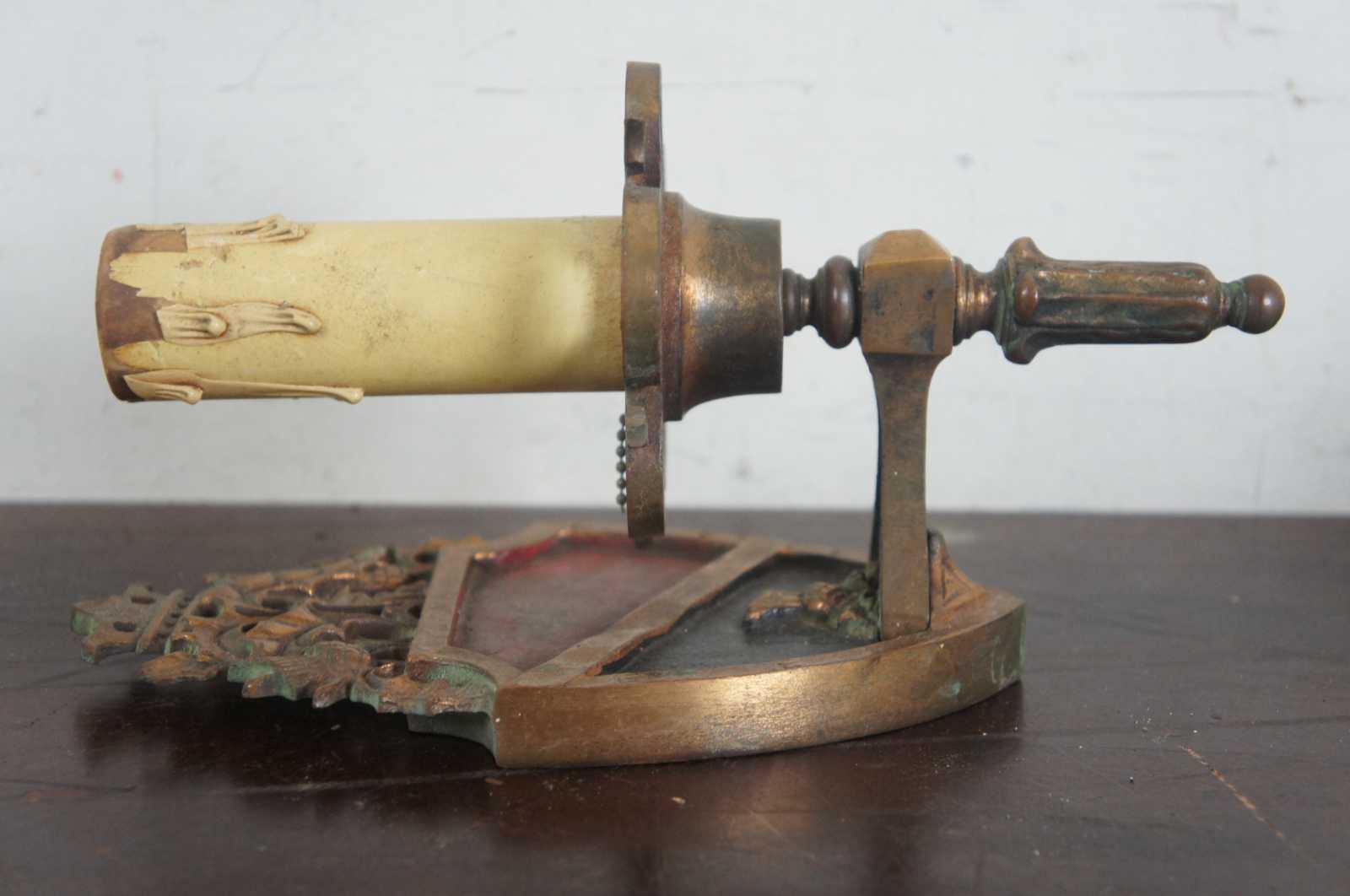 Three early 20th century sheild back sconces. The perfect edition for any early 20th century period home. Features a colorful sheild back with ornate pierced crown, candlestick covers and a thistle accents. Comes from one of the first homes built in Oakwood, Ohio by Harry I Schenck.