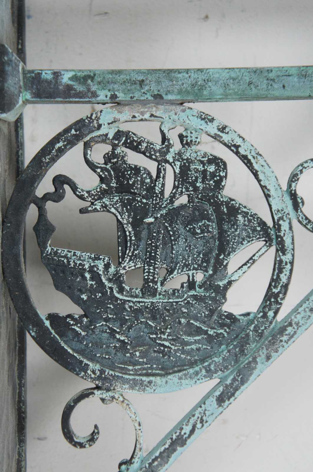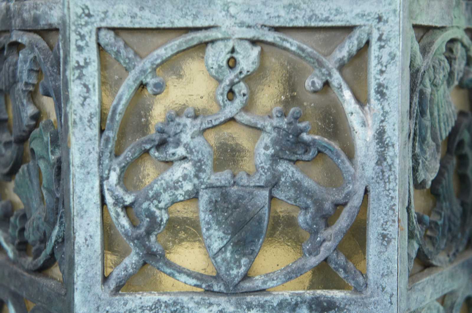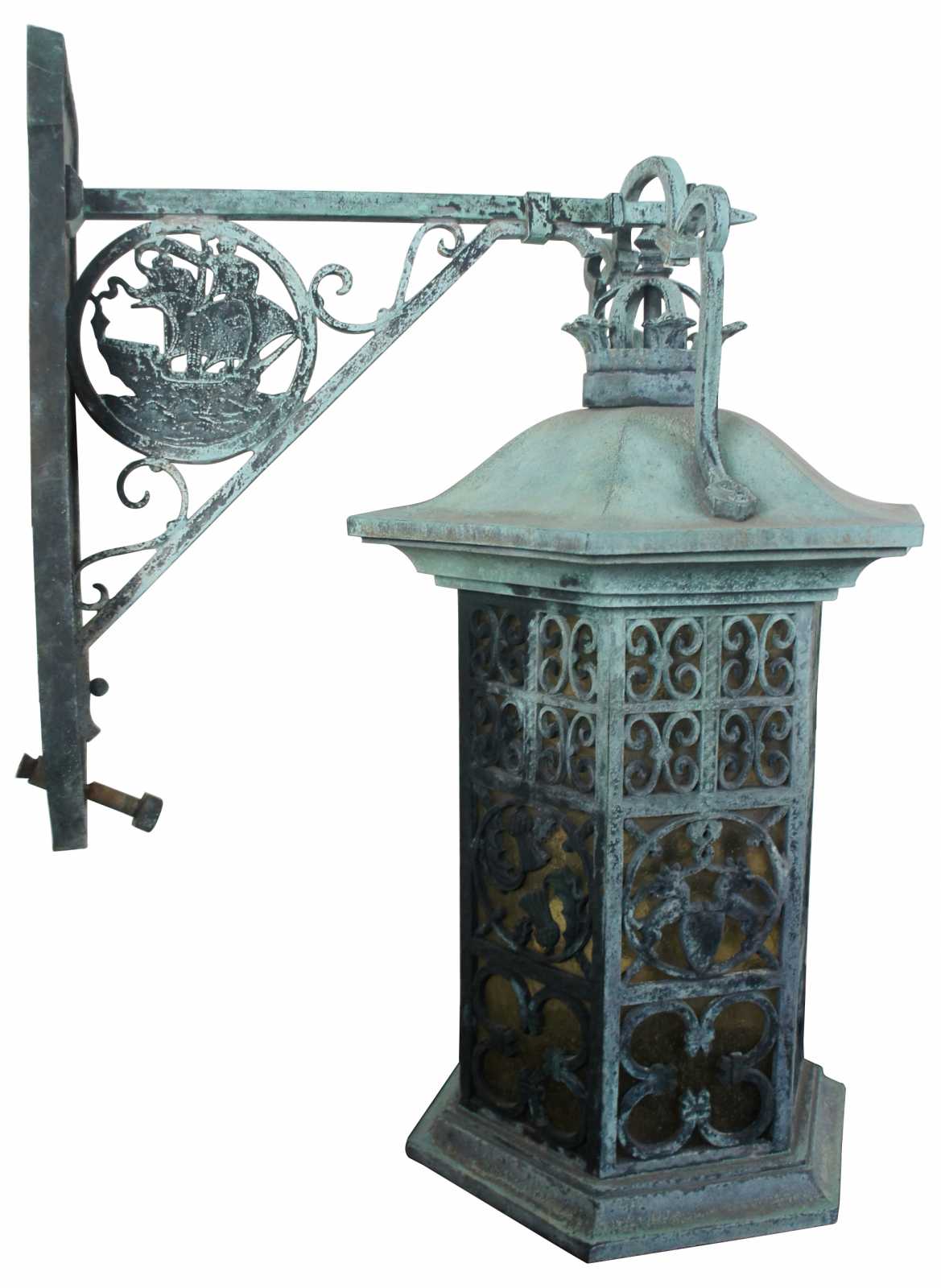 Iron lantern wall sconce. Features a nautical theme with a ship on the wall plaque / crane and heraldic coat of arms, thistles and ornate detail on the lantern. This piece comes from one of the first homes built in Oakwood, Ohio by Harry I Schenck.