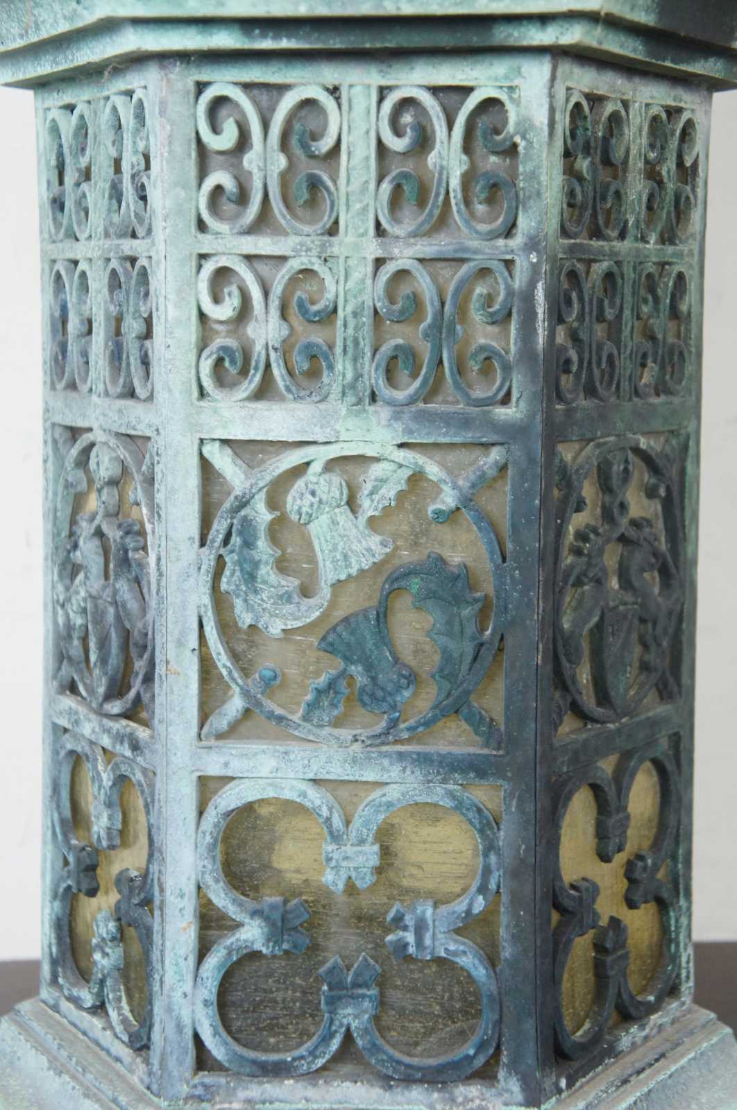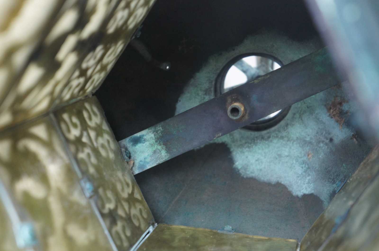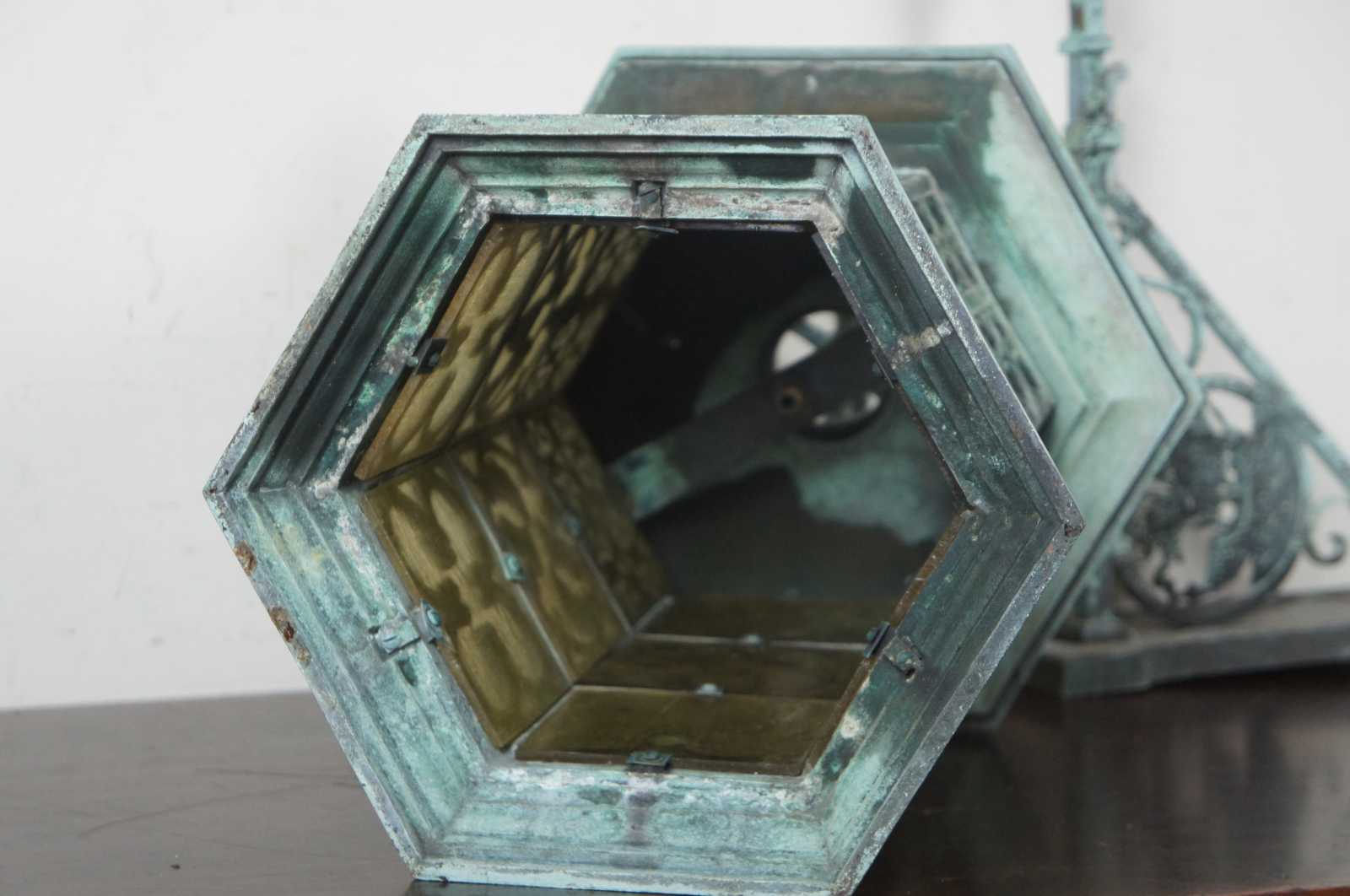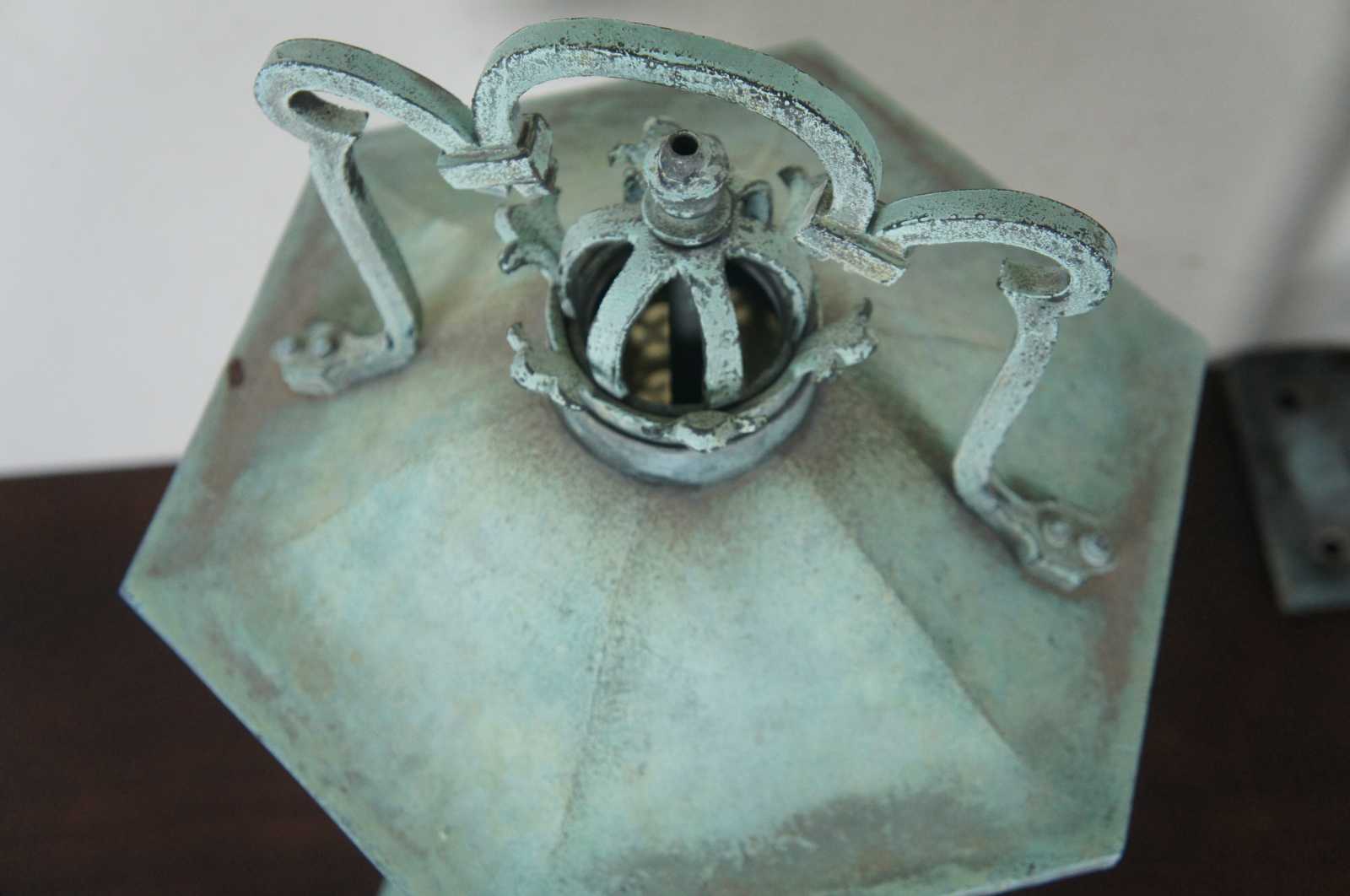 Good overall, the lantern is disconnected from the hanger, will need wiring and repair before install, no light socket; see pictures