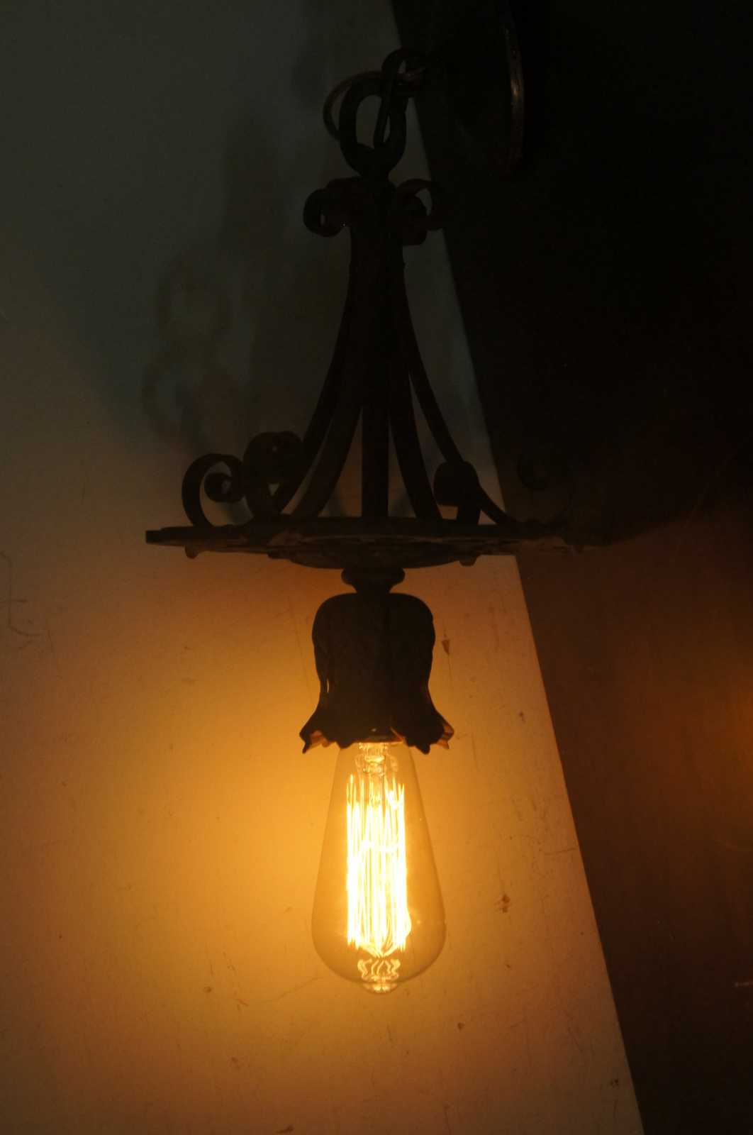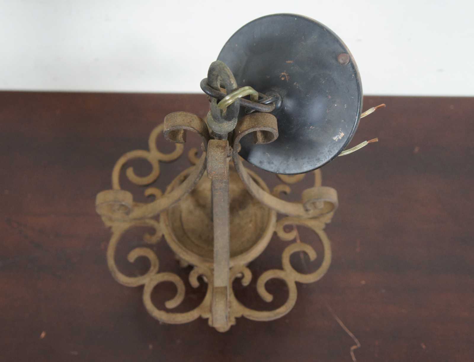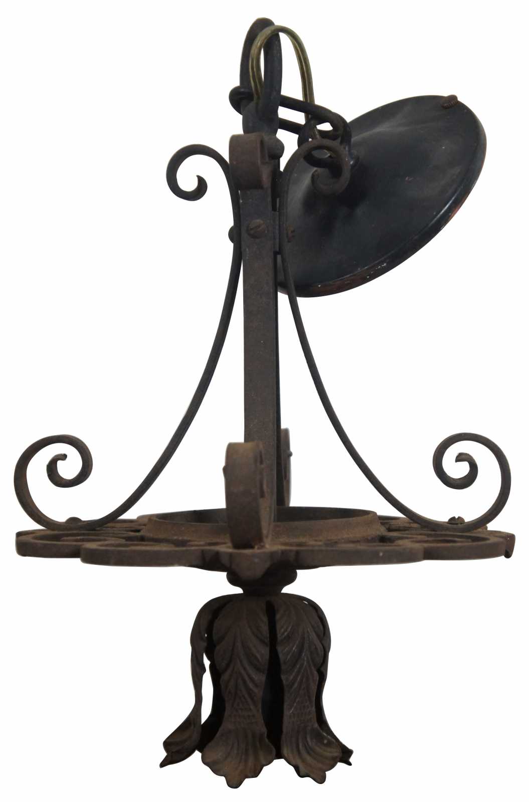 Antique cast iron ceiling pendant light or chandelier. Features spanish revival styling and scrolled acanthus accents. Comes from one of the first homes built in Oakwood, Ohio by Harry I Schenck.