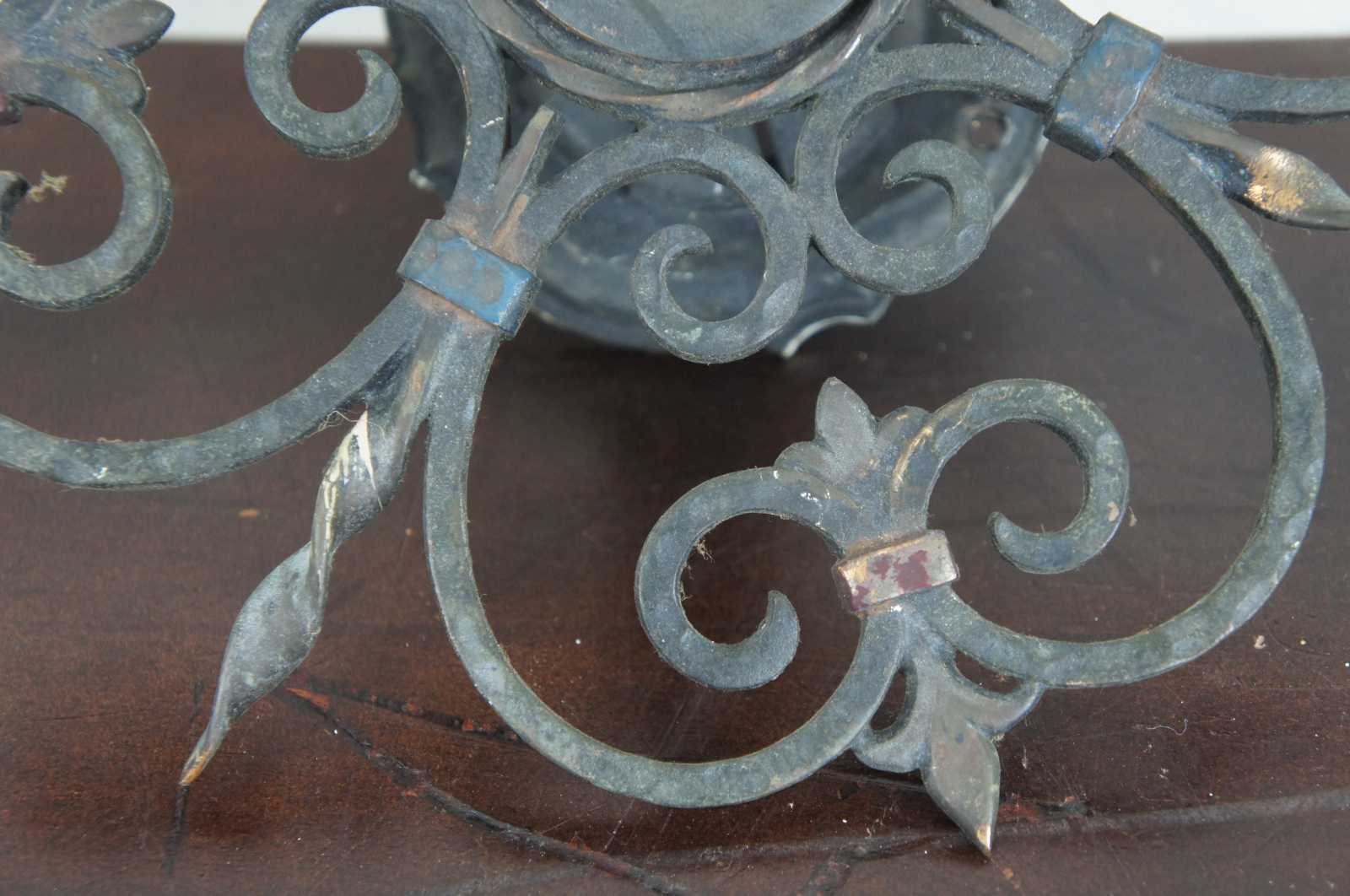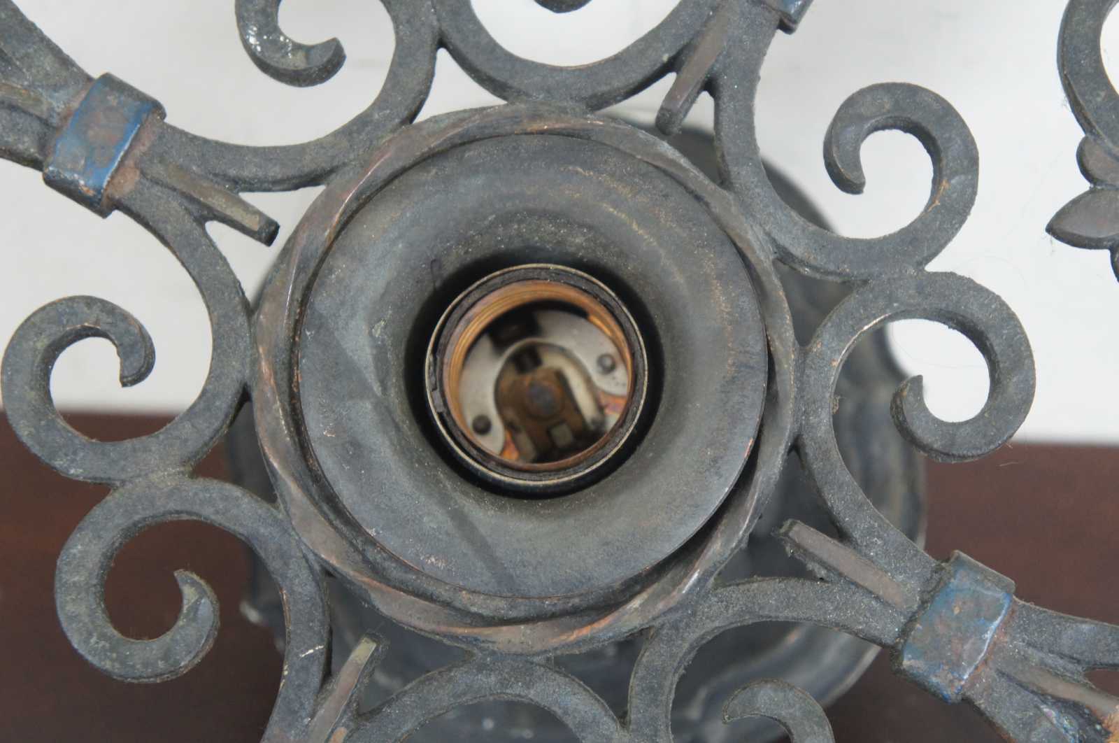 Antique French cast iron medallion pendant ceiling lights. Features scroll work with fleur de lis accents. Comes from one of the first homes built in Oakwood, Ohio by Harry I Schenck.