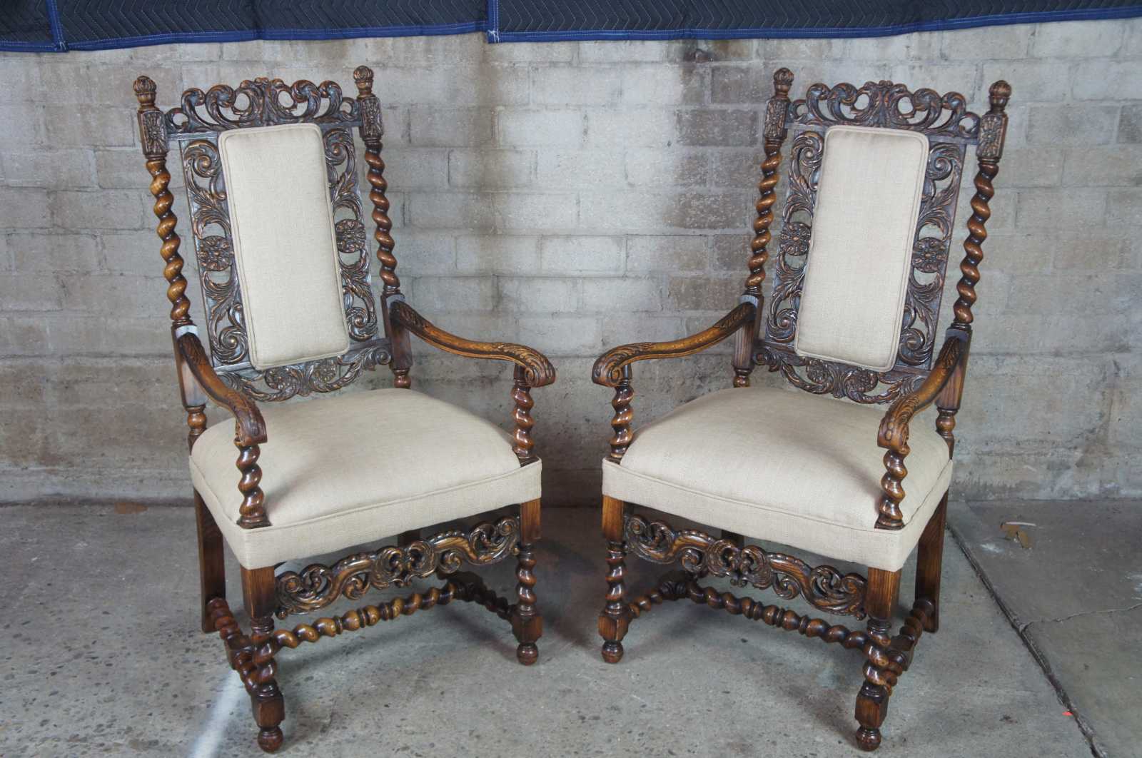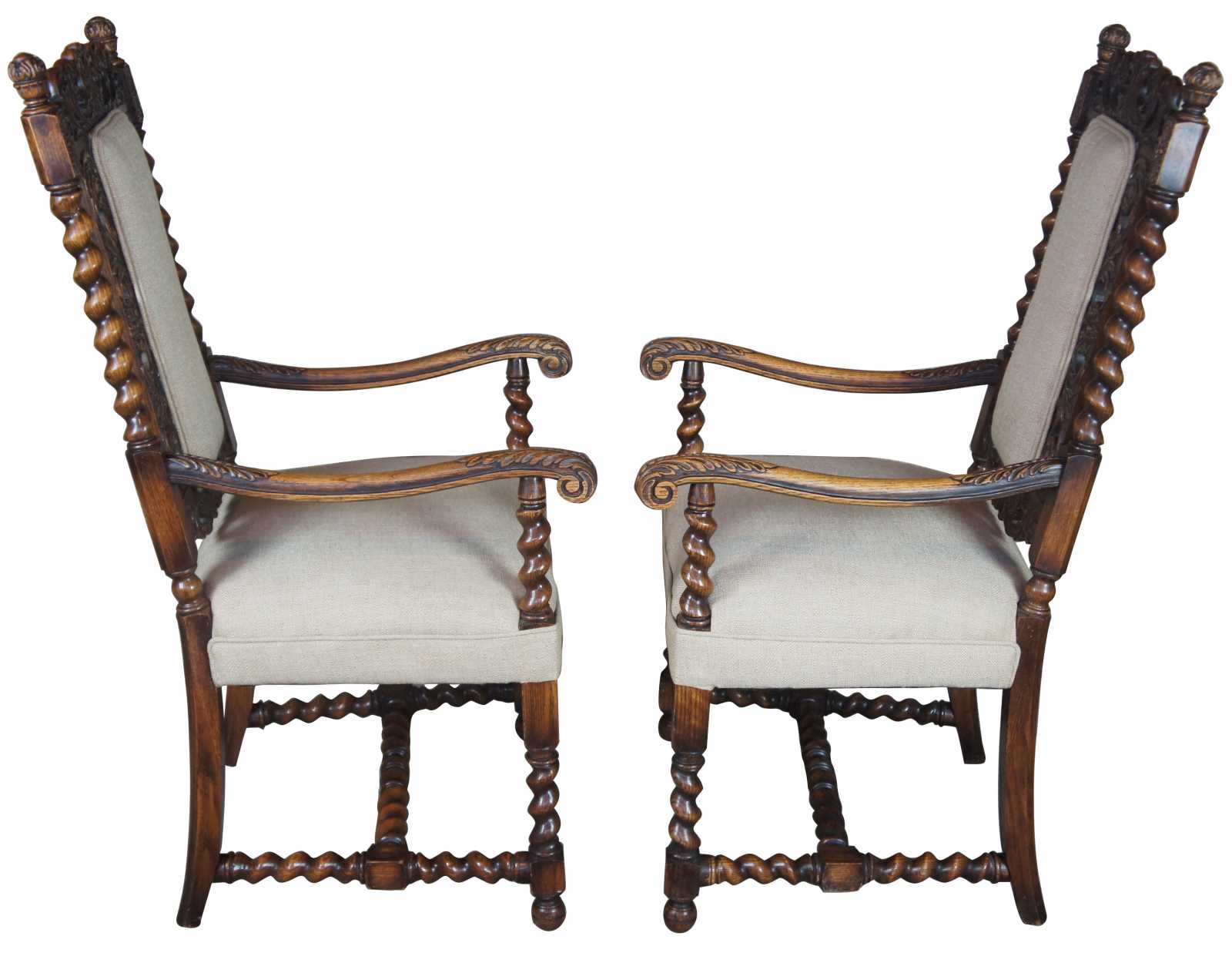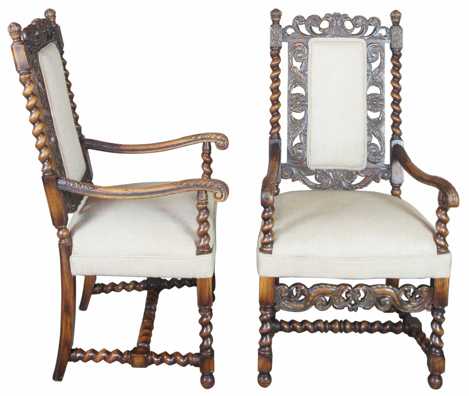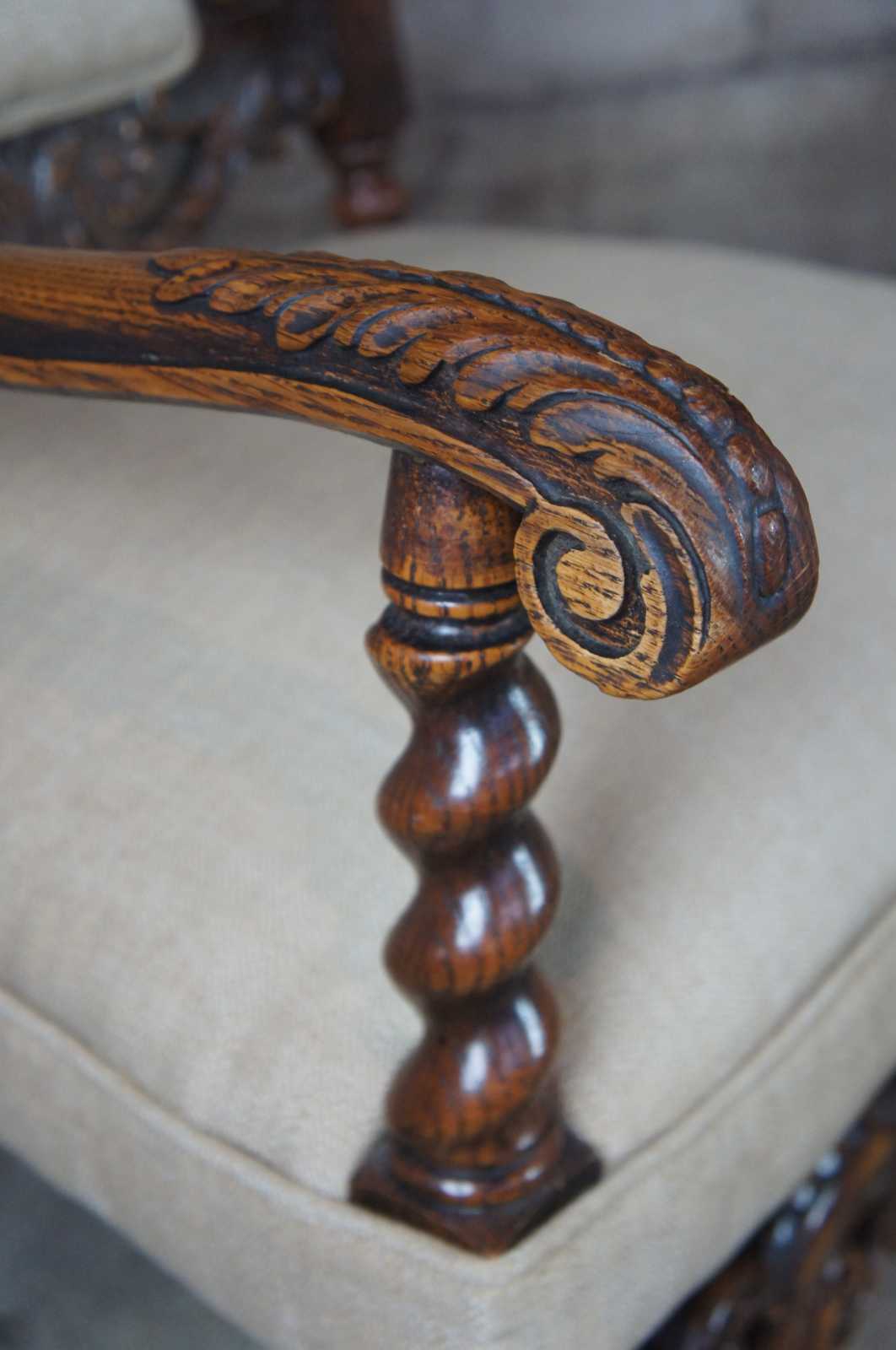 Two 19th century French Renaissance Revival arm chairs. Made from oak with heavily carved front and back. Features acanthus and barley twist design as well as two figural birds along the top of the back.