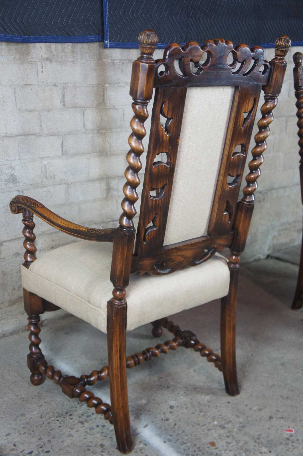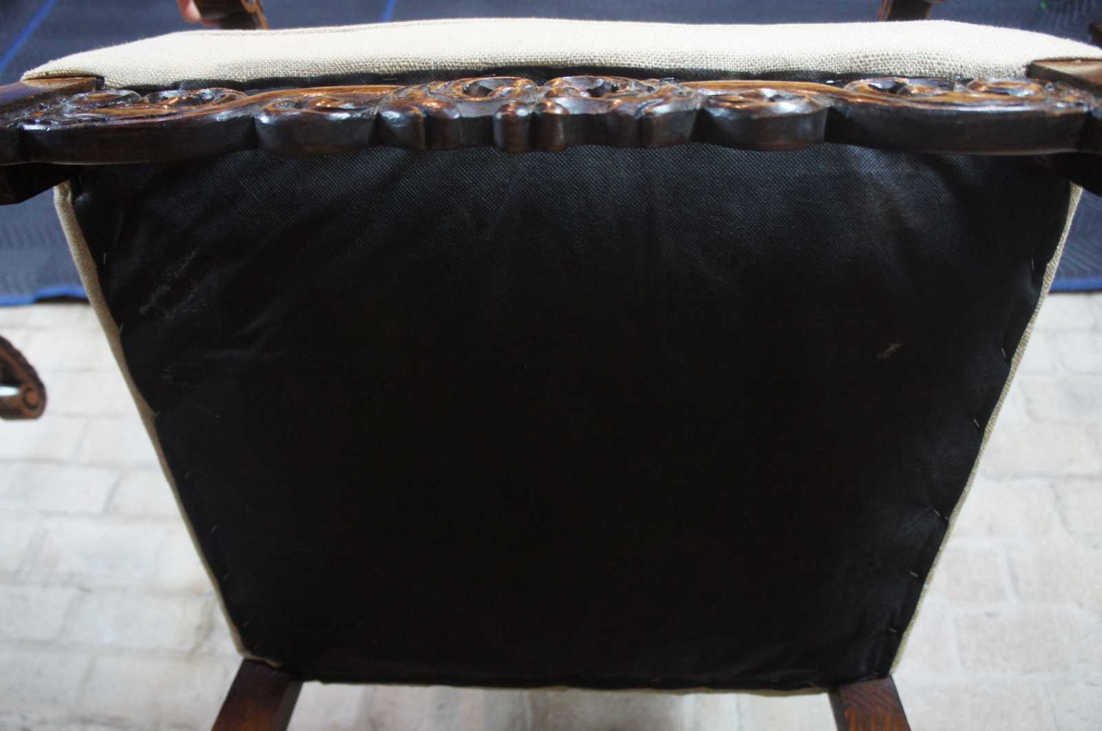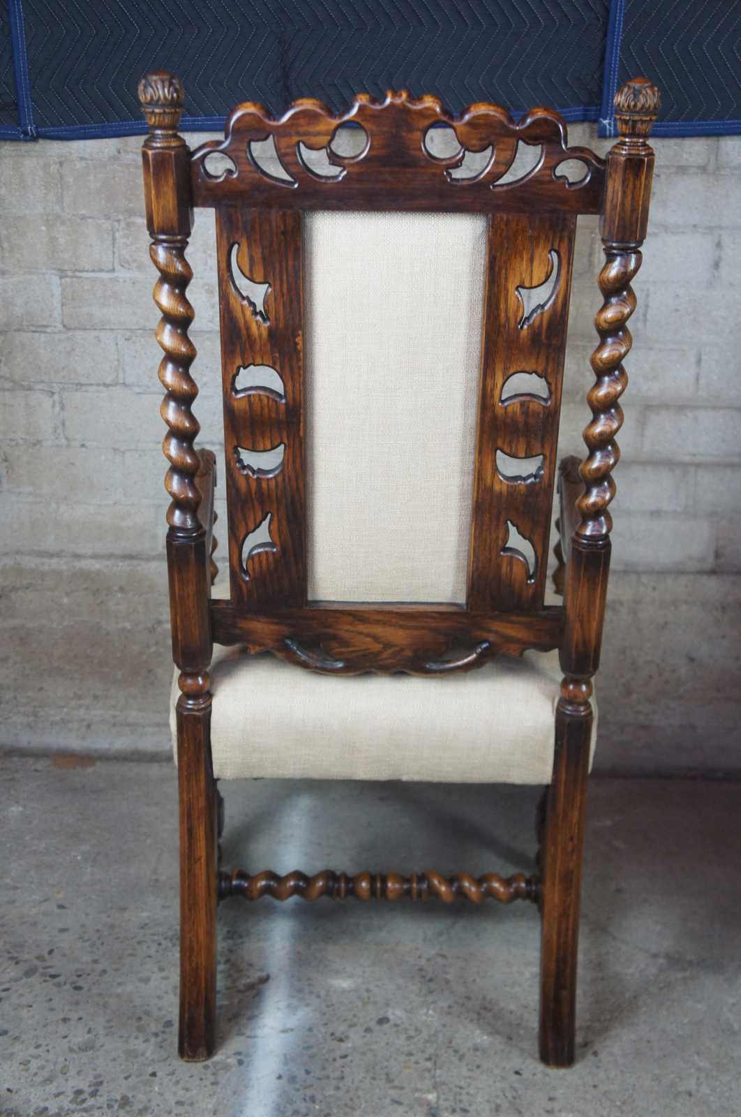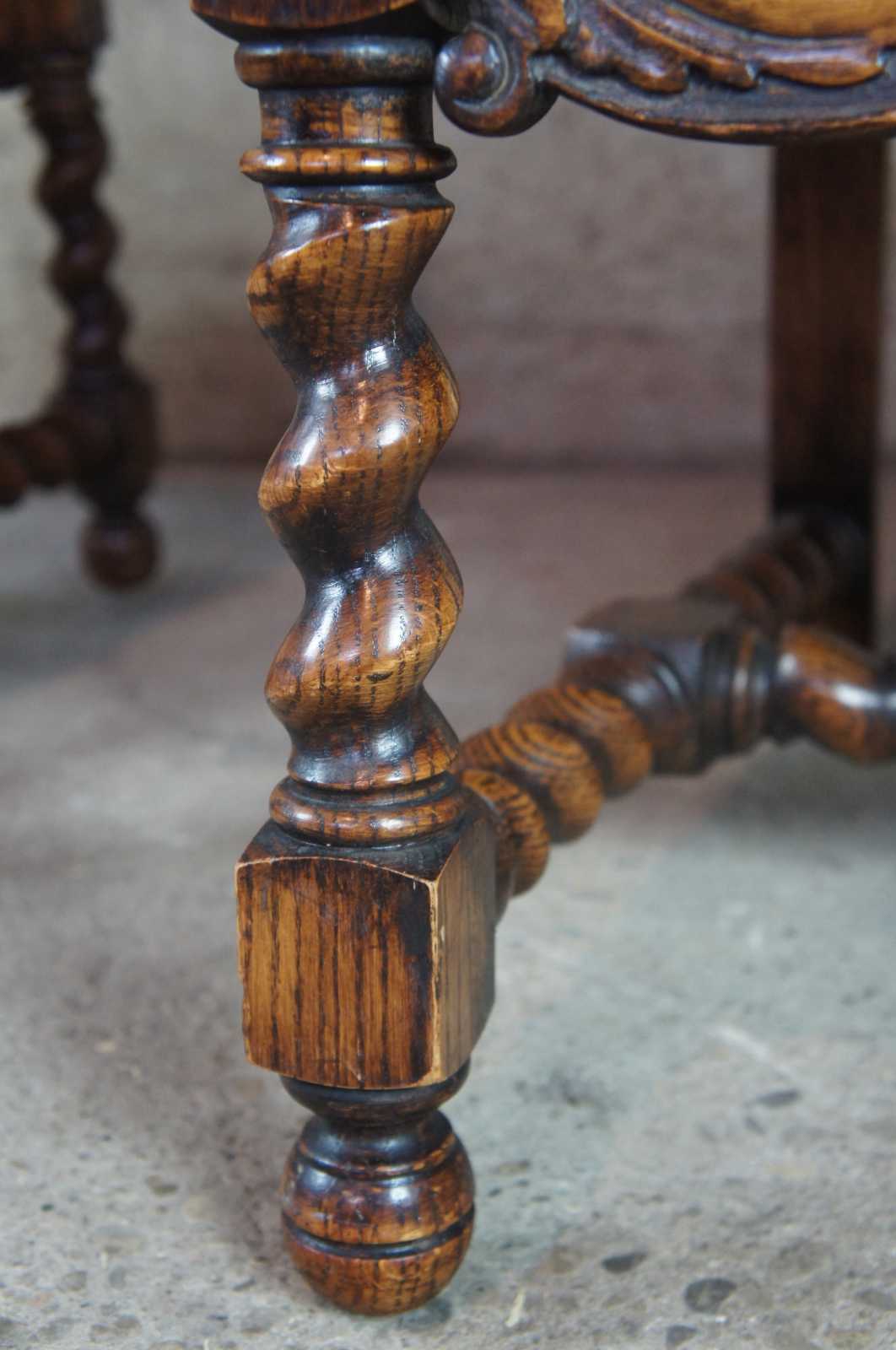 Two 19th century French Renaissance Revival arm chairs. Made from oak with heavily carved front and back. Features acanthus and barley twist design as well as two figural birds along the top of the back.