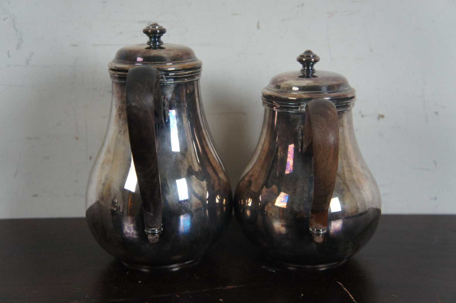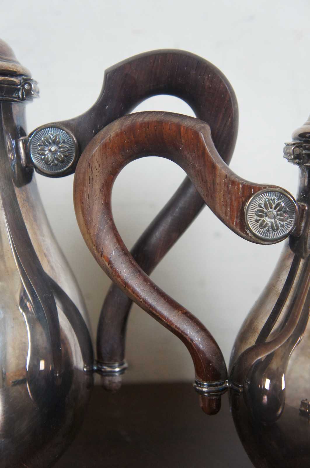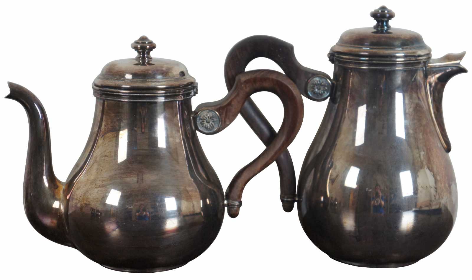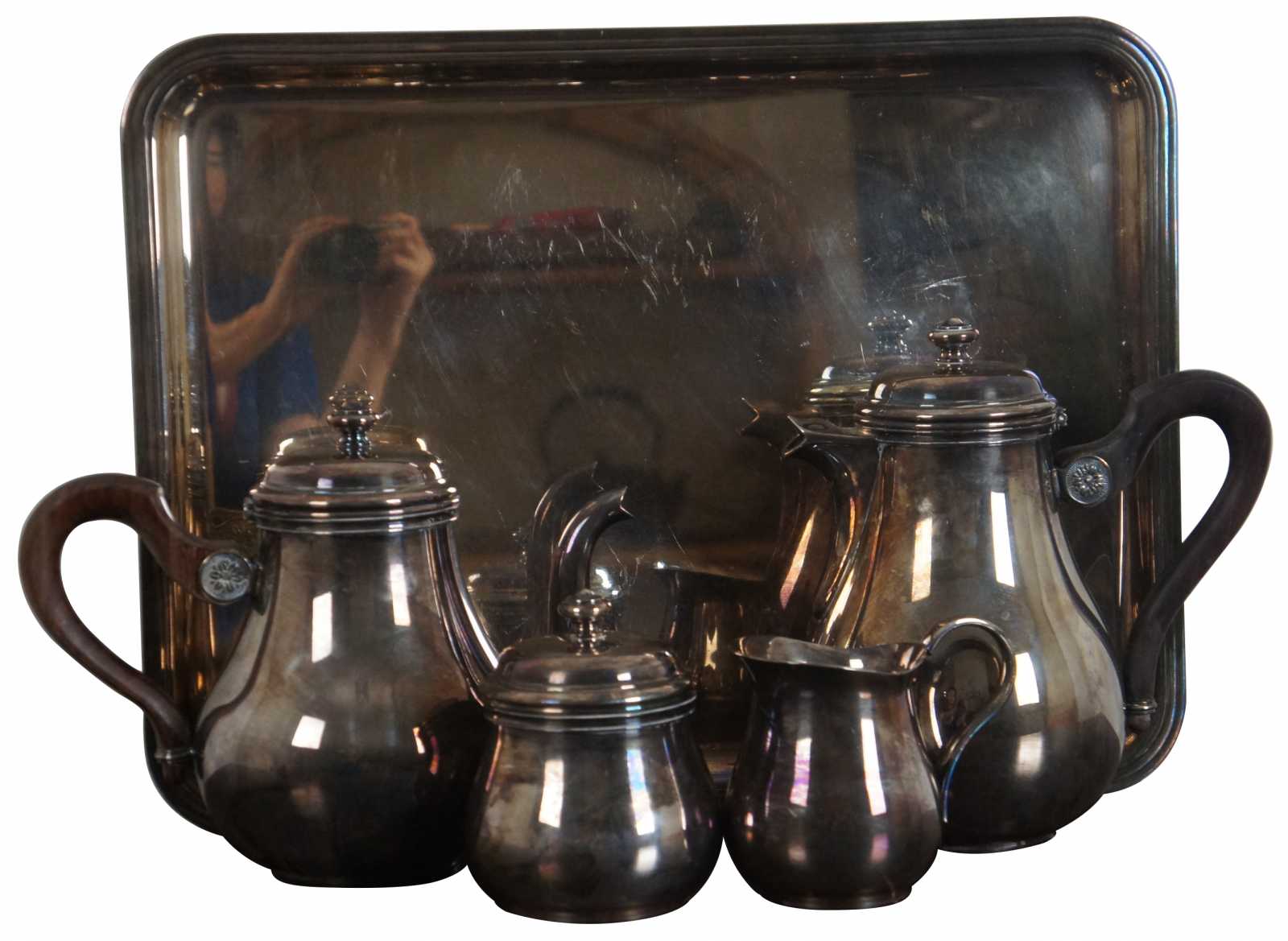 5 piece Christofle Bagatelle silverplated hollowware coffee & tea set. Features traditional french styling with Rosewood handles. Includes tea pot, coffee pot, cream & sugar, and tray. Discontinued.