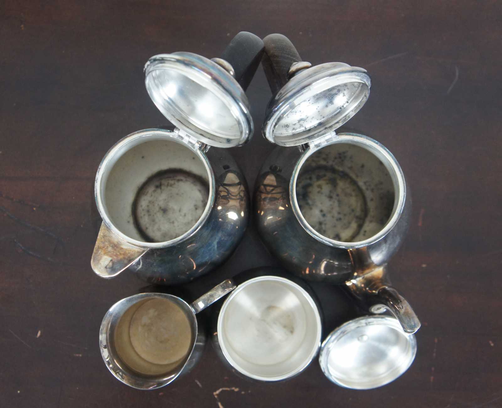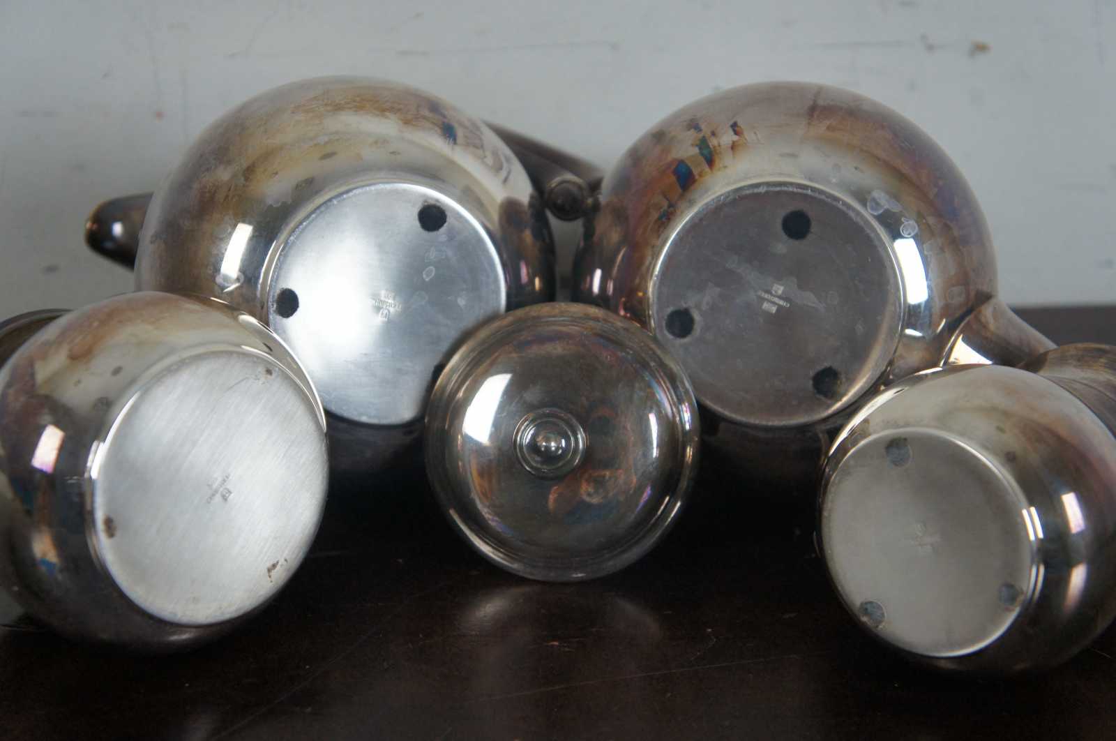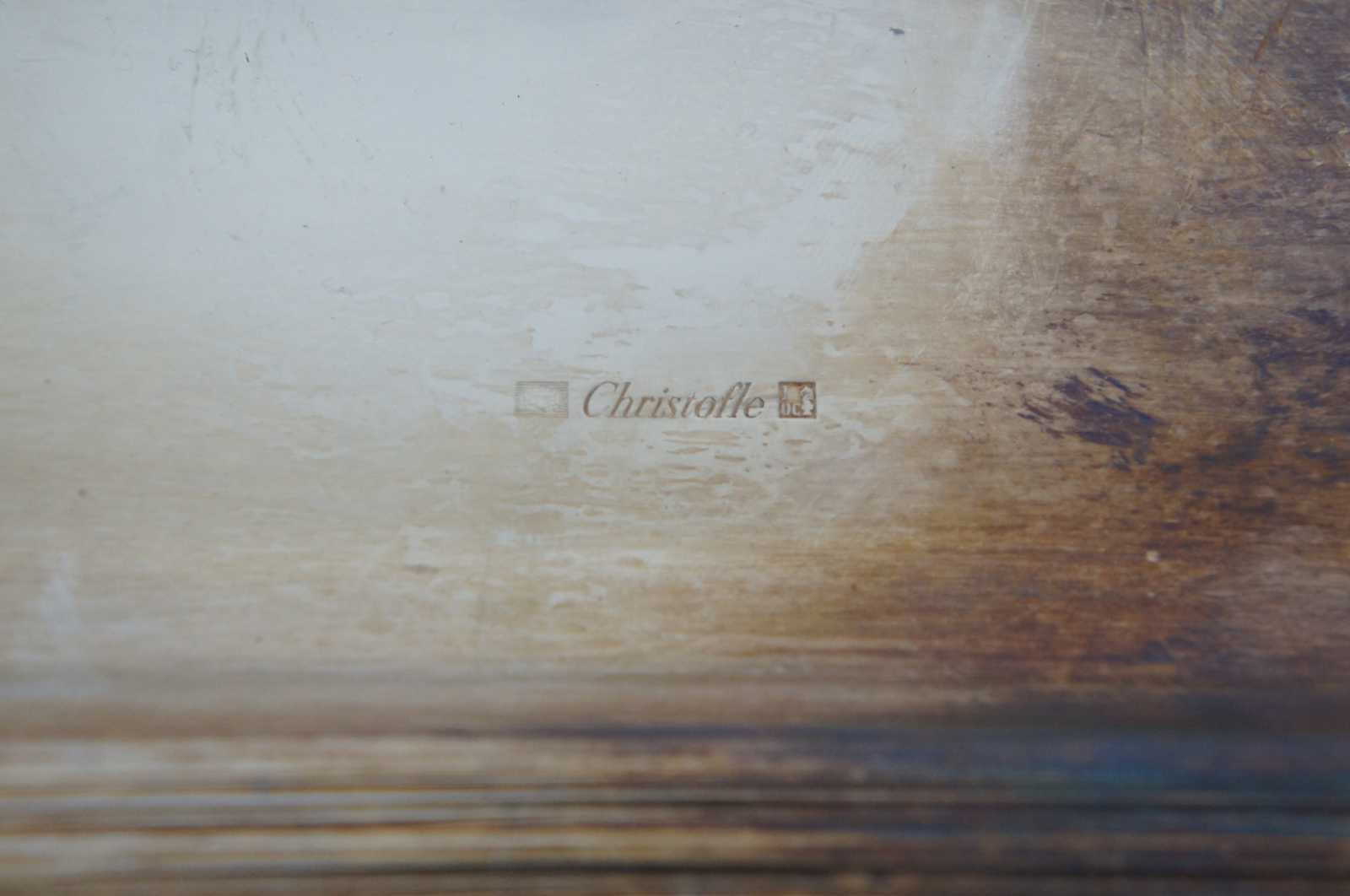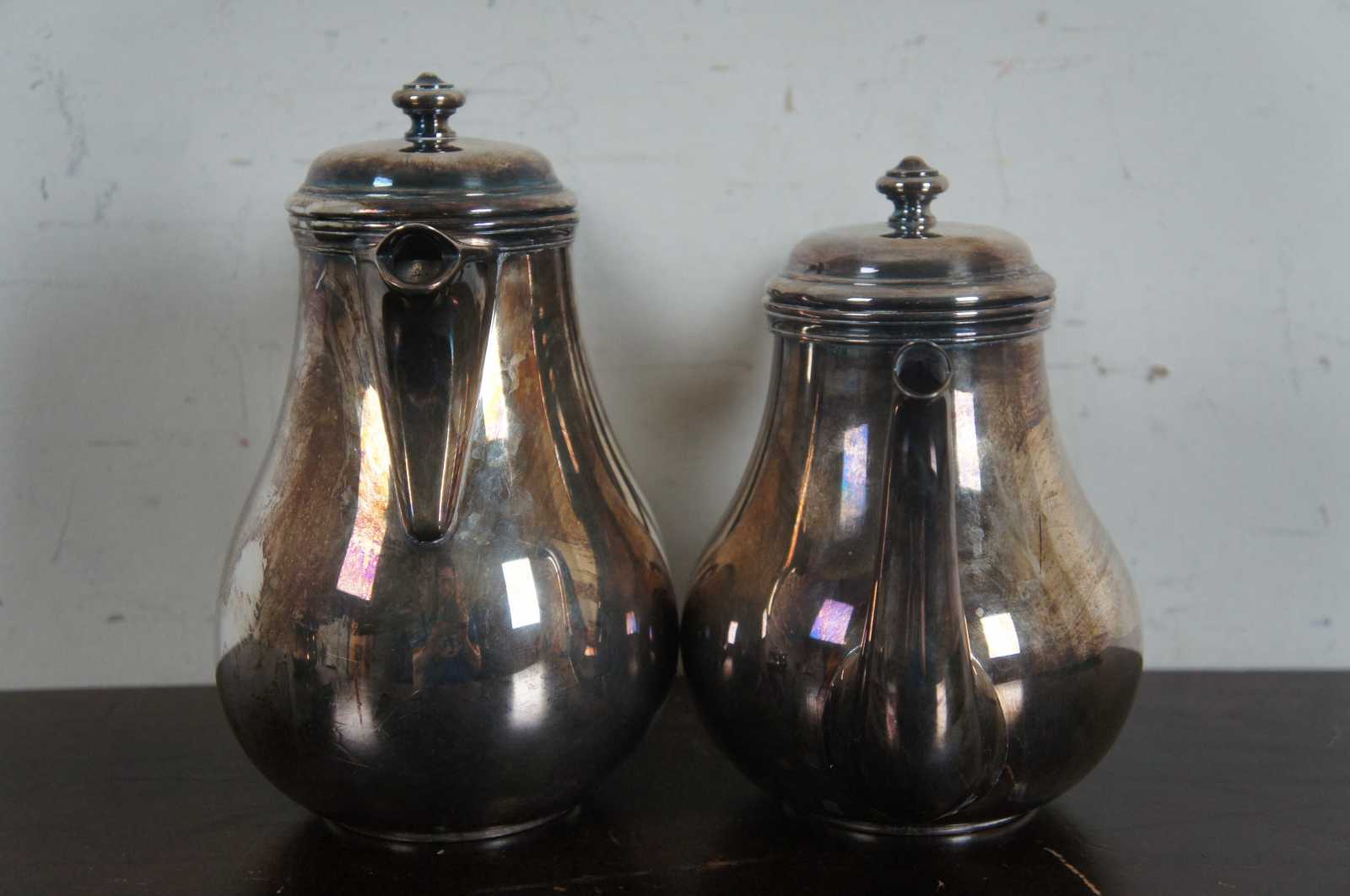 5 piece Christofle Bagatelle silverplated hollowware coffee & tea set. Features traditional french styling with Rosewood handles. Includes tea pot, coffee pot, cream & sugar, and tray. Discontinued.