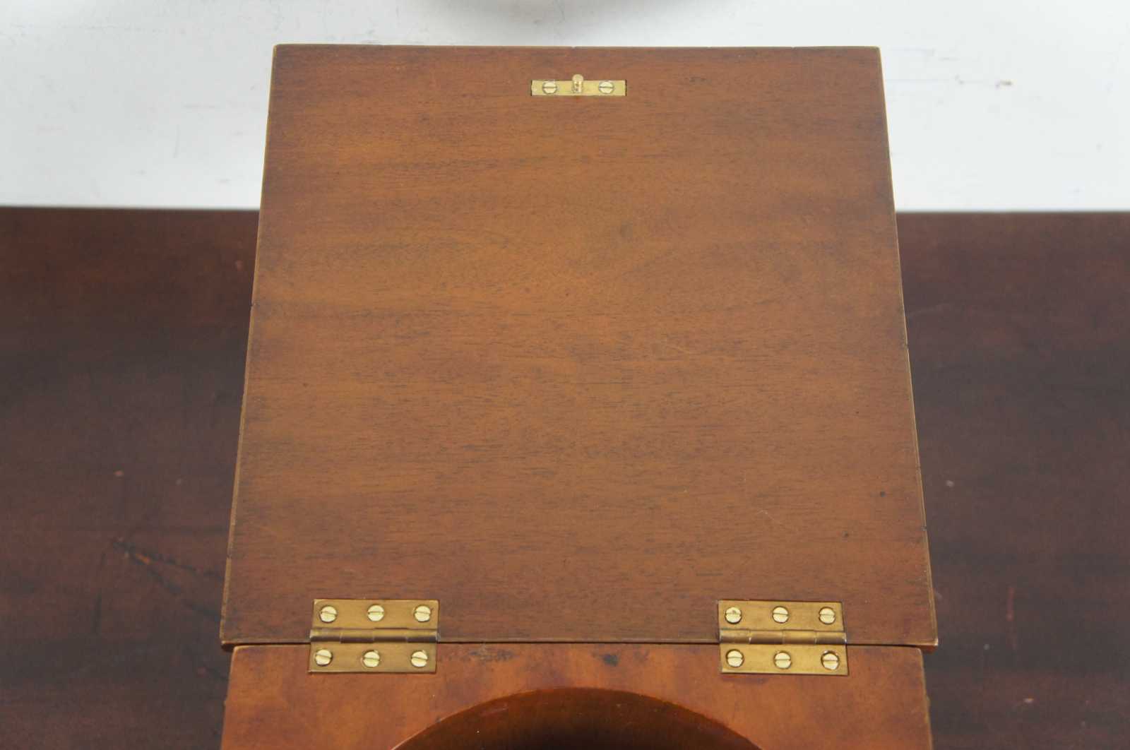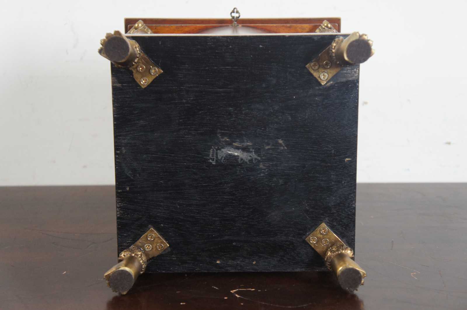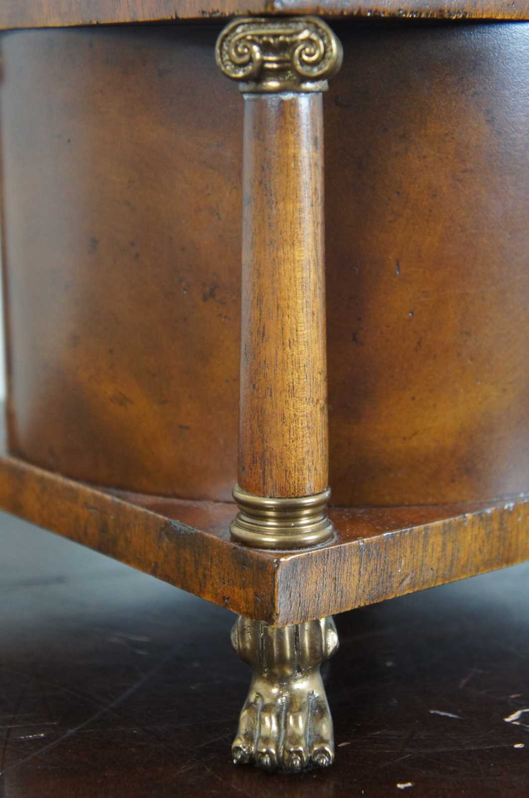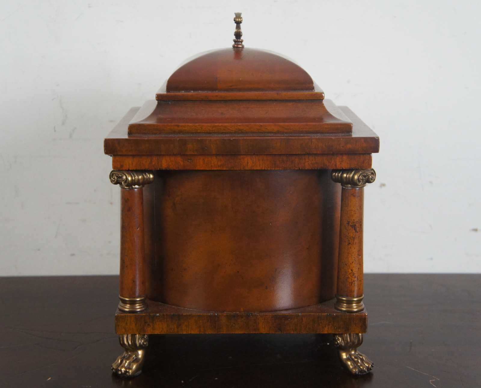 Rotunda shaped lidded box by Maitland Smith. Made from mahogany with brass mounts and paw feet. Features a cylidrical center supported by four columns. Great for use as a tea caddy, cigar humidor, jewelry chest or trinket storage box. Includes handle and lock & key.