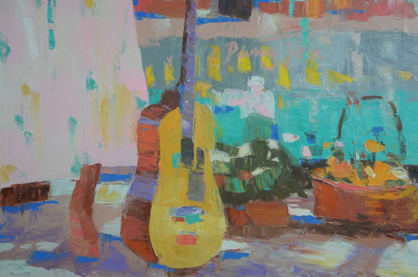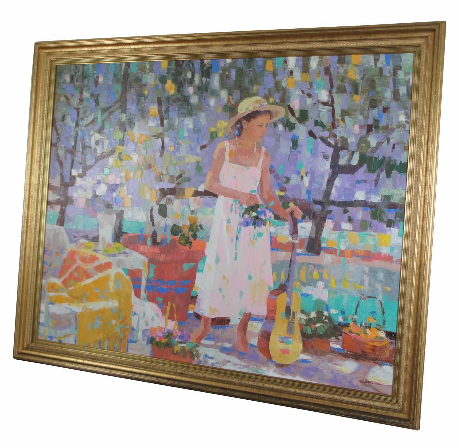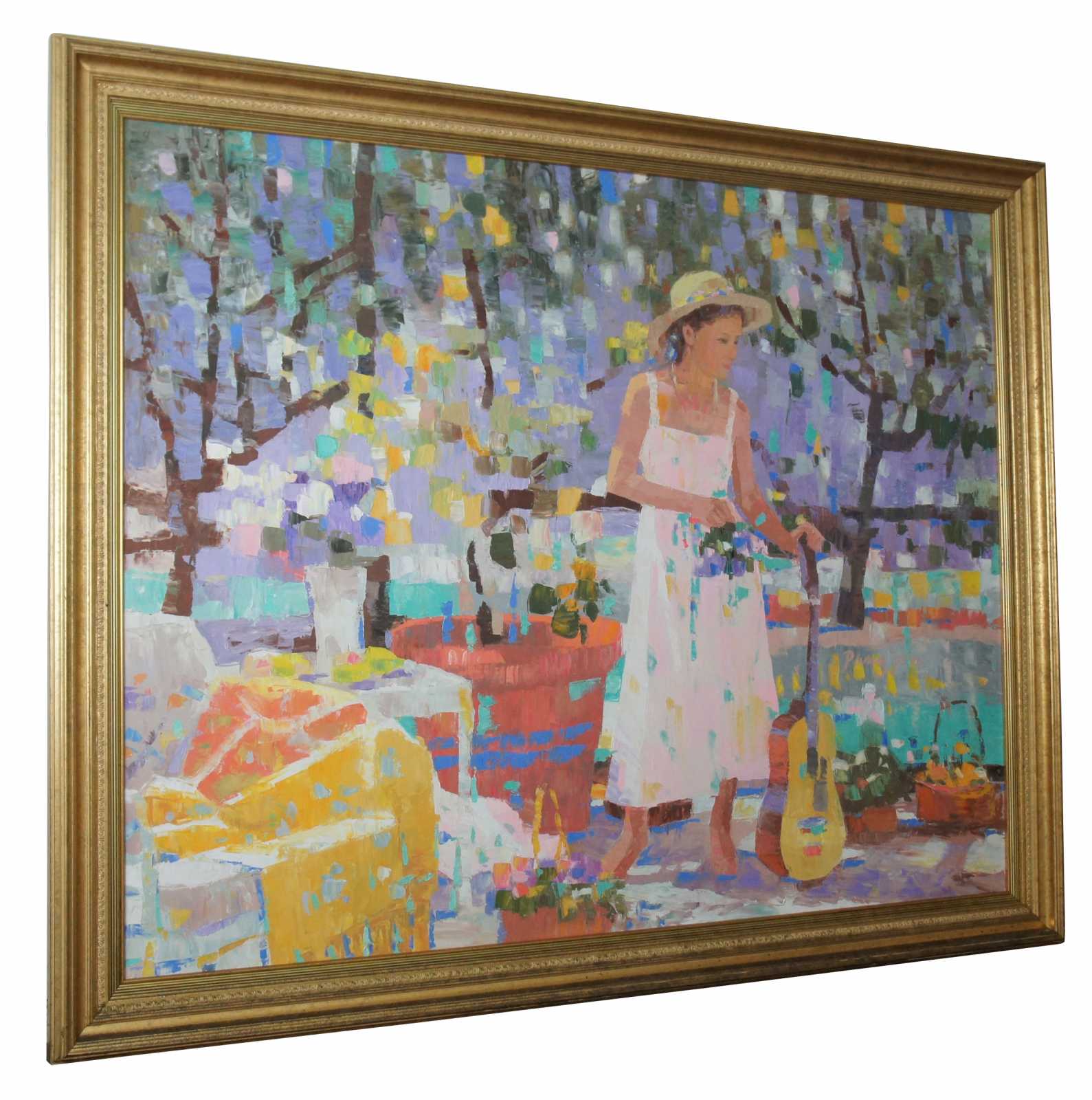Pang Jen (Pong Zhen, Peng Jen) late 20th century original oil on canvas. Features a girl with a guitar on a patio overlooking a garden landscape.