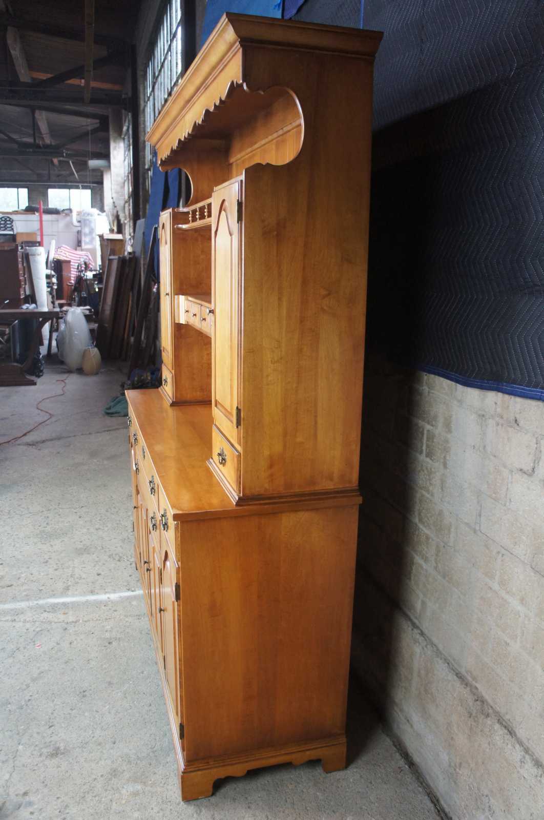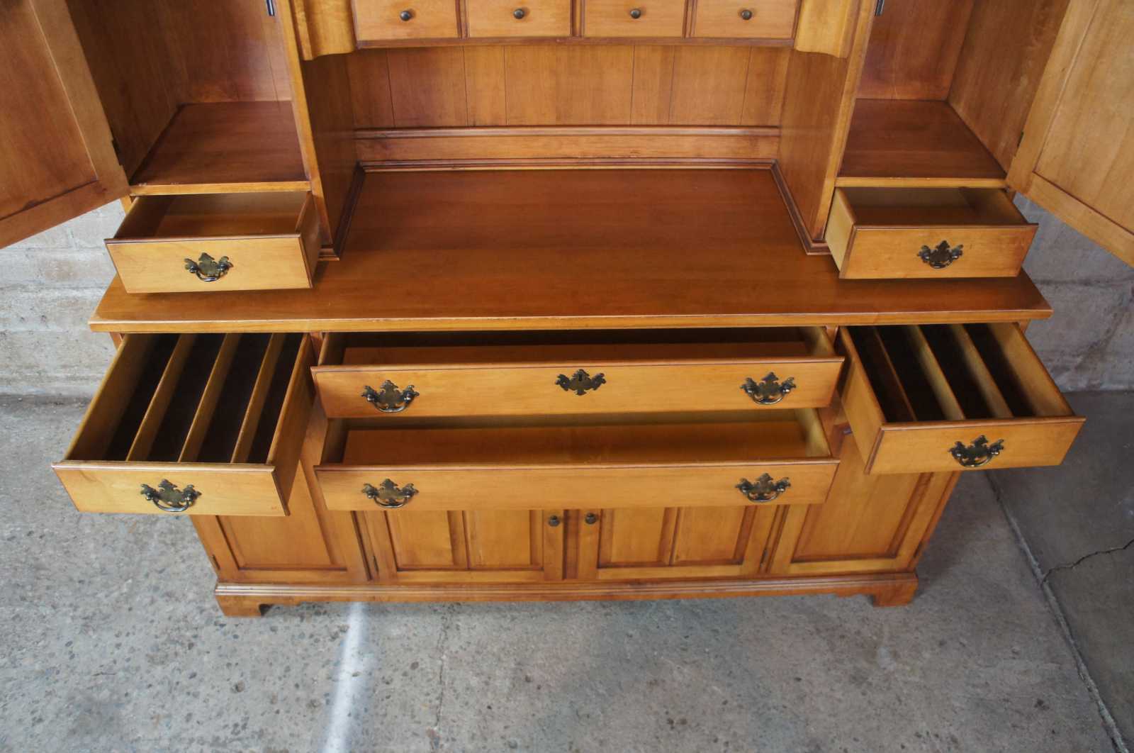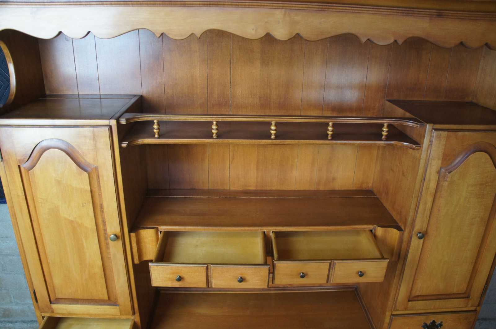 Circa 1970s maple china hutch. Features four cabinets, ten drawers, plate grooves and brass hardware. Originally purchased from The Rike-Kumler Co in Dayton, Ohio. Rikes was one of the largest departments stores when it opened, remaining in business until they were bough out by Lazarus. Marked along back.