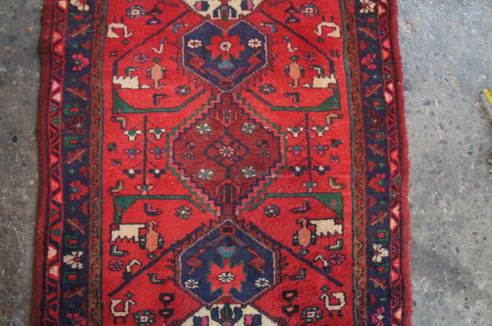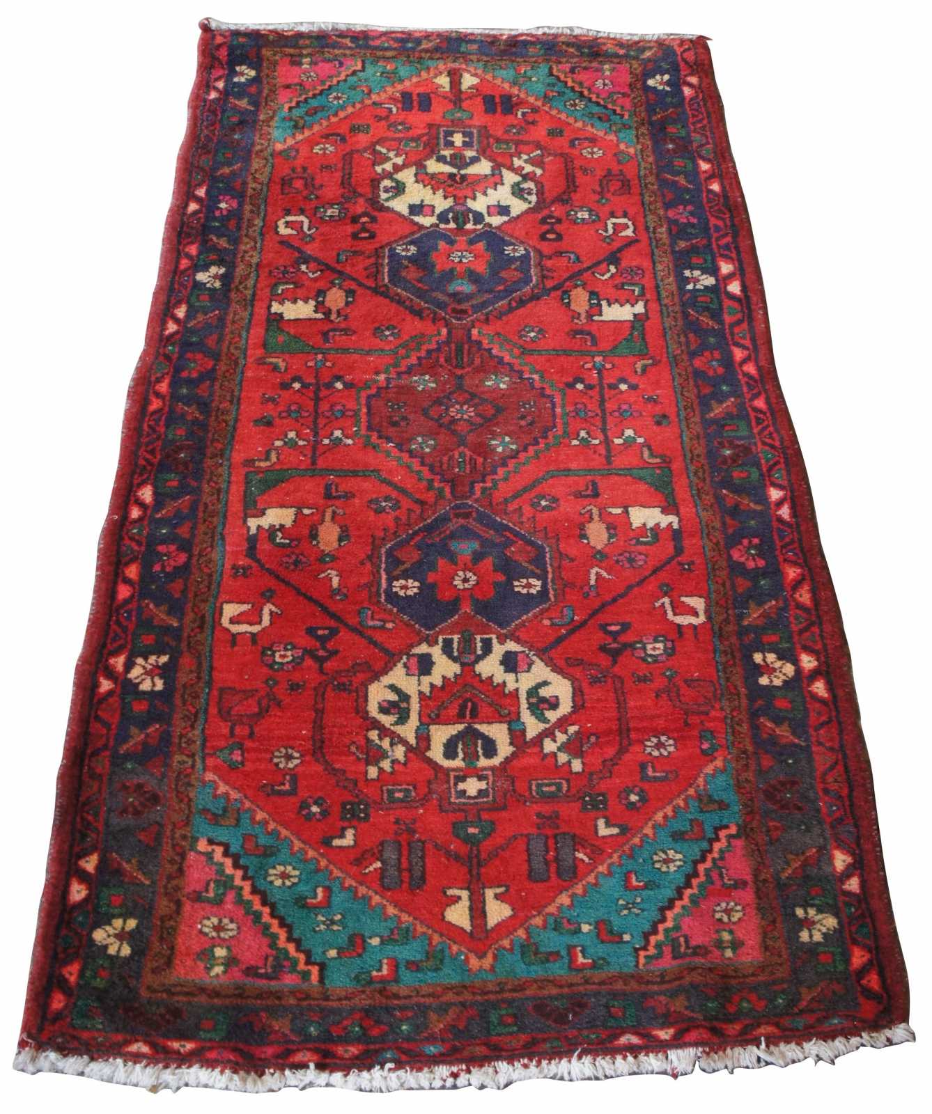 Vintage Saveh runner hand made in Iran with animal and geometric patterns. Cotton and wool pile. Features a field of red with purple, pink, blue, tan, green, orange and teal accents.