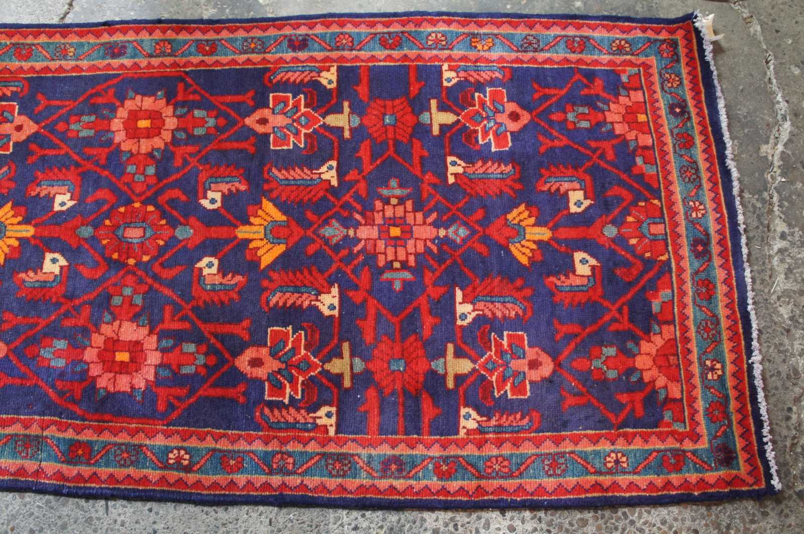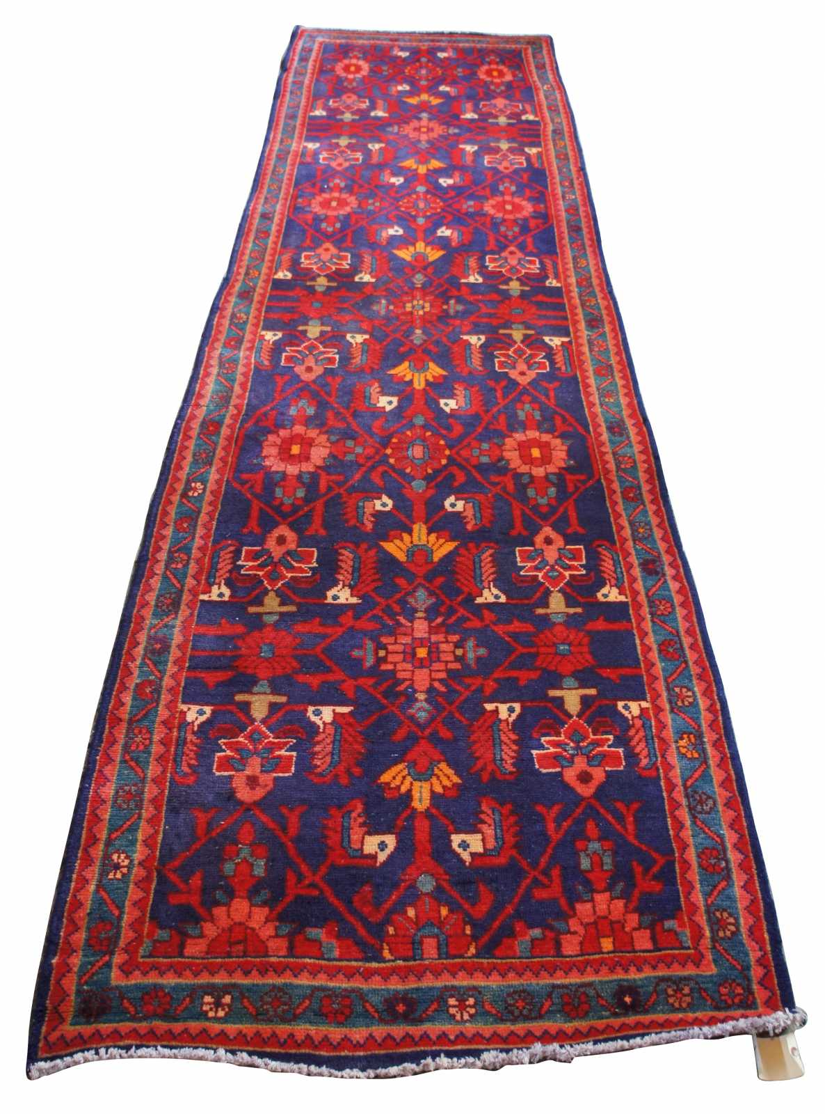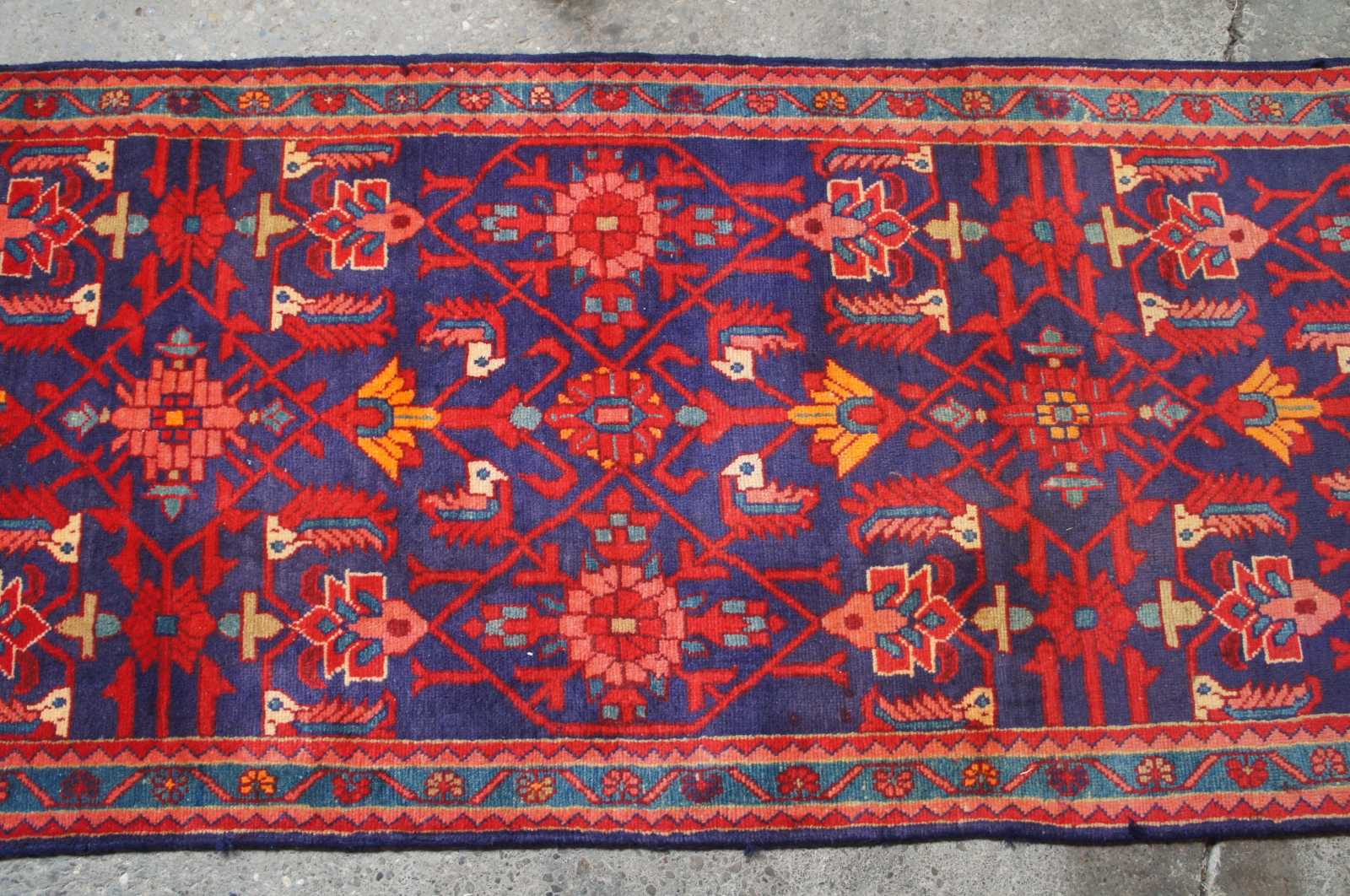 Vintage Saveh rug runner hand made in Iran with geometric patterns. Cotton pile. Features a field of violet / blue with reds, pinks, tans, yellow/orange, and teal accents.