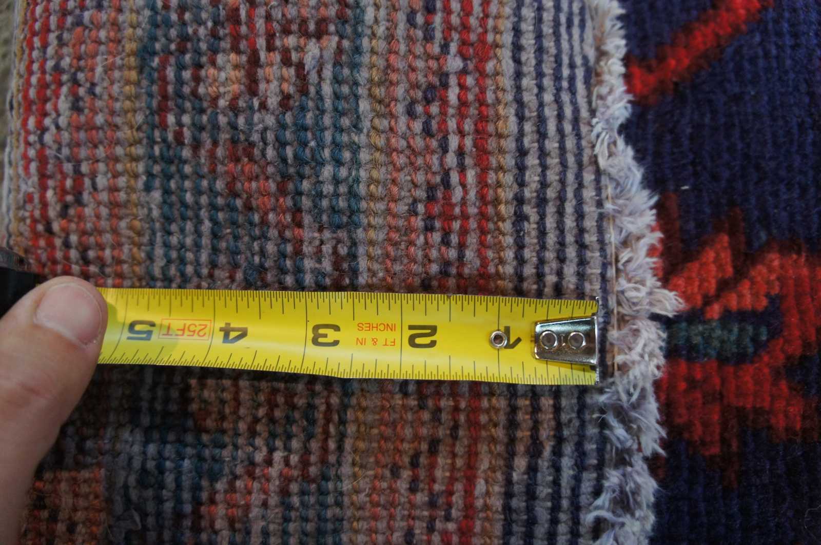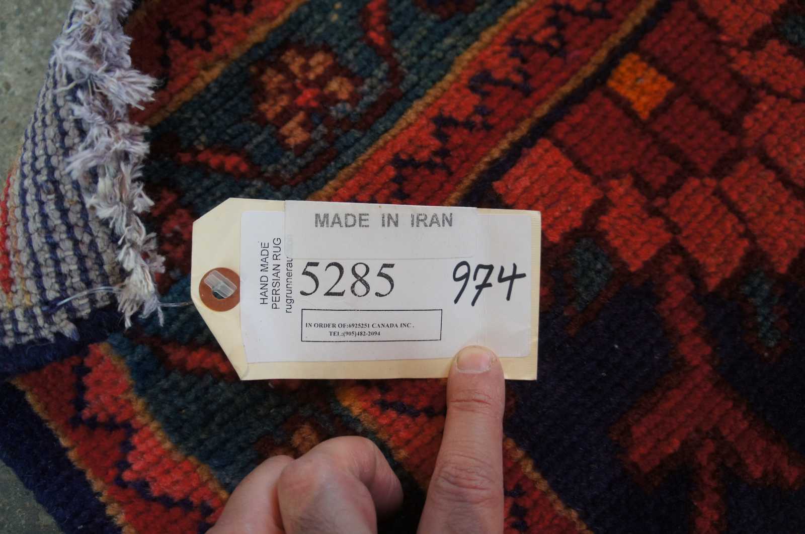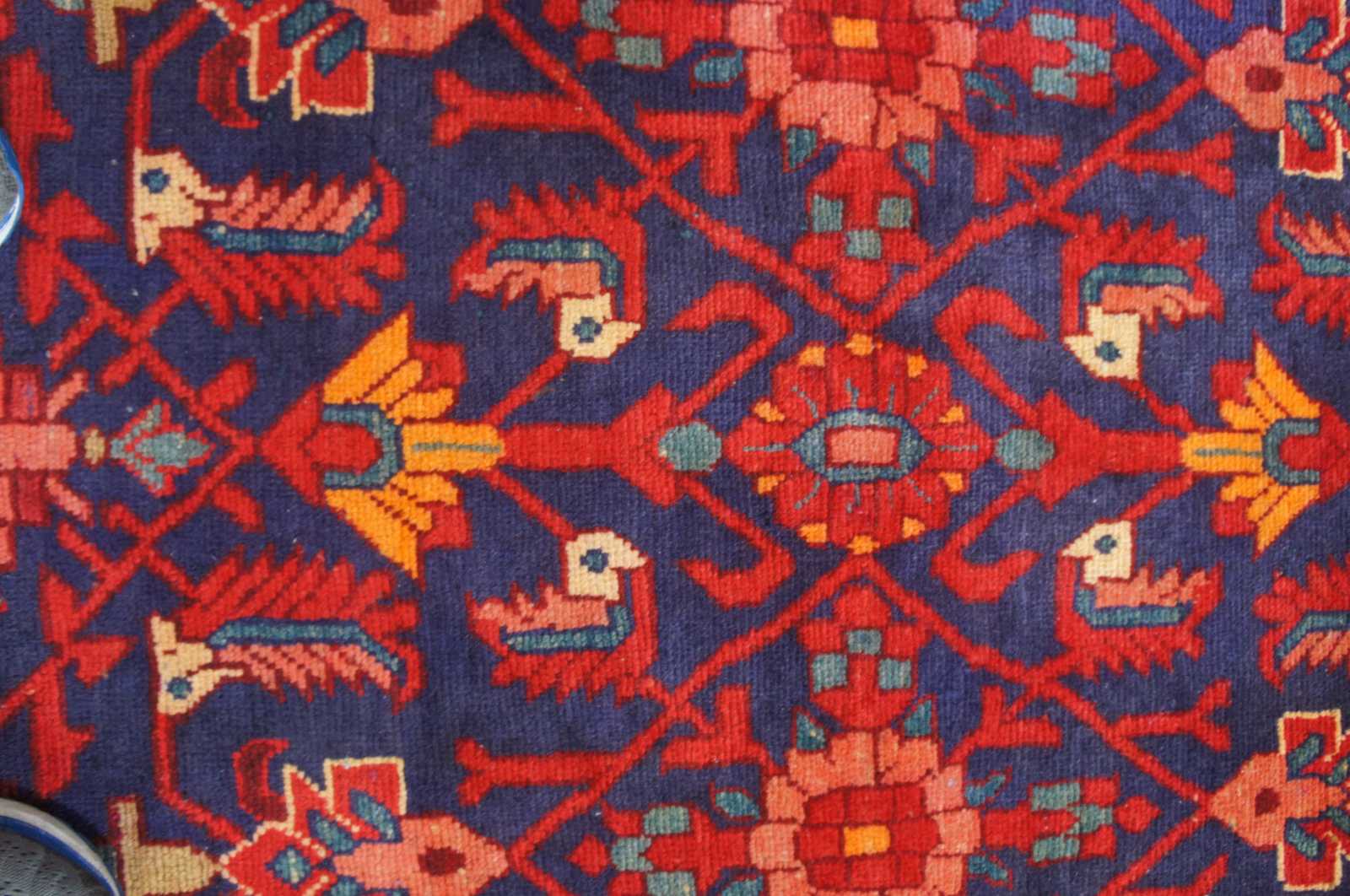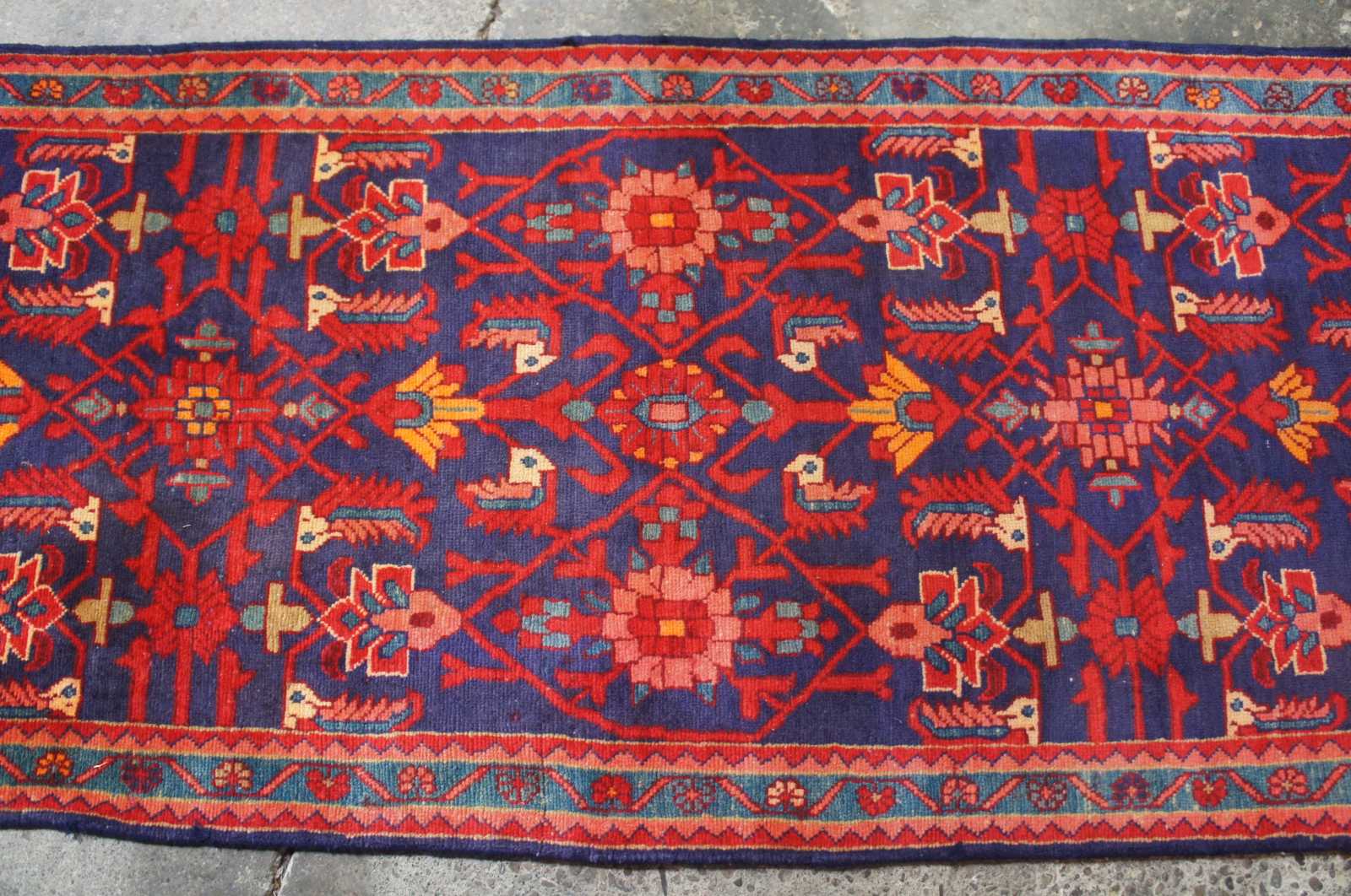 Vintage Saveh rug runner hand made in Iran with geometric patterns. Cotton pile. Features a field of violet / blue with reds, pinks, tans, yellow/orange, and teal accents.