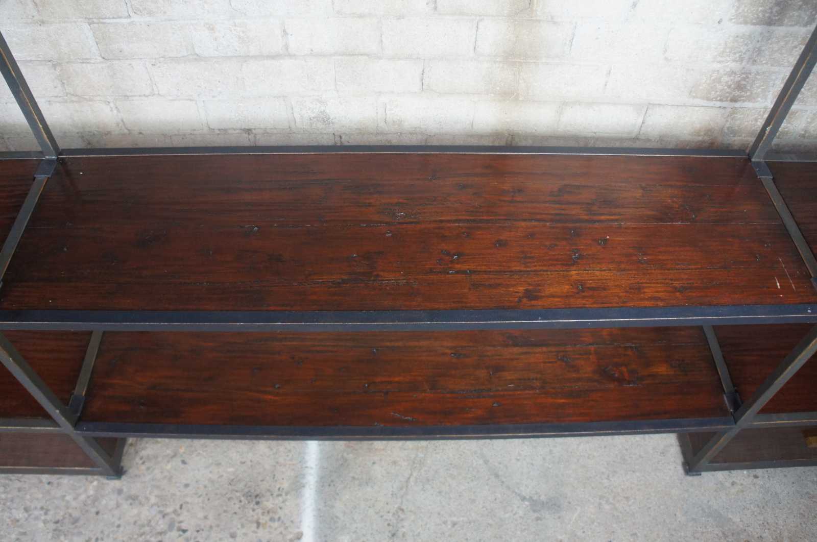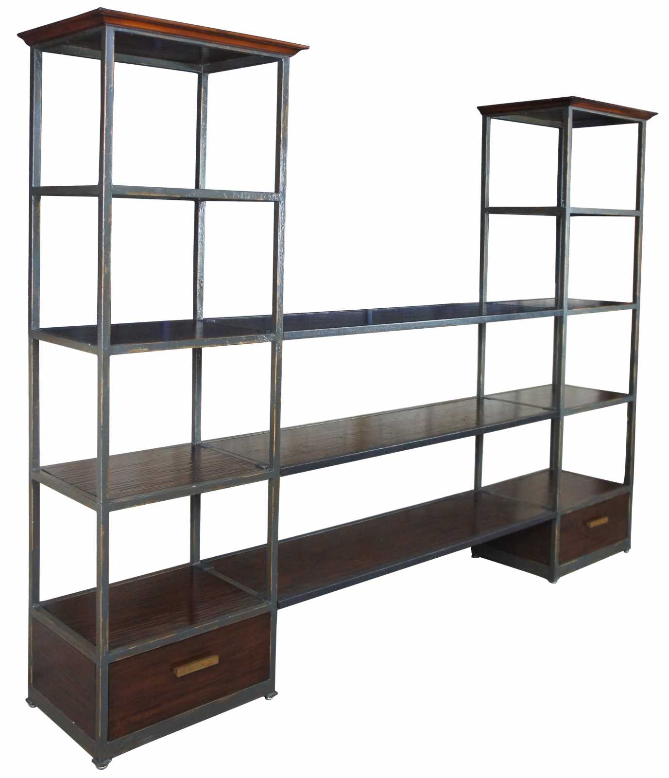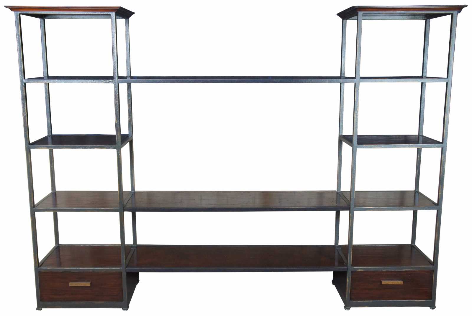Henredon entertainment Etagere, TV console, bookcase or center credenza. Features four shelves flanking three modular center shelves. Aged iron finished hardware over lacquered wood and elegantly distressed mahogany shelves.