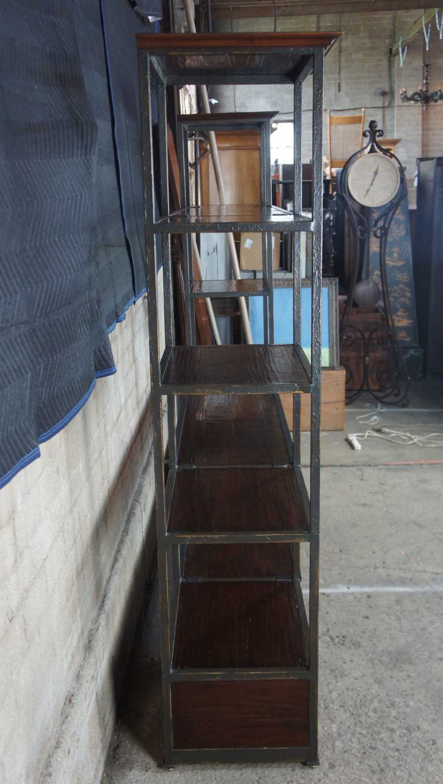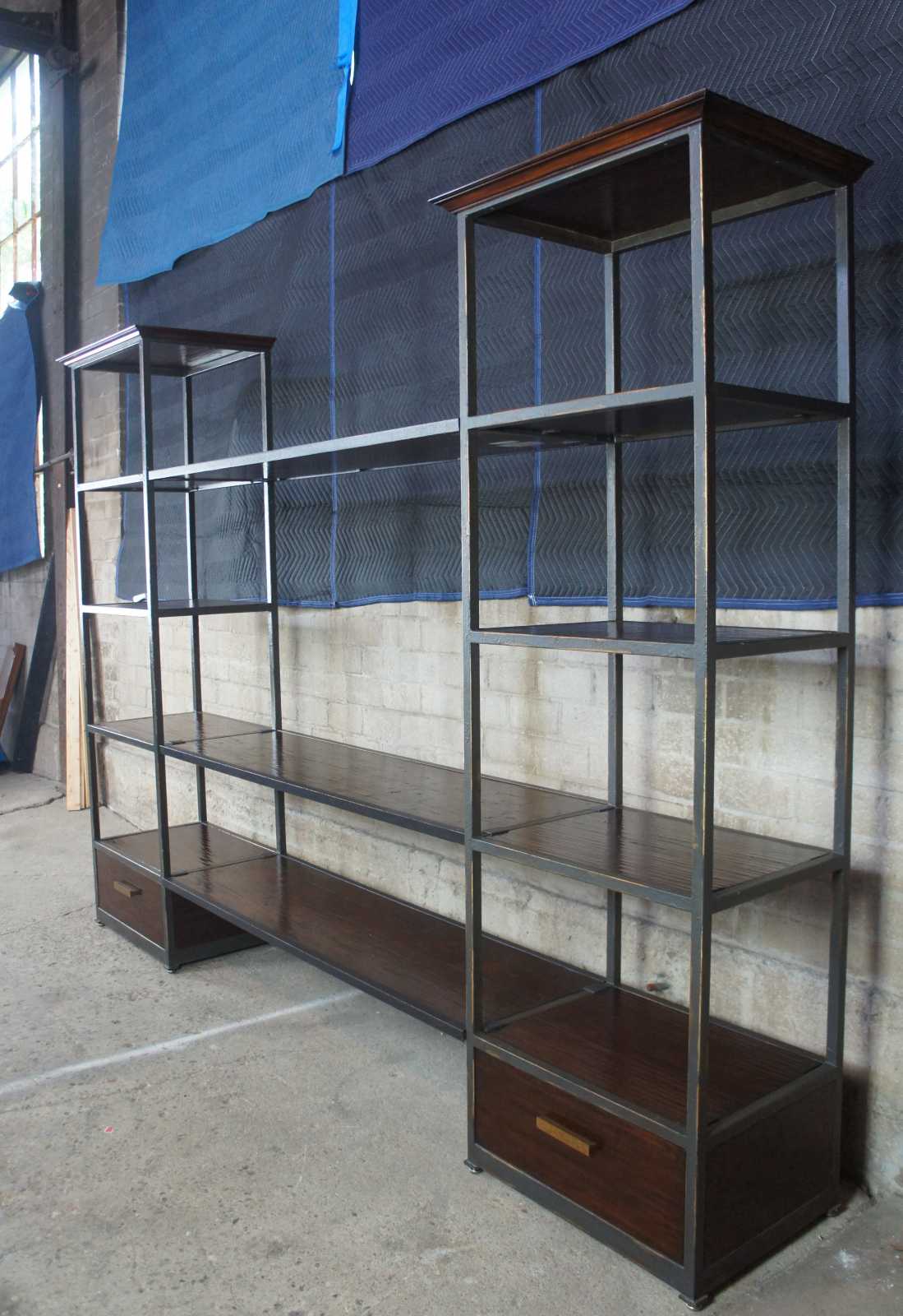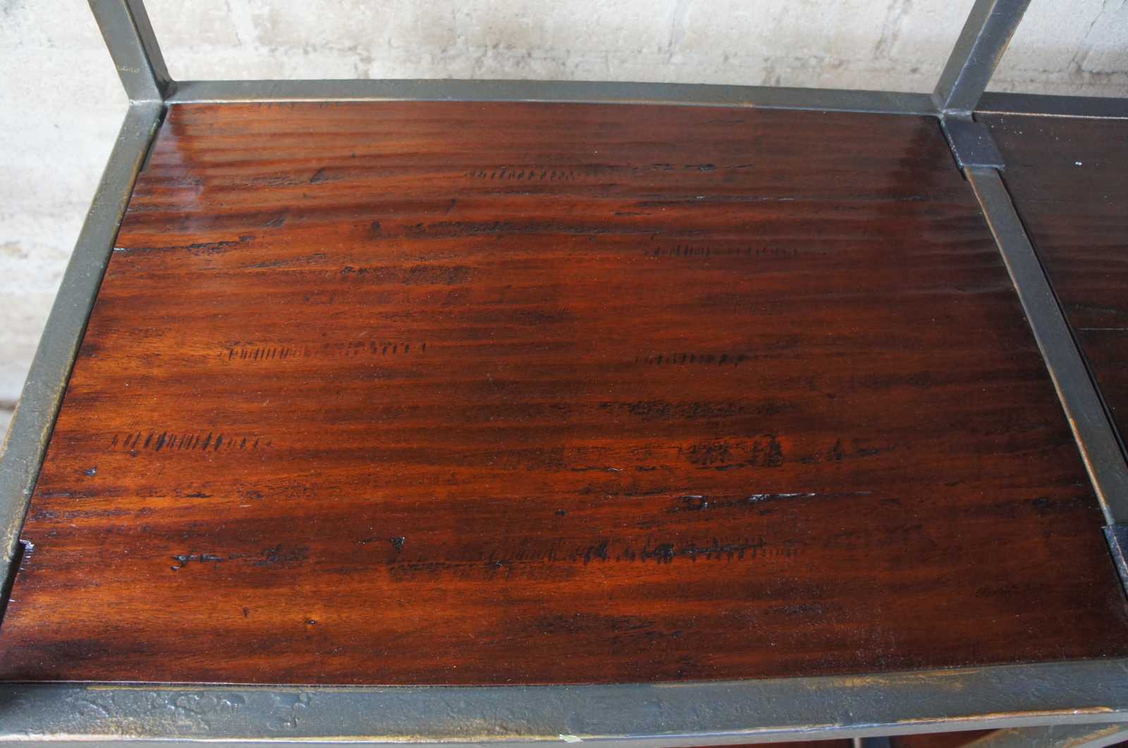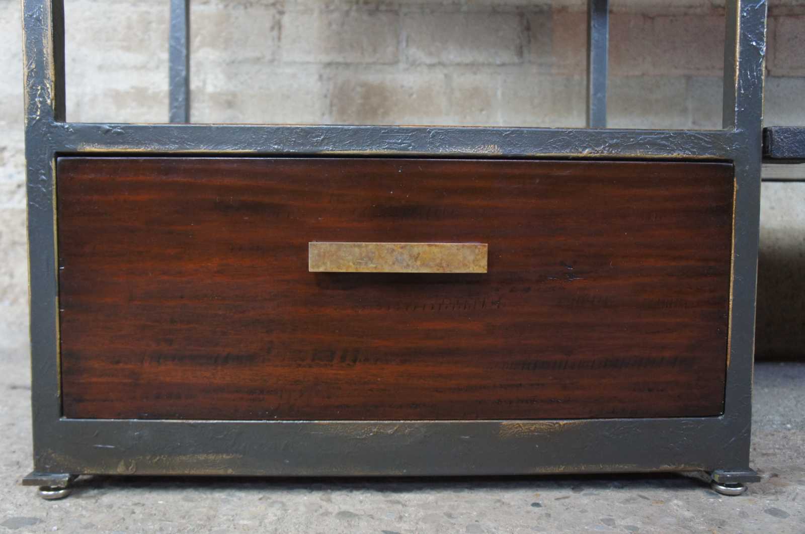Henredon entertainment Etagere, TV console, bookcase or center credenza. Features four shelves flanking three modular center shelves. Aged iron finished hardware over lacquered wood and elegantly distressed mahogany shelves.