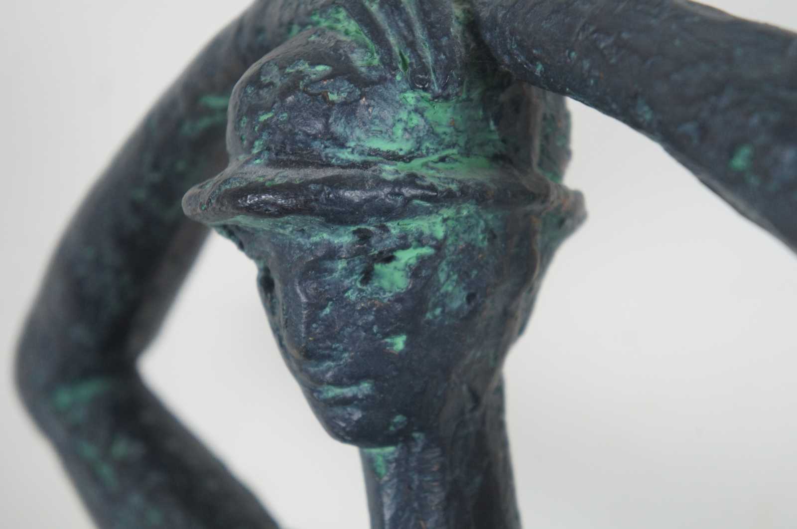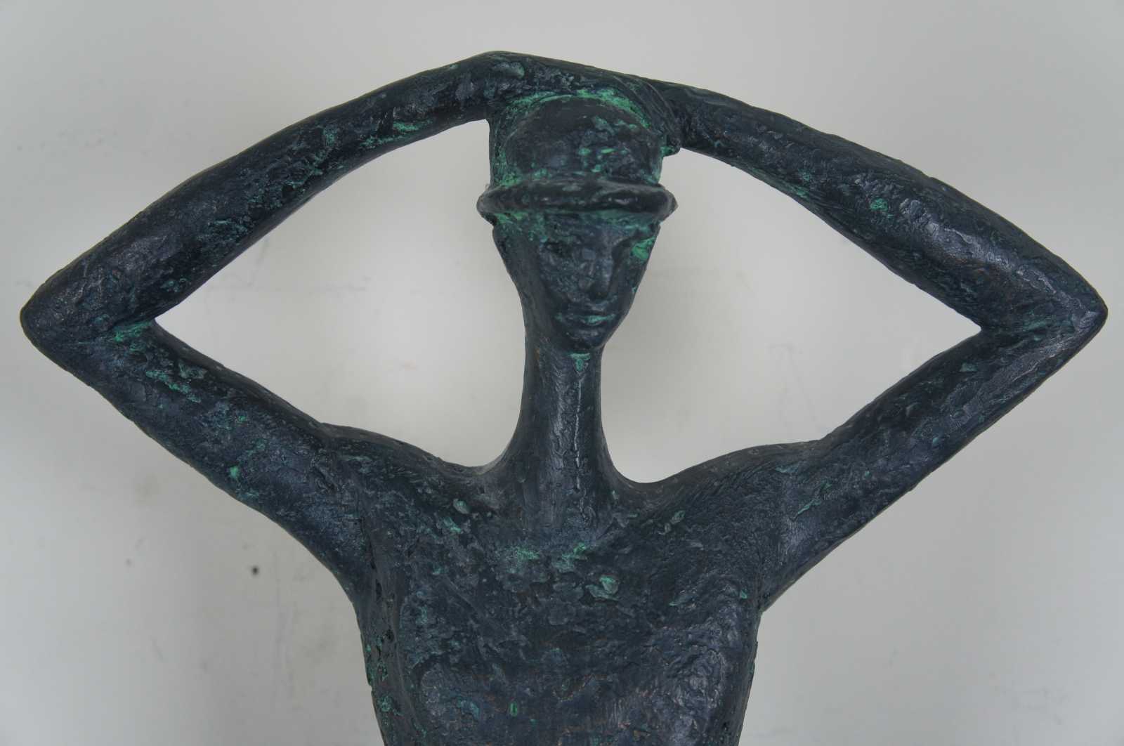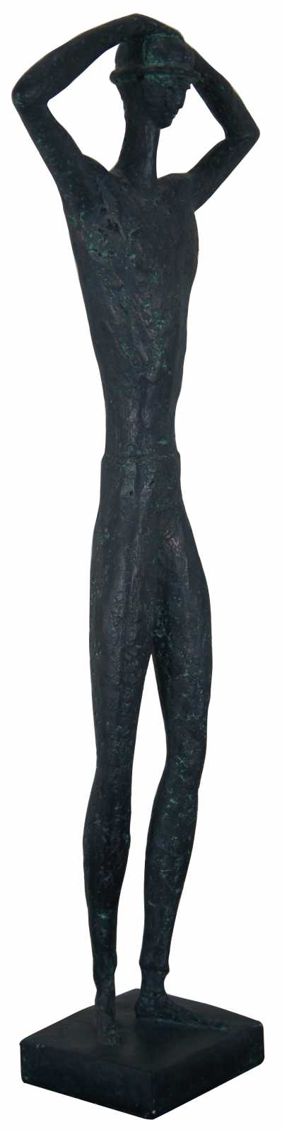 A large mid century modern Austin Productions plaster sculpture after Franc (Dorothy) Epping (American, born 1910). Piece is titled, Man with Hat. It depicts a tall, thin man wearing a hat with his hands resting on his head and is finished in a patinated bronze effect. The sculpture is signed in cast “Epping” and inscribed “Austin Prod Inc 1962” to the base.