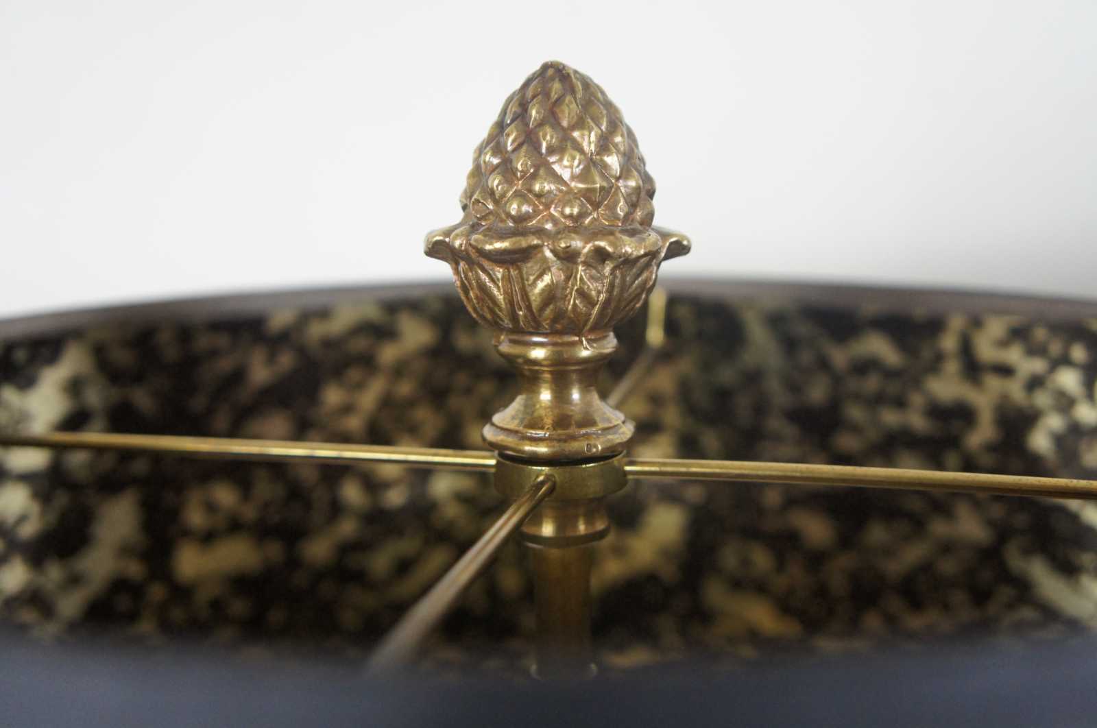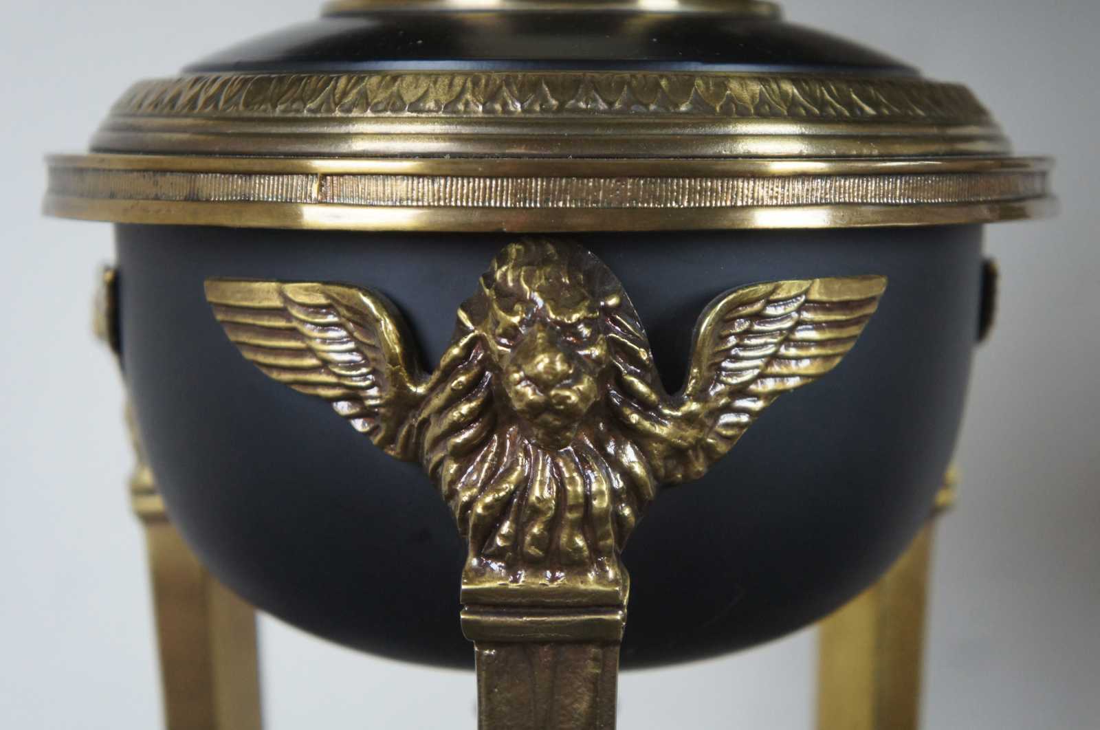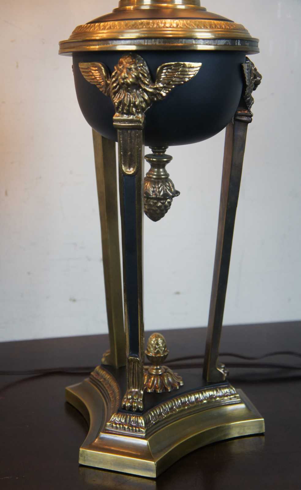 Curated by Brendan Bass and designed by Chapman Manufacturing company, this table lamp is handcrafted from antique brass with an assortment of stunning details, such as the fine lion / griffon heads encircling the perimeter. Its trophy-like shape makes a regal statement that would suit any lush traditional décor. Antique solid brass table lamp with black coloration. Handcrafted detail of brass lions. Trophy design edges. Parchment shade with gold tortoise interior. Pineapple pendant below the socket is the dimable switch.