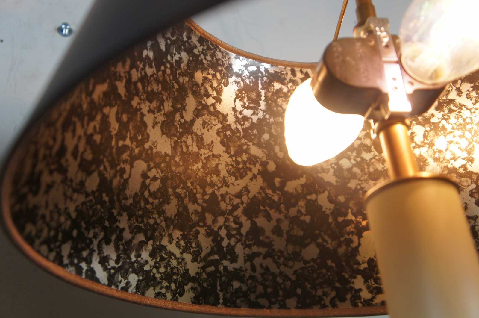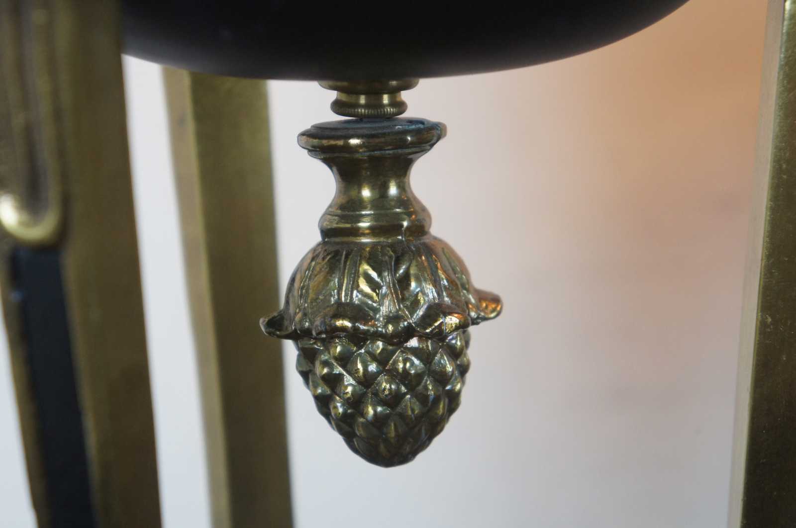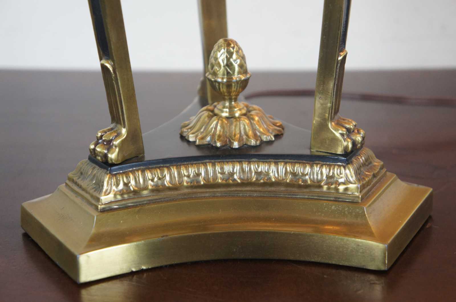 Curated by Brendan Bass and designed by Chapman Manufacturing company, this table lamp is handcrafted from antique brass with an assortment of stunning details, such as the fine lion / griffon heads encircling the perimeter. Its trophy-like shape makes a regal statement that would suit any lush traditional décor. Antique solid brass table lamp with black coloration. Handcrafted detail of brass lions. Trophy design edges. Parchment shade with gold tortoise interior. Pineapple pendant below the socket is the dimable switch.