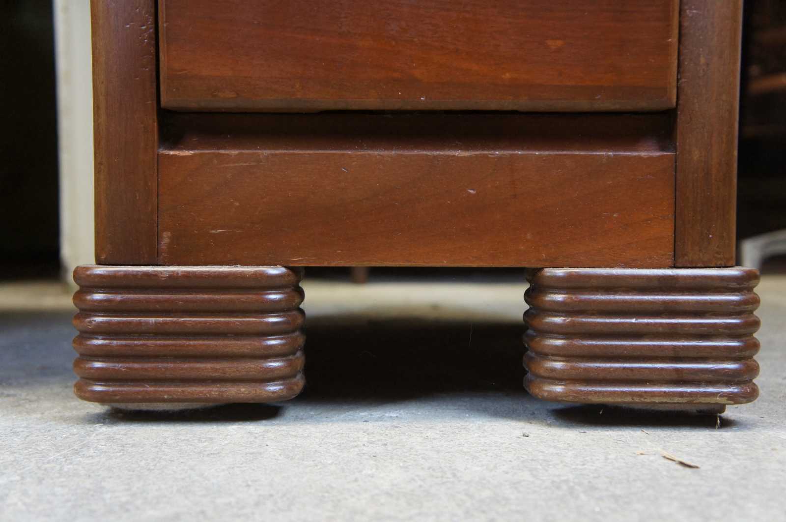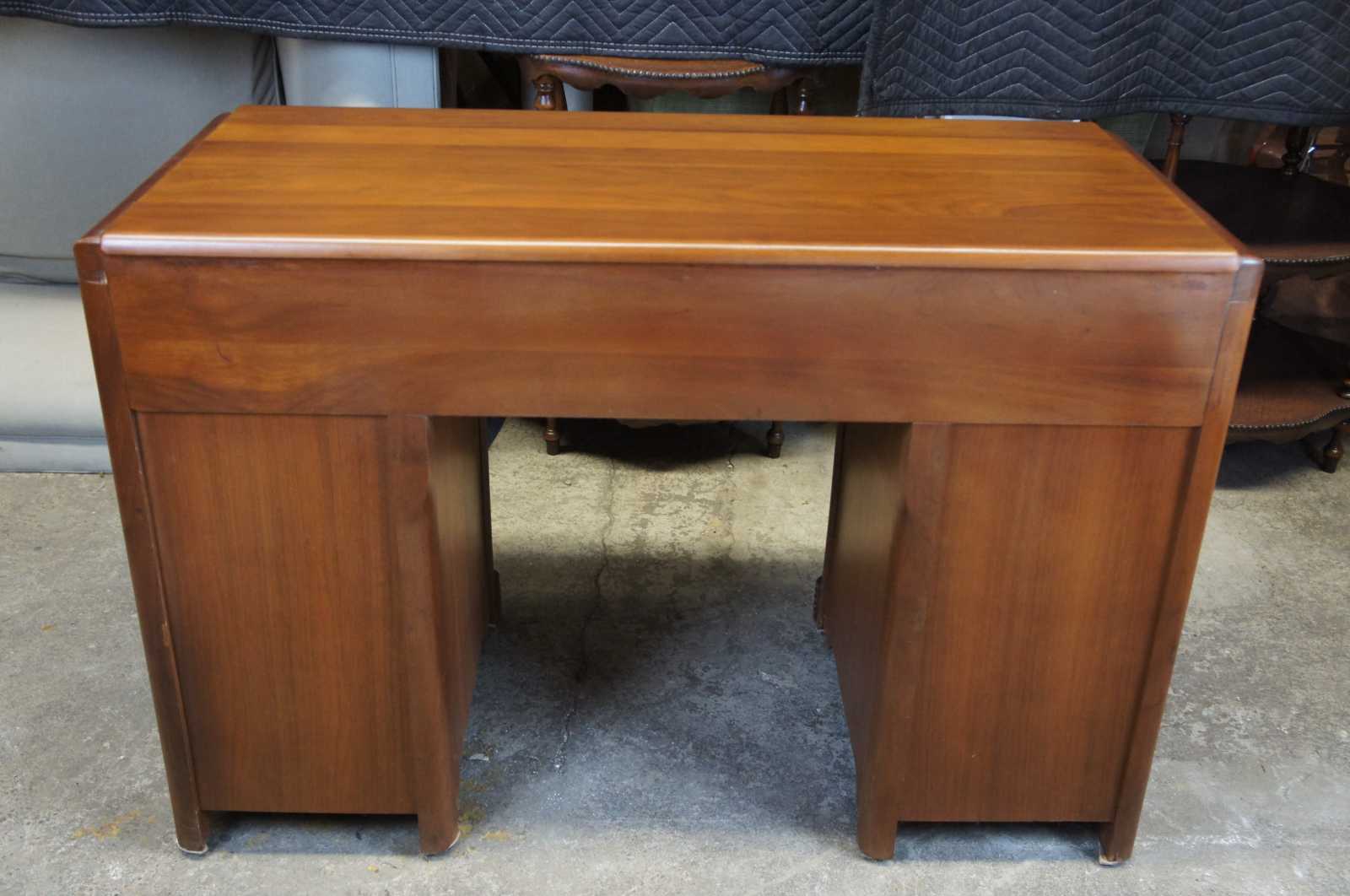 Art Deco era American Walnut writing desk. Features the iconic waterfall front with four large drawers flanking a kneehole and upper pencil drawer. Circa 1940s