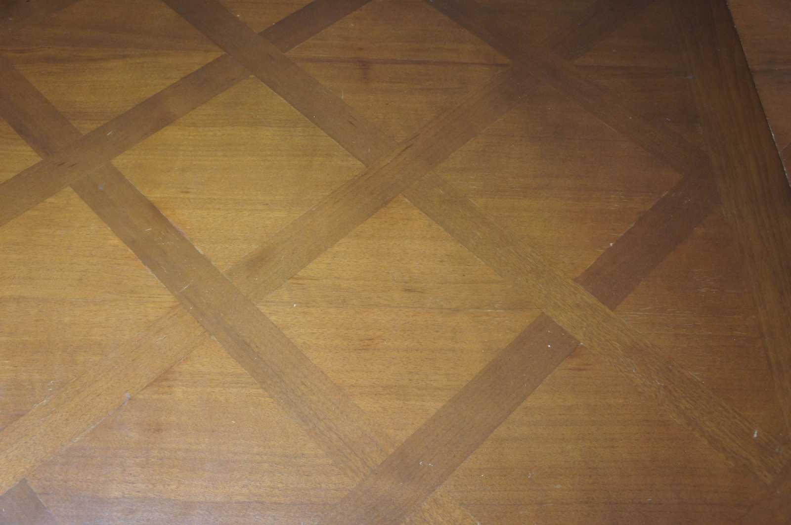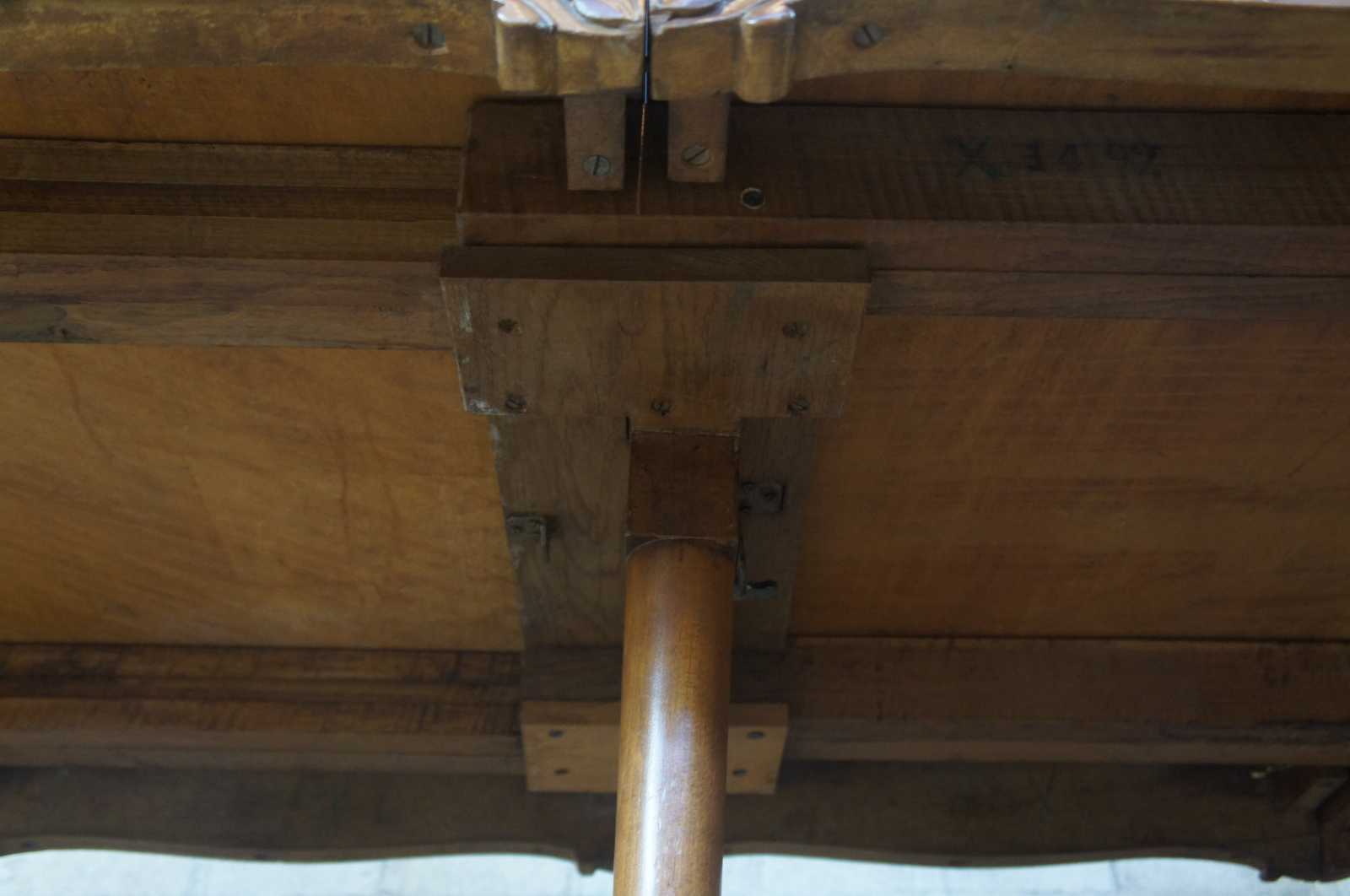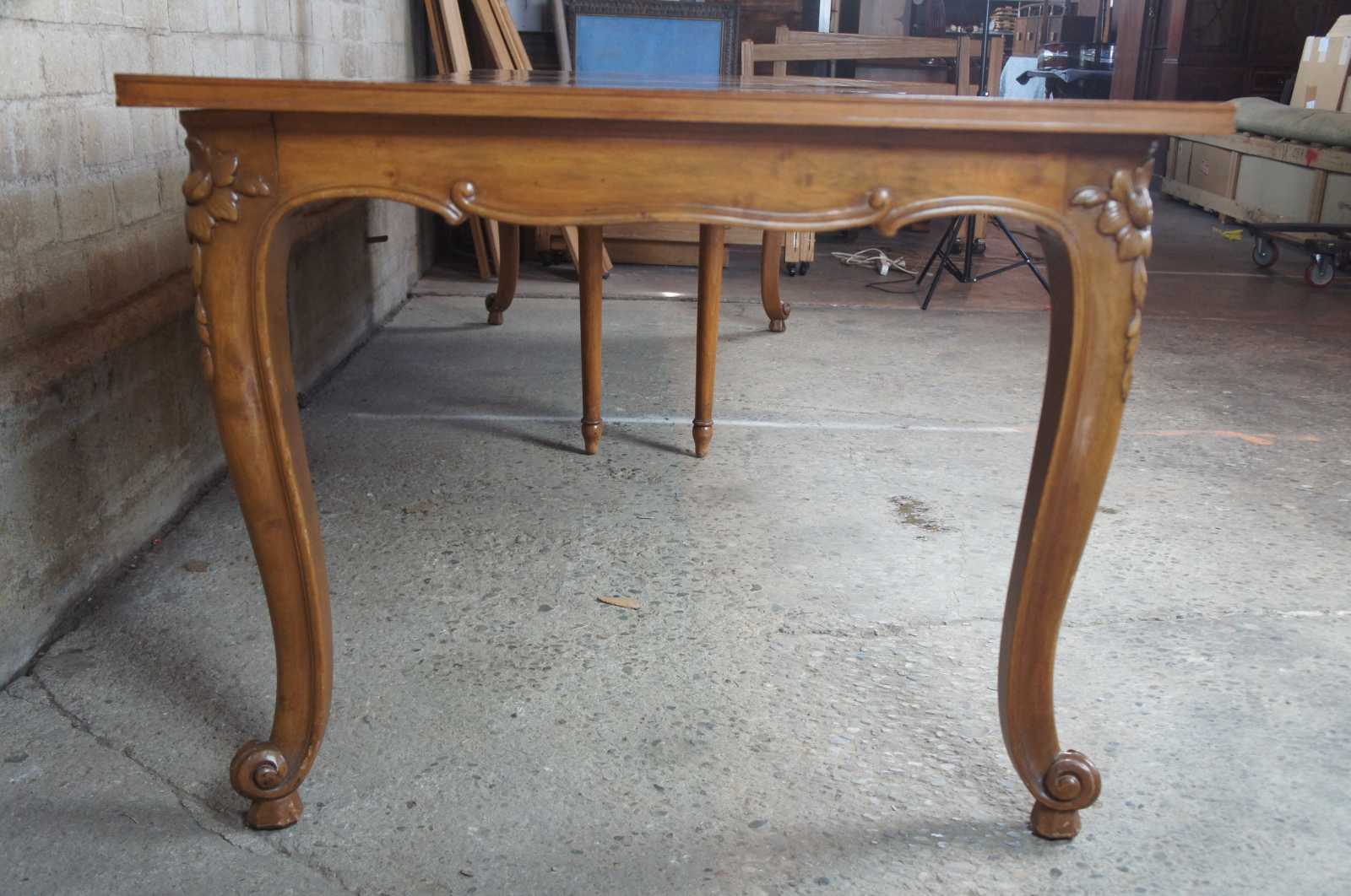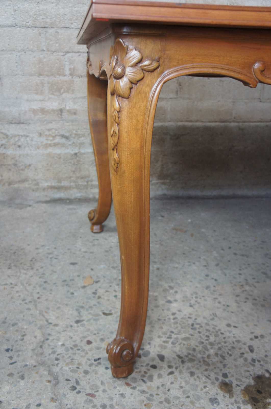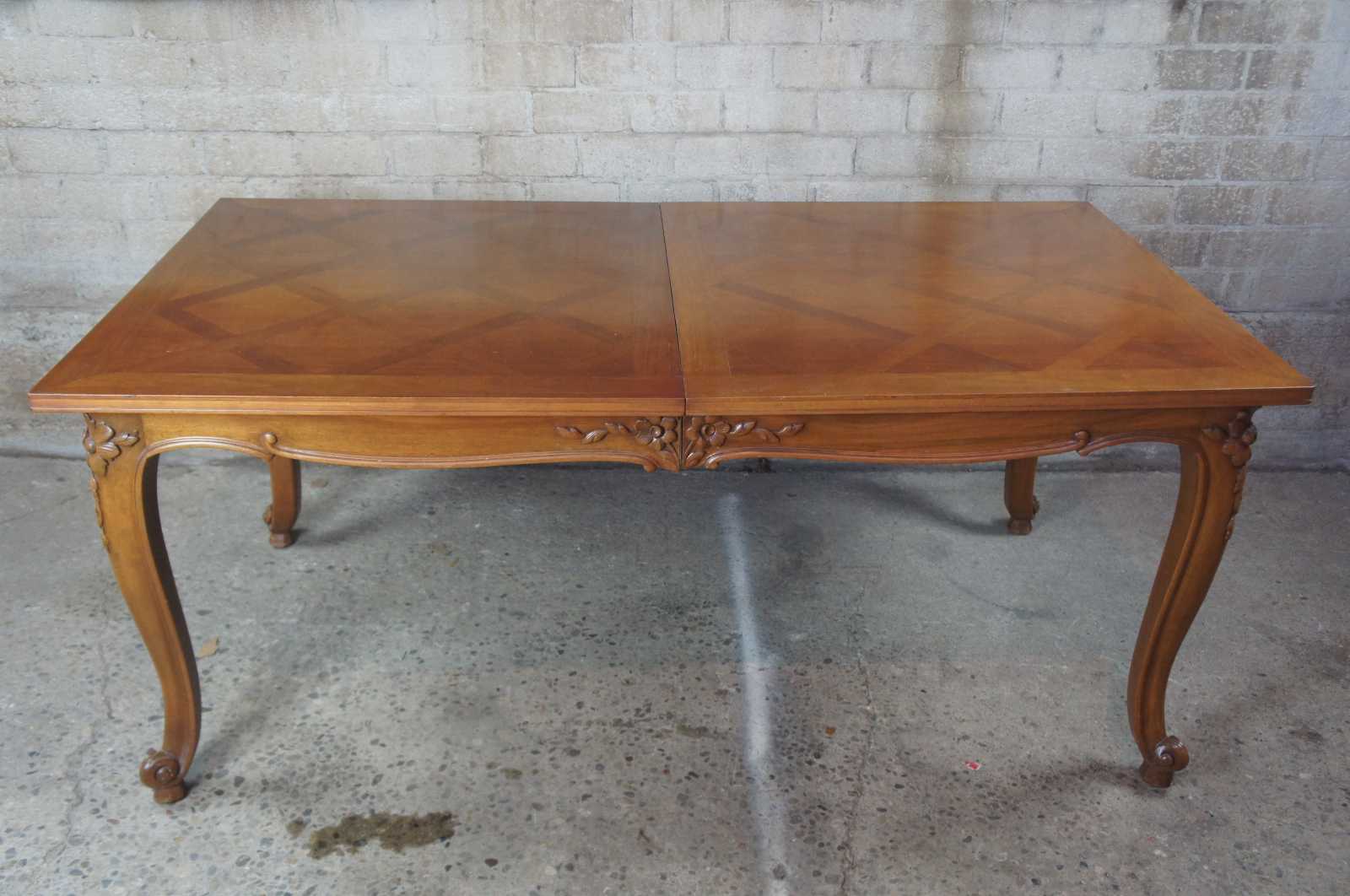 Early 20th century French dining table. Made from Walnut with floral carved embellishments and a parquetry top. Features cabriole legs with scrolled foot. Includes two leaves.