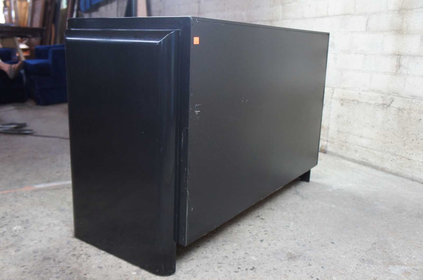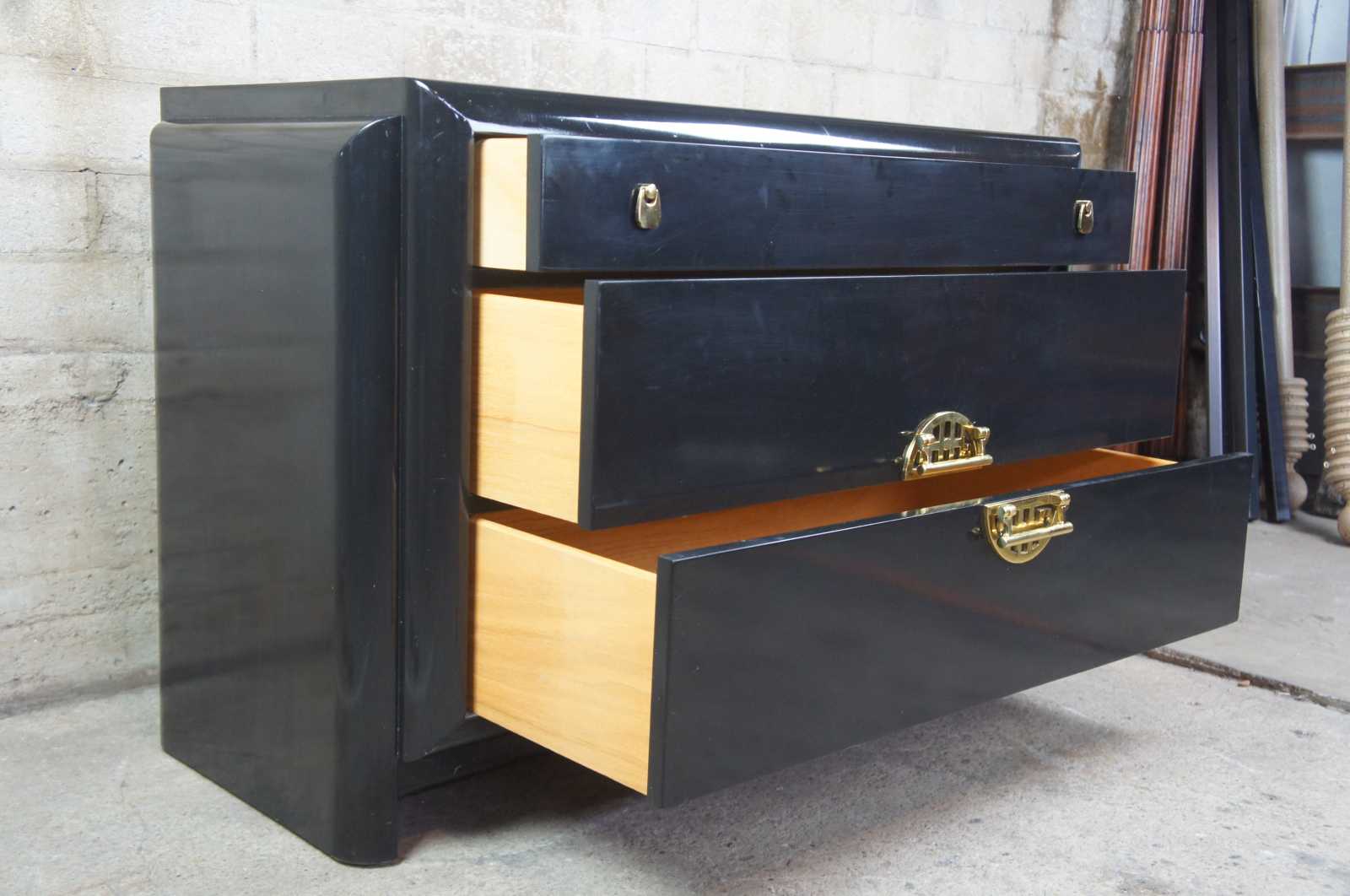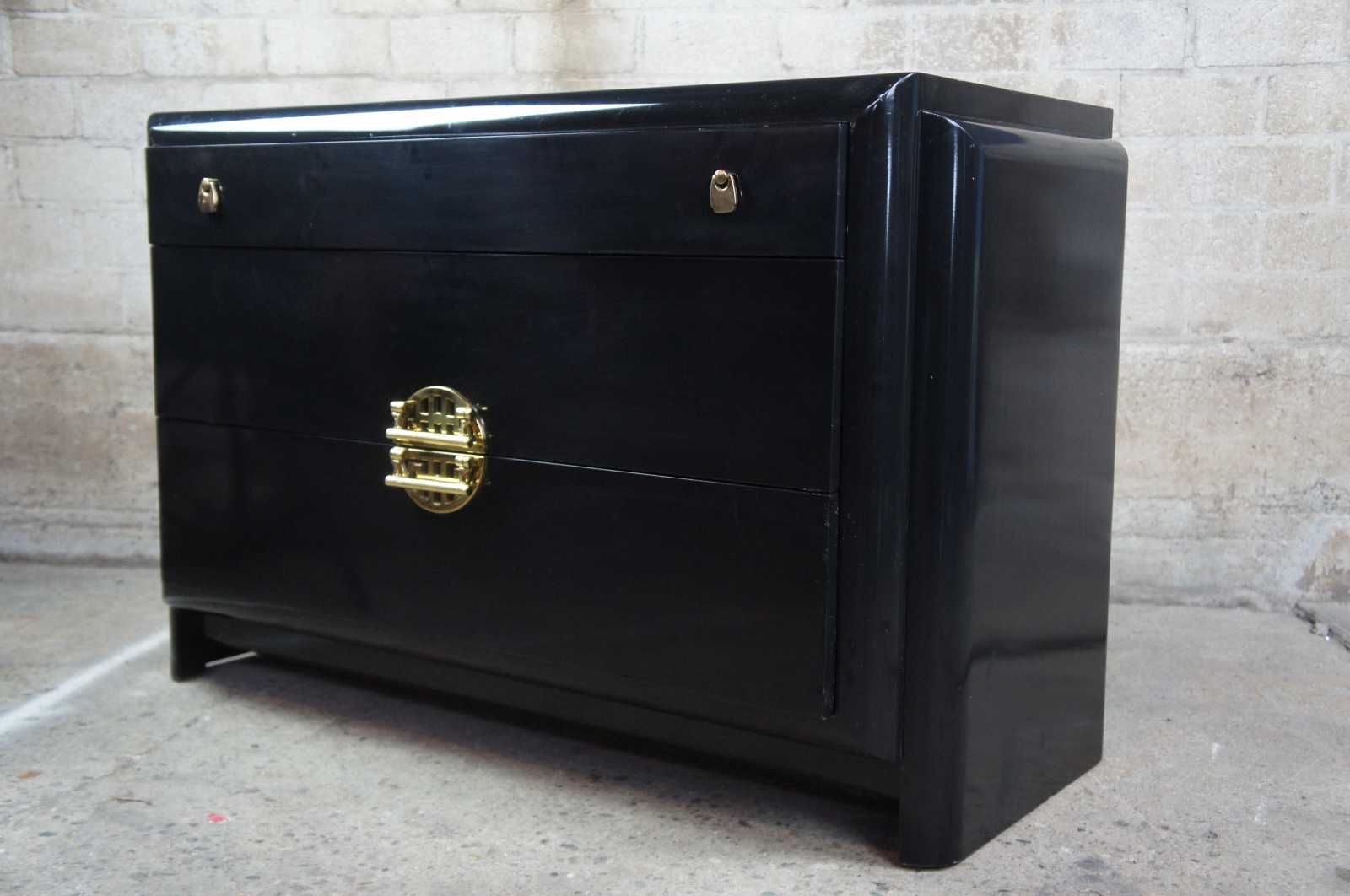 Mid 20th century modern dresser by Romweber Furniture. Features an Asian inspired design with black lacquer finish and nickel polished hardware with oriental motif.