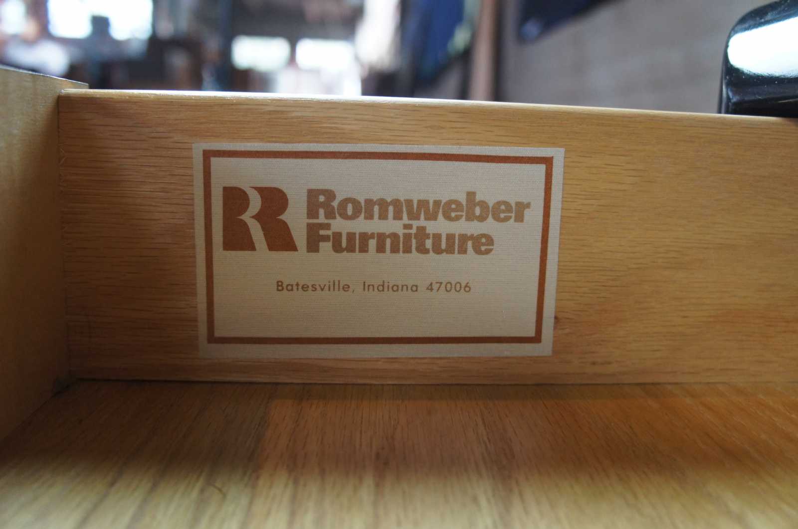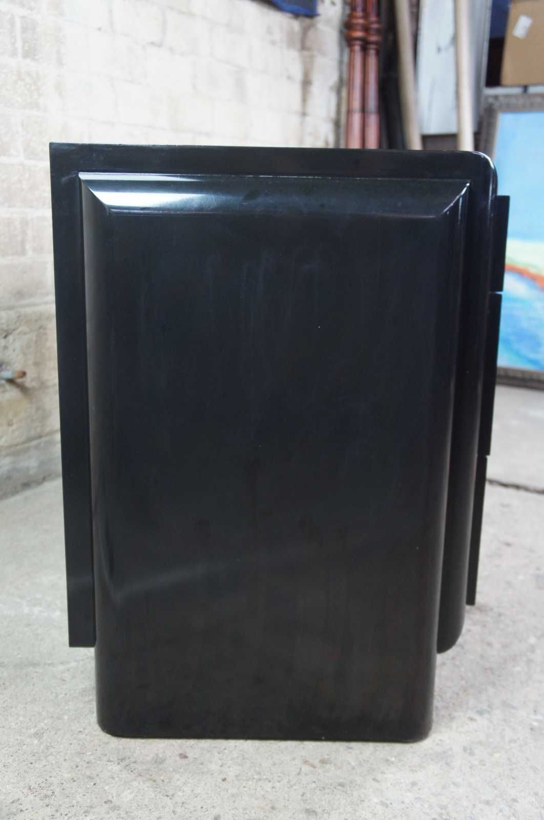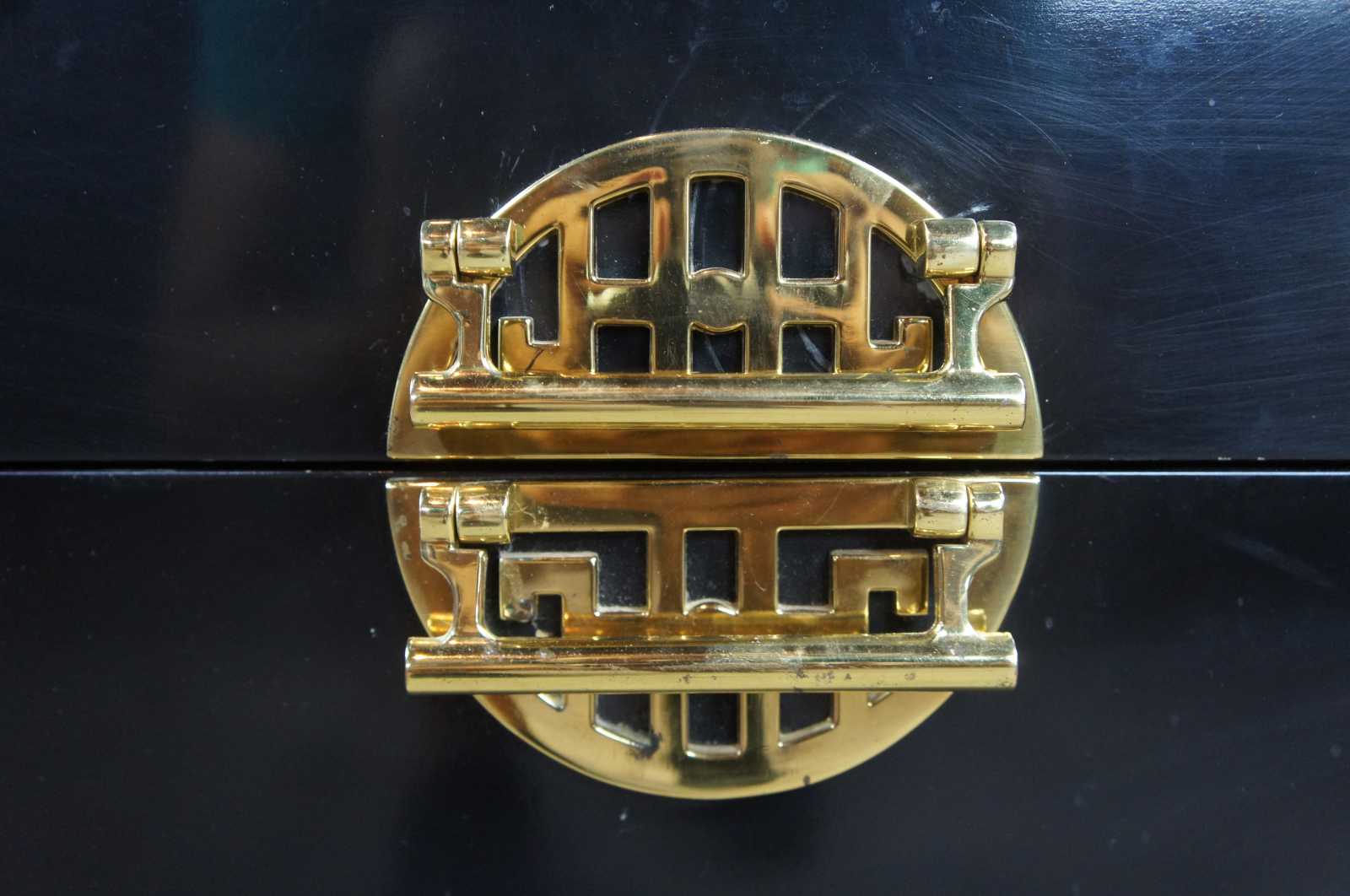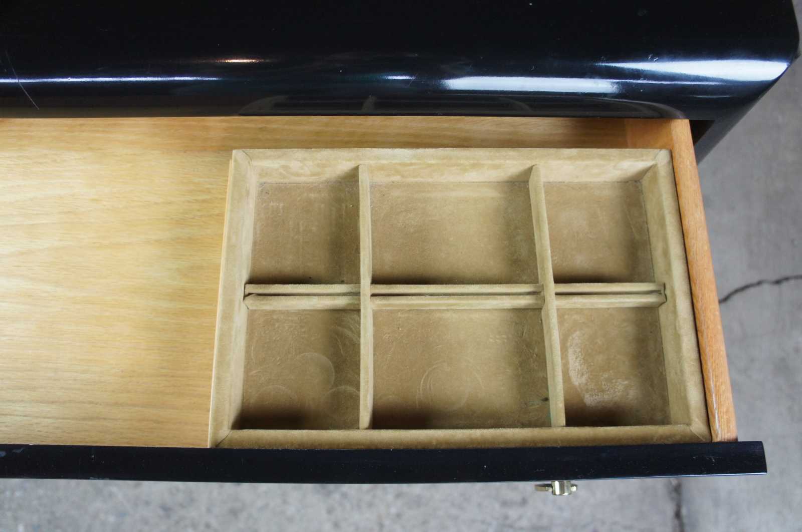 Mid 20th century modern dresser by Romweber Furniture. Features an Asian inspired design with black lacquer finish and nickel polished hardware with oriental motif.