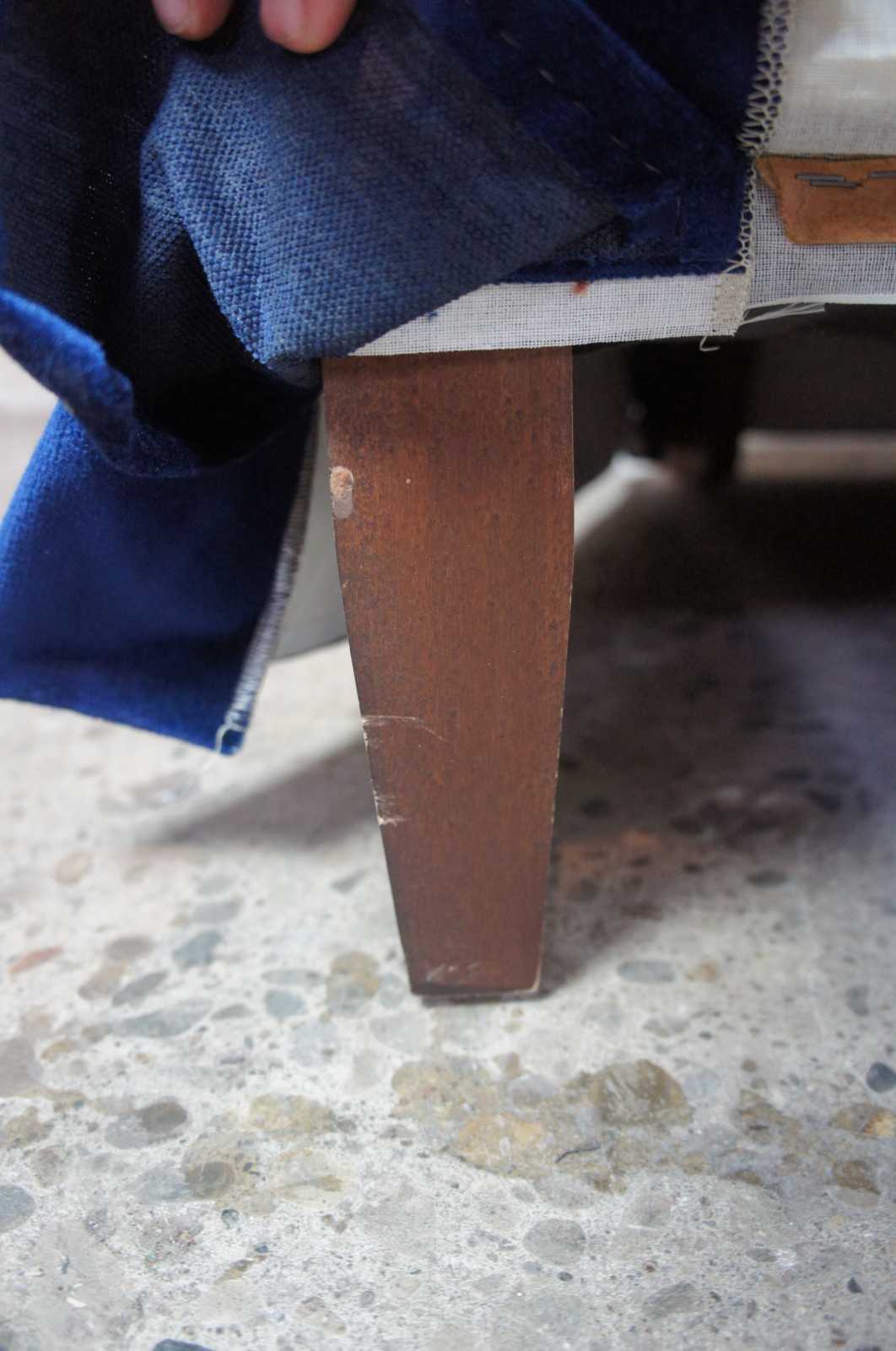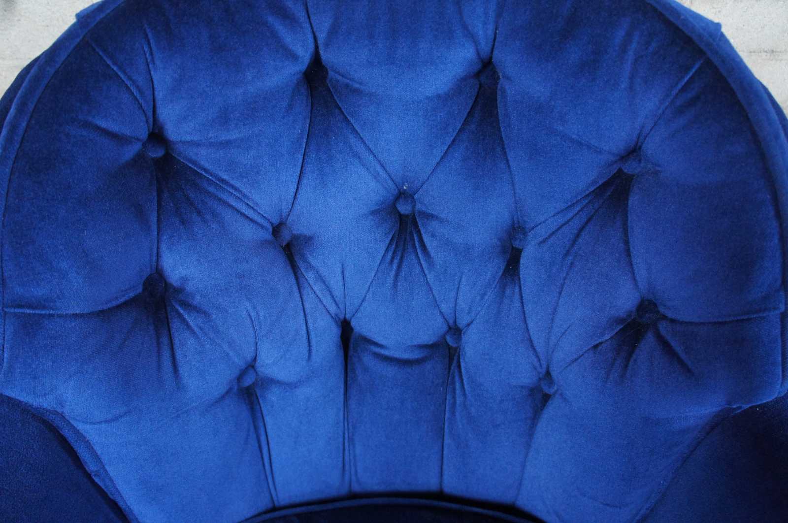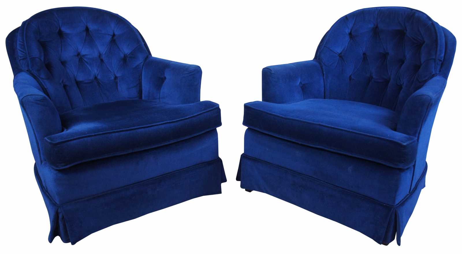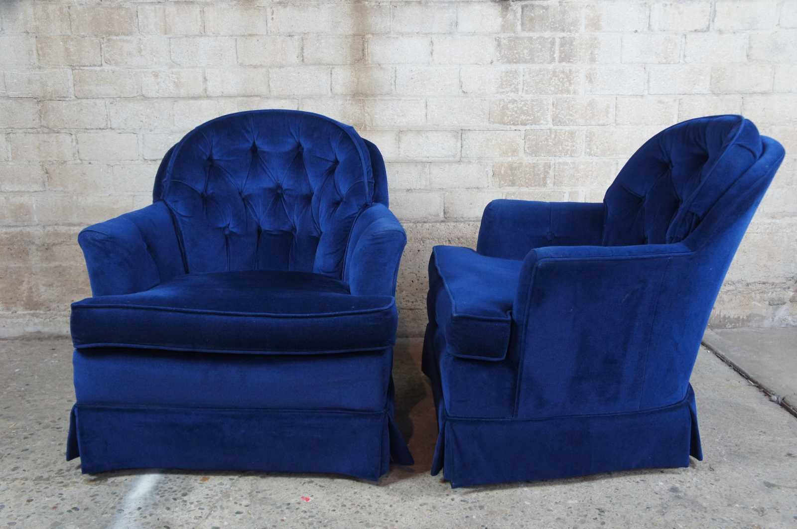 Two mid century royal blue gentlemans chairs. Features a tufted pillow back, supported by mahogany feet.