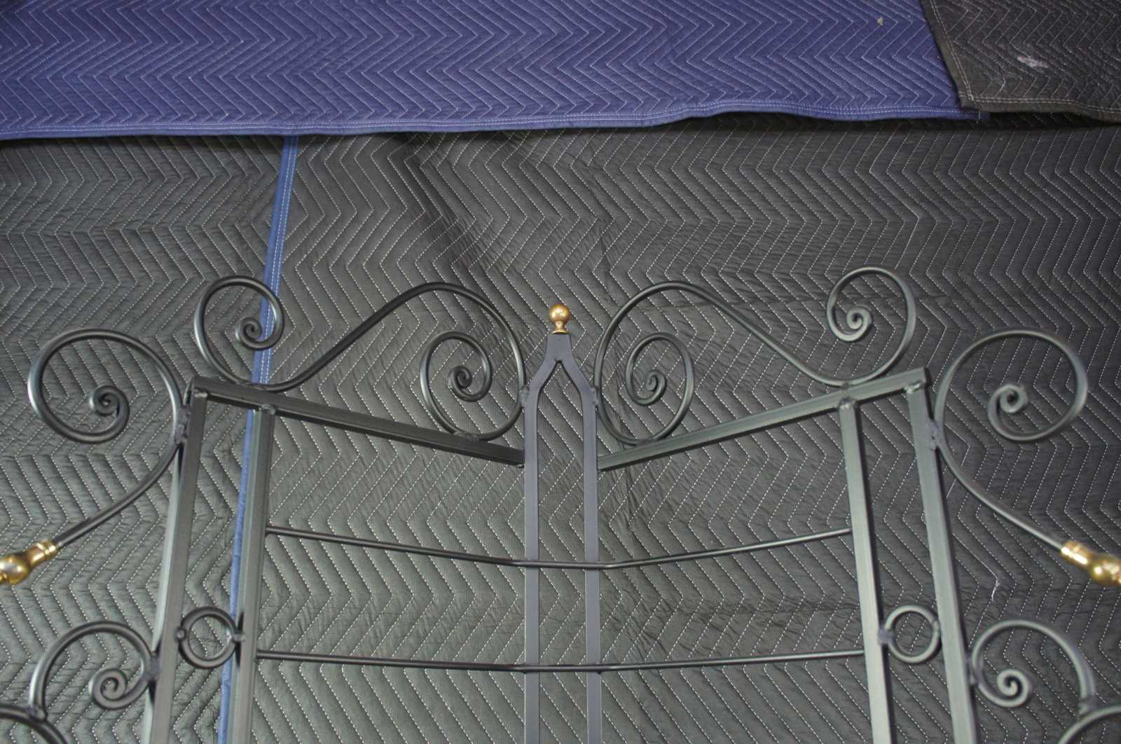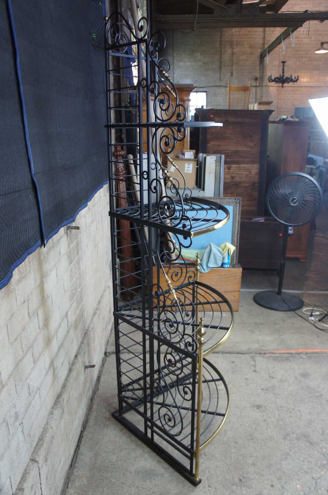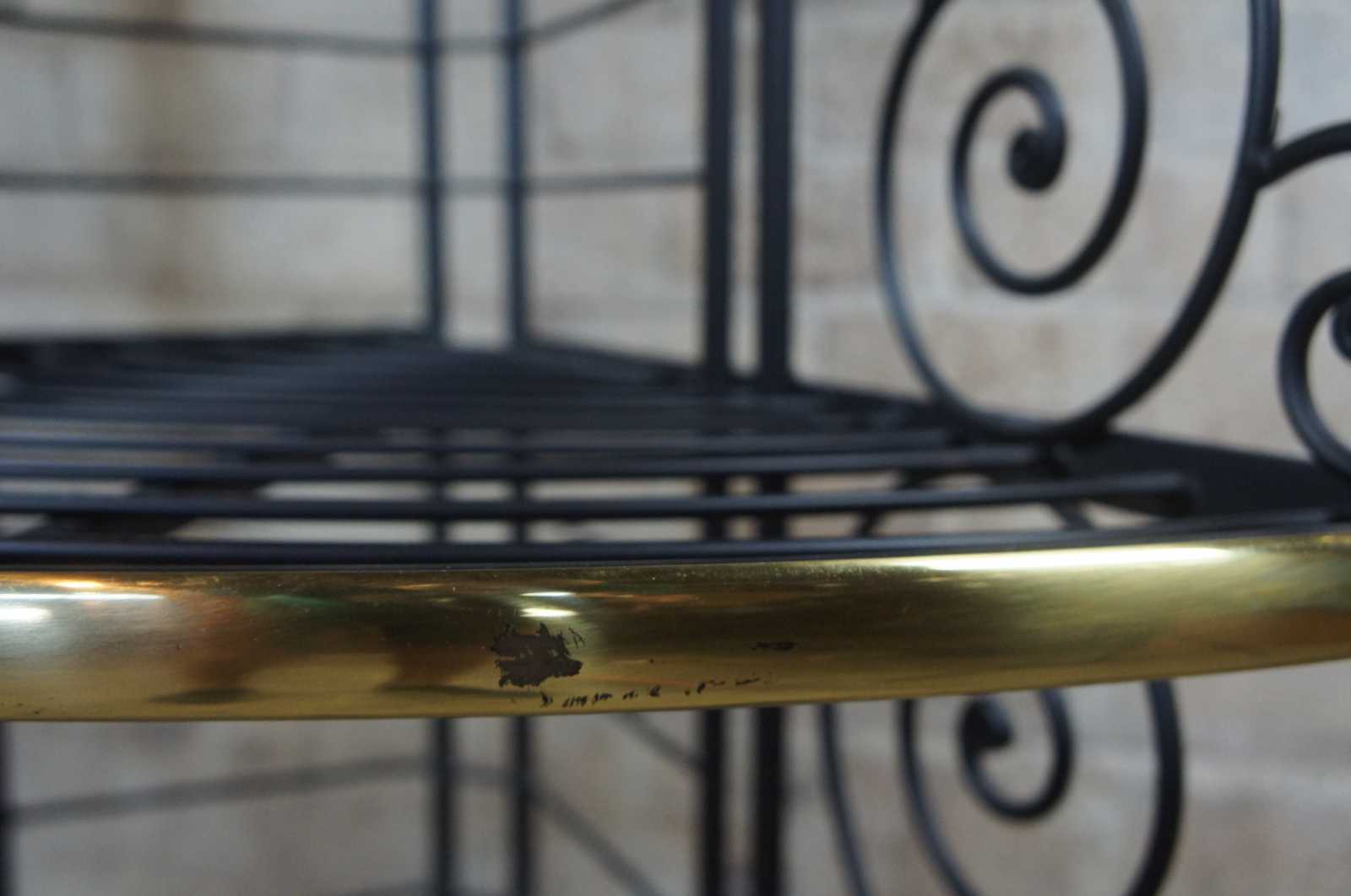 Circa 1980s scrolled iron and brass bakers rack. Features ornate details, very heavy duty.