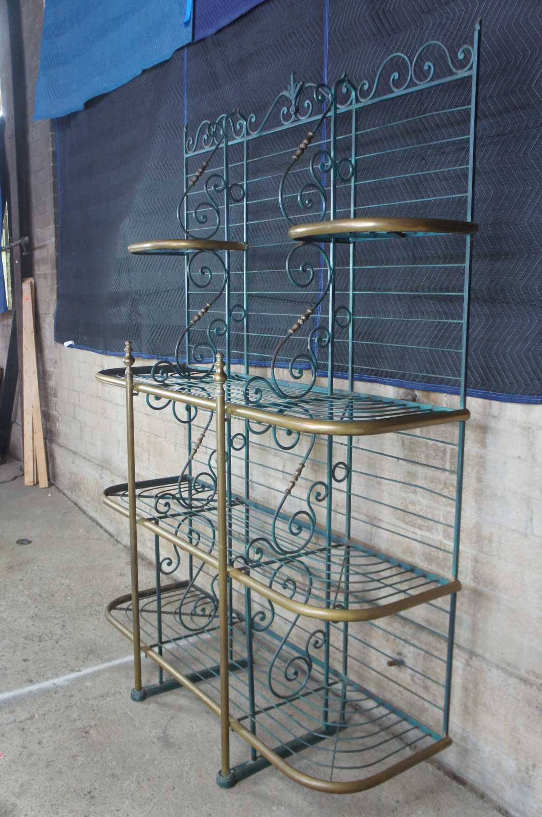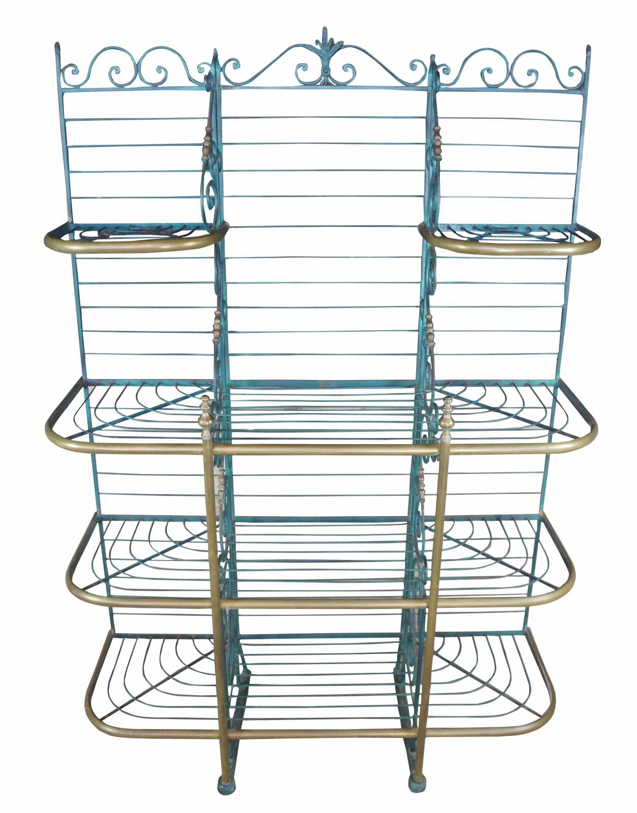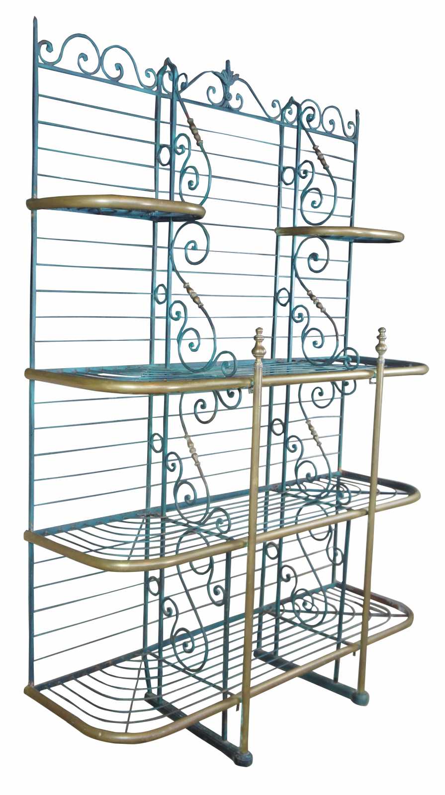 Early 20th century French bakers rack, attributed to Perfit Fils LTD in Paris France. Made of scrolled iron and brass with a green vertigris patina.