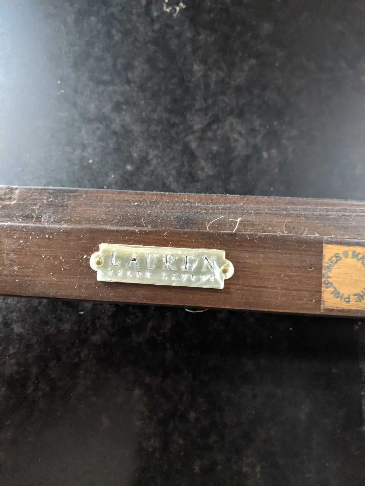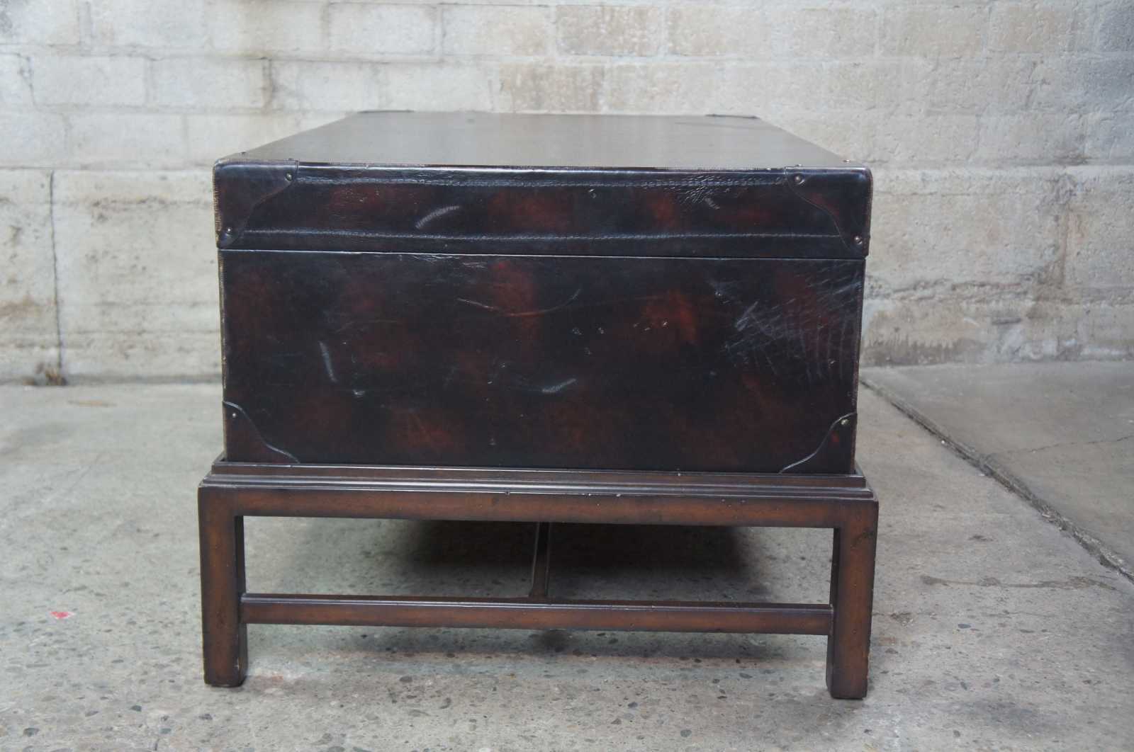 Drawing inspiration from Asian and English styling. The RL trunk is both masculine and sophisticated. Espresso distressed leather trunk sits on wood stand. Antiqued bronze hardware. Great accent piece with clean lines and personality.