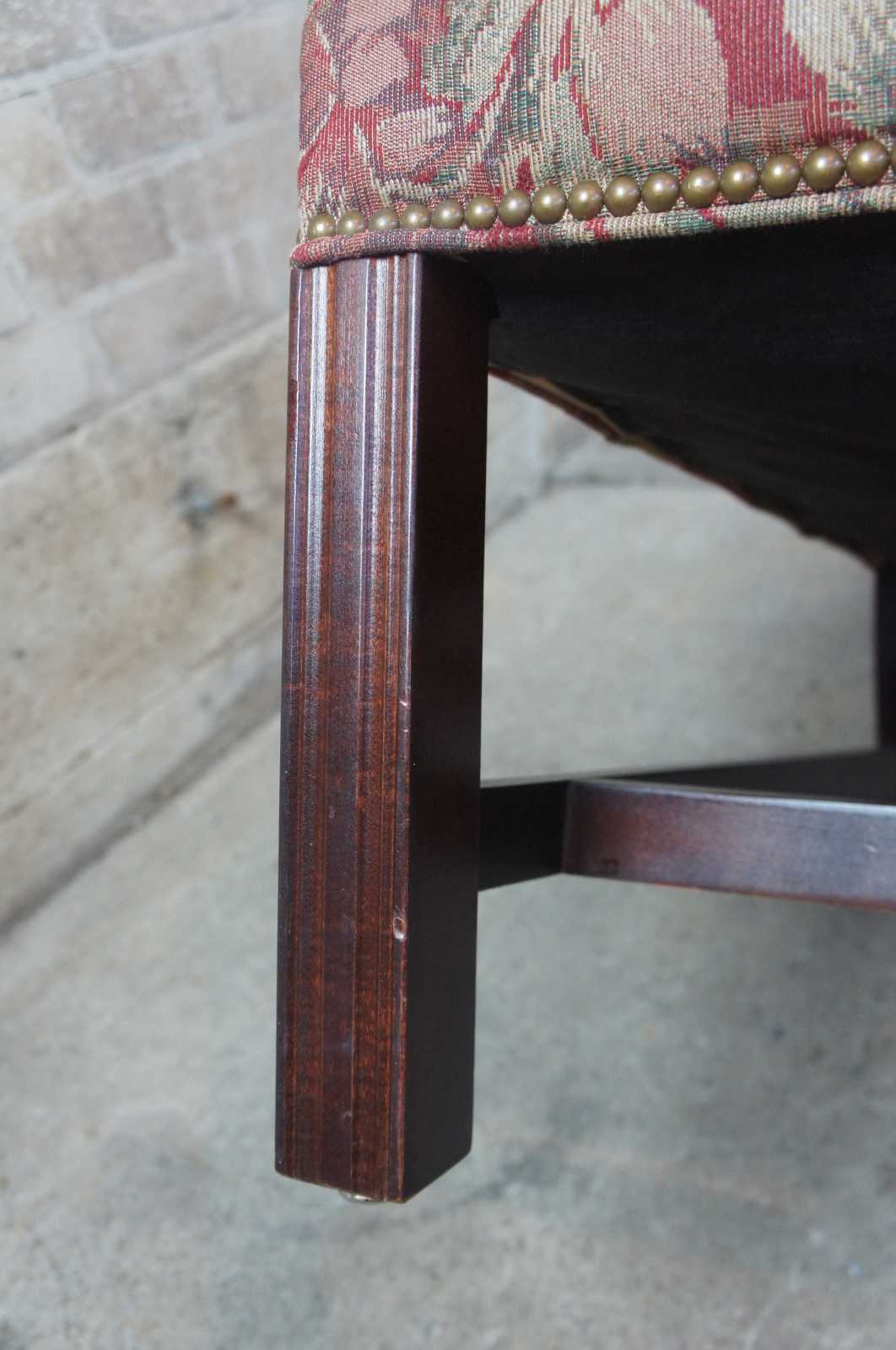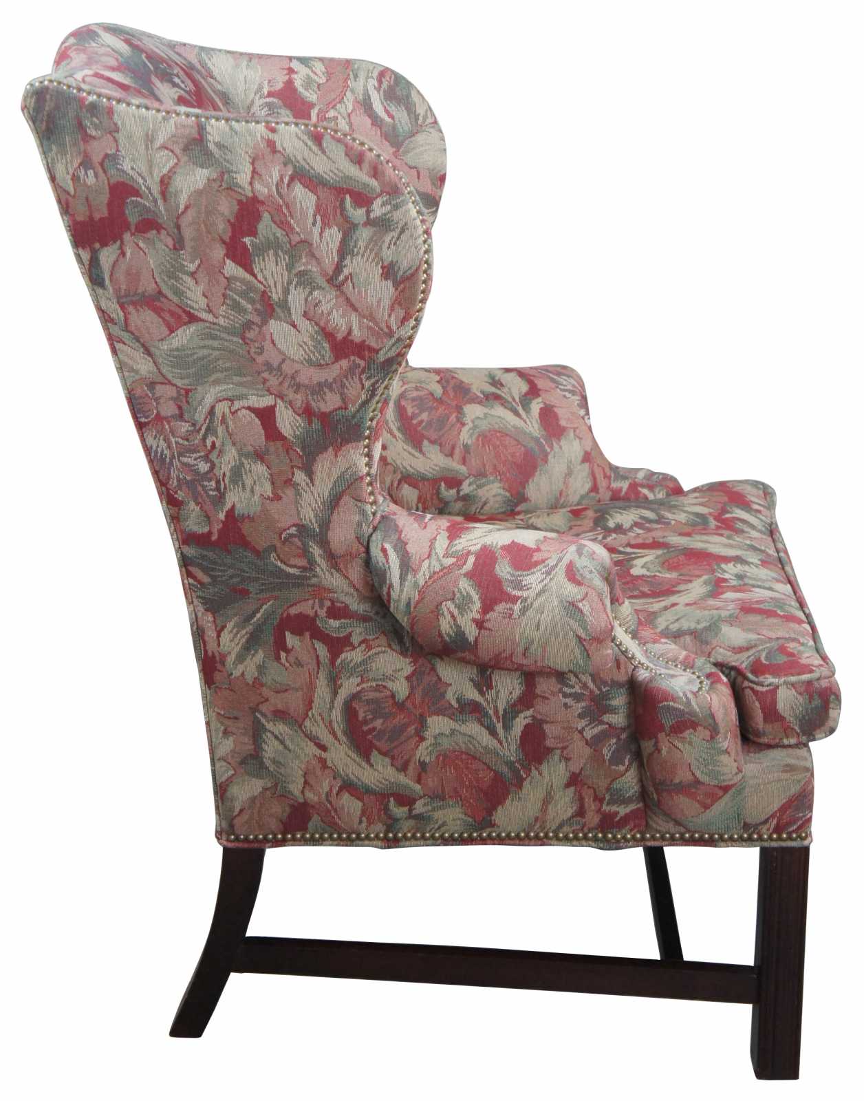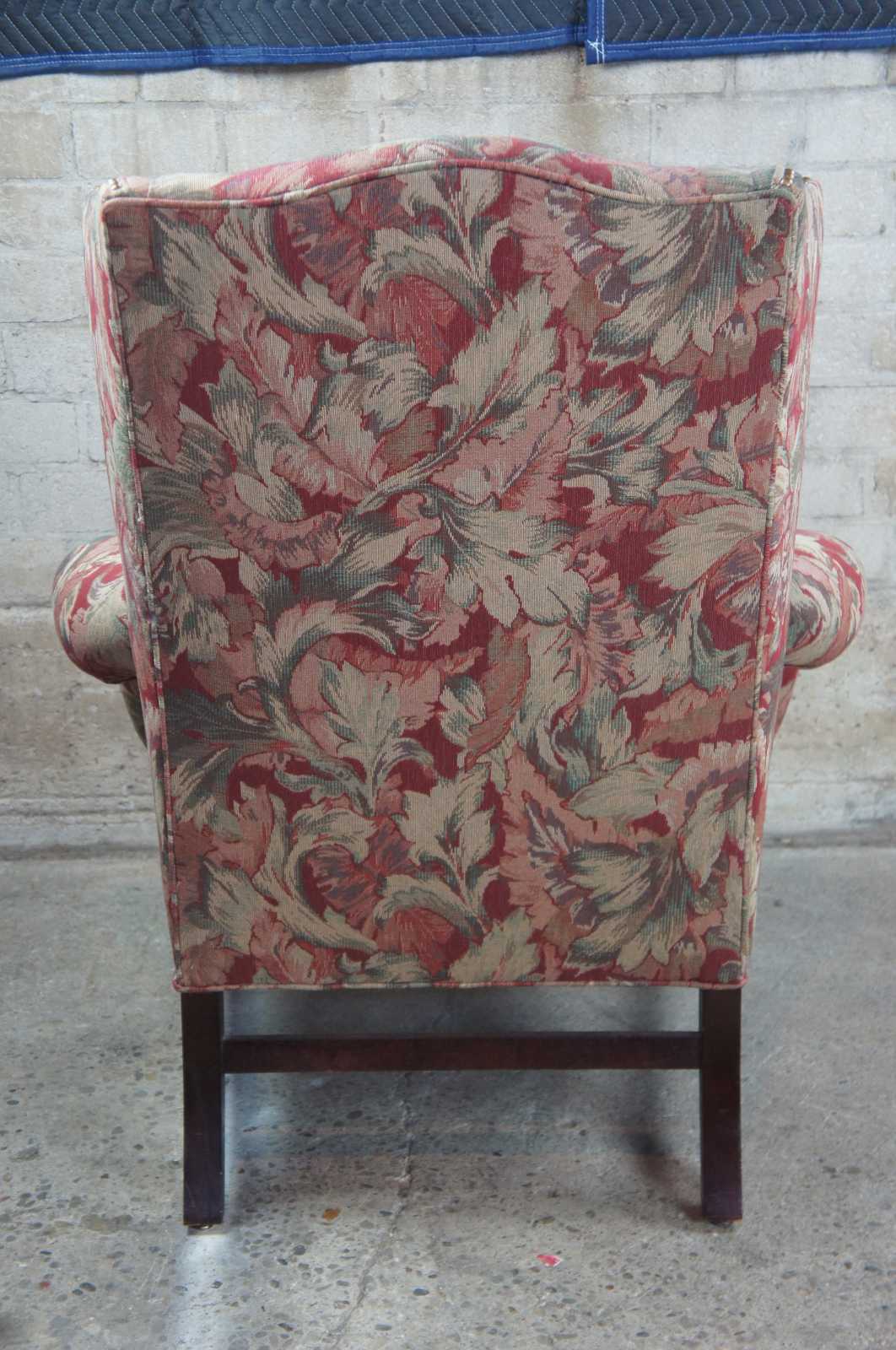 Vintage Century Furniture floral wingback arm chair. Features a slight camelback with rolled arms, nailhead trim and floral upholstery. Upholstered by Century Furnitures LT Designs.