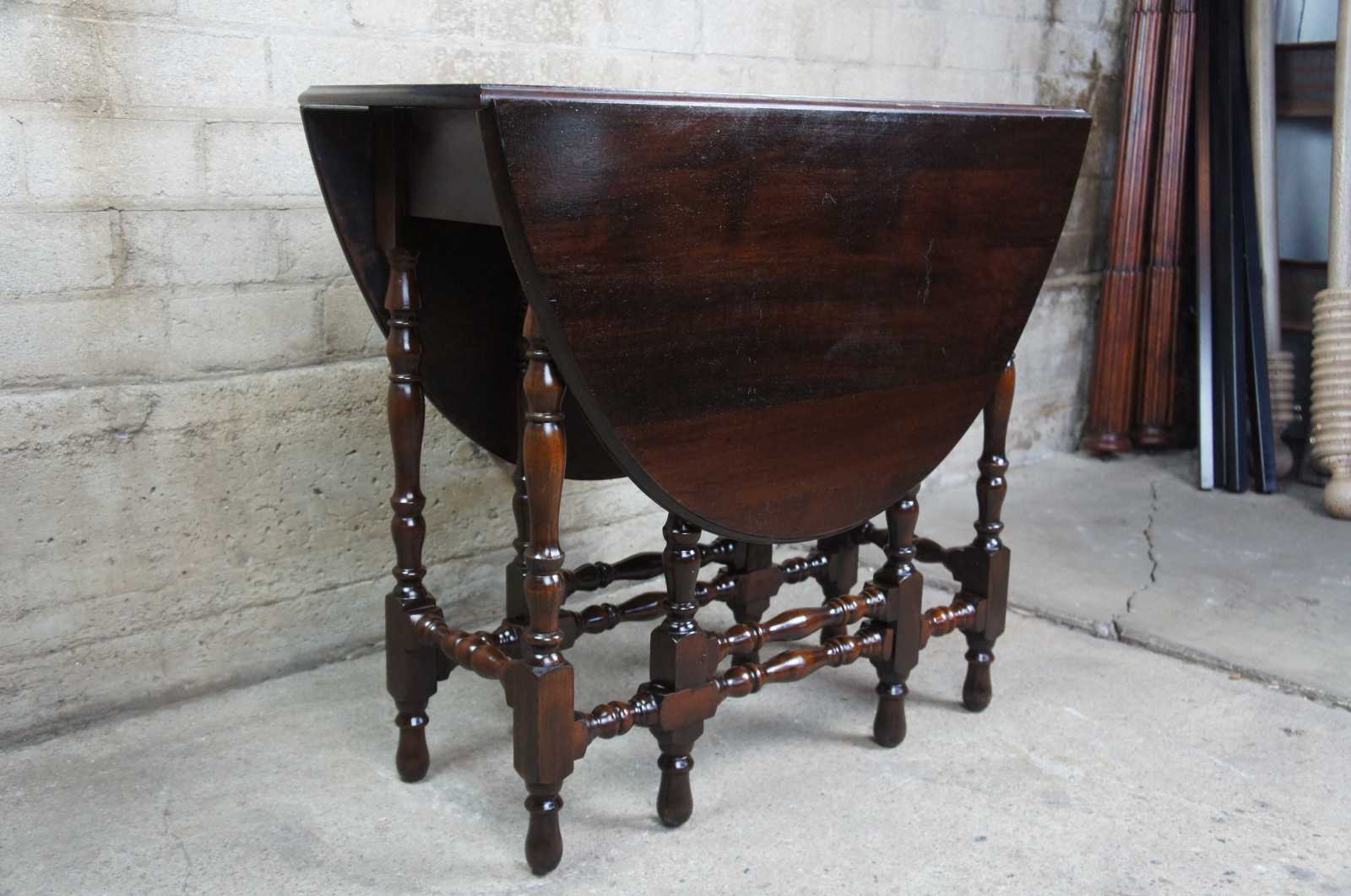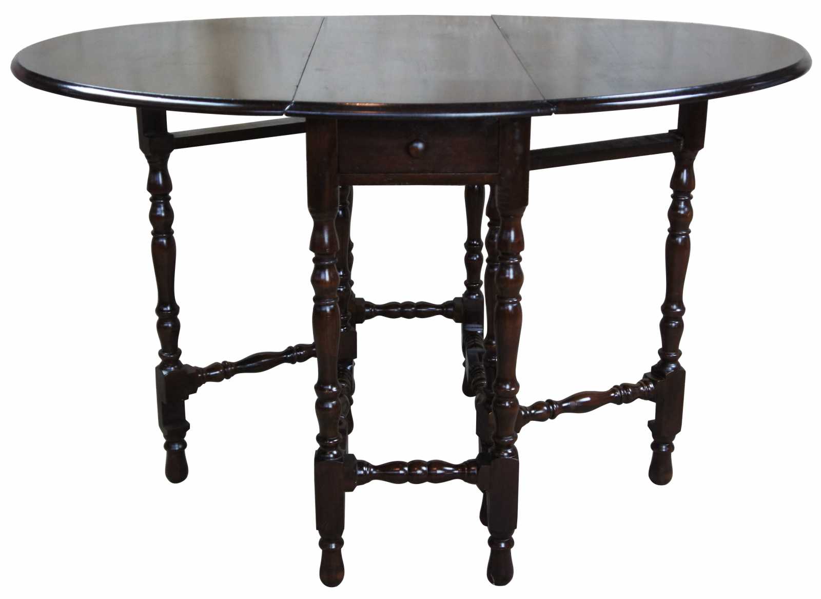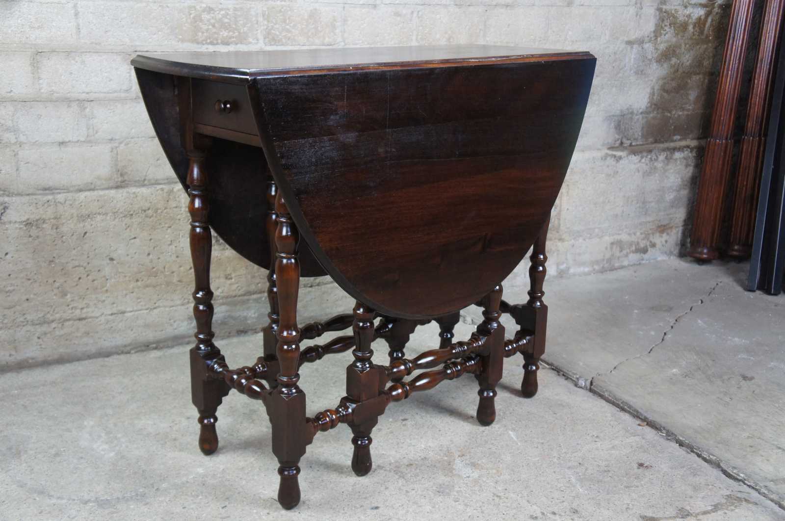 Early 20th century solid walnut drop leaf or gateleg table with drawer. Features turned supports in William & Mary style.