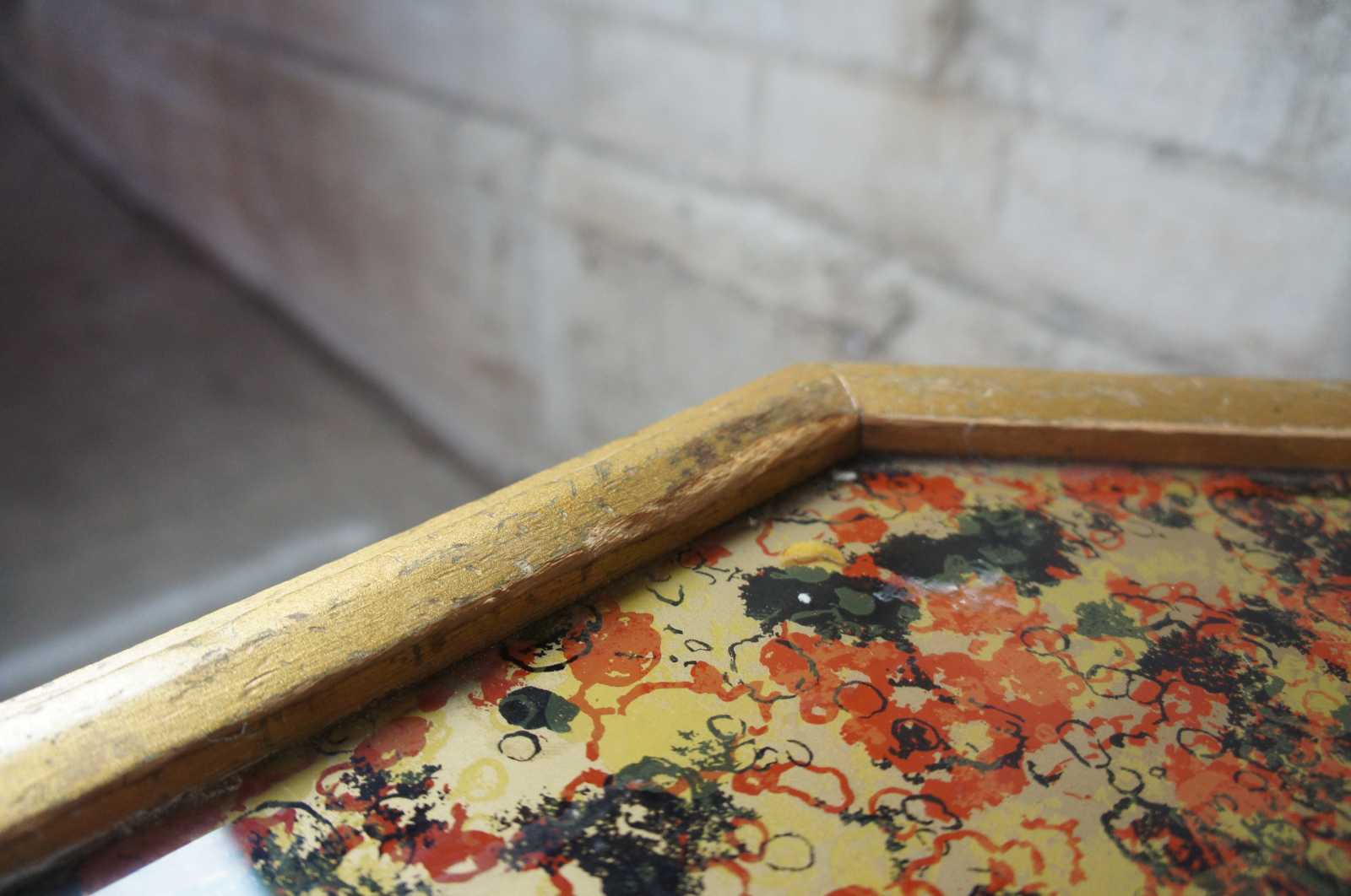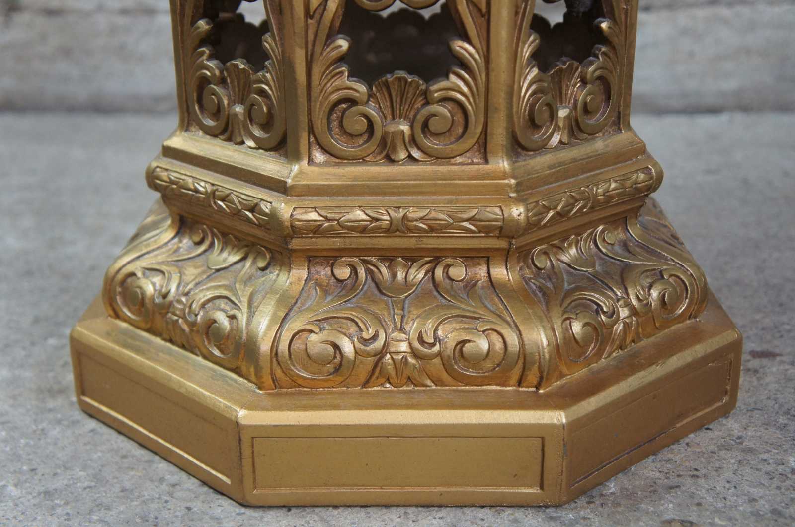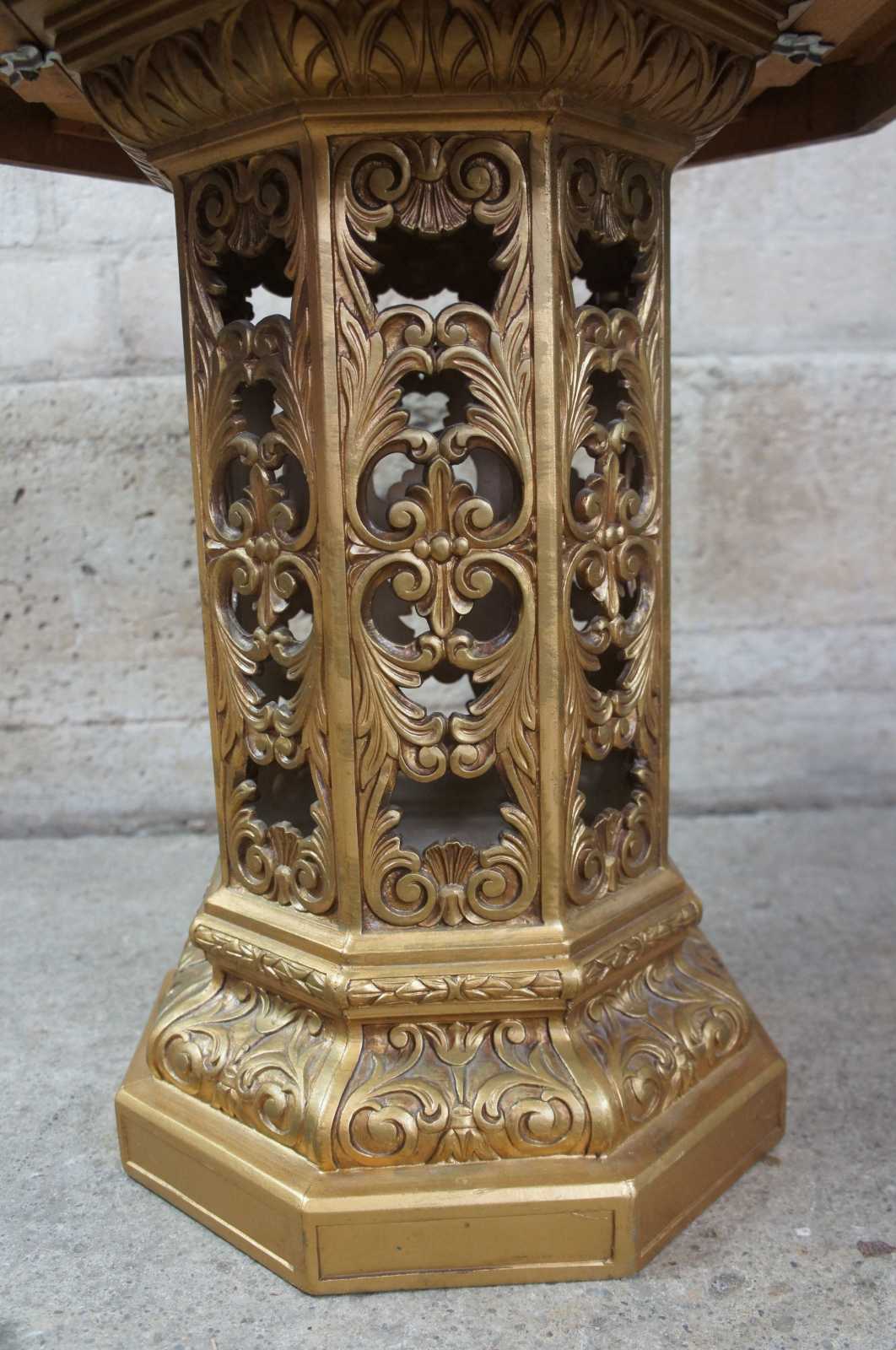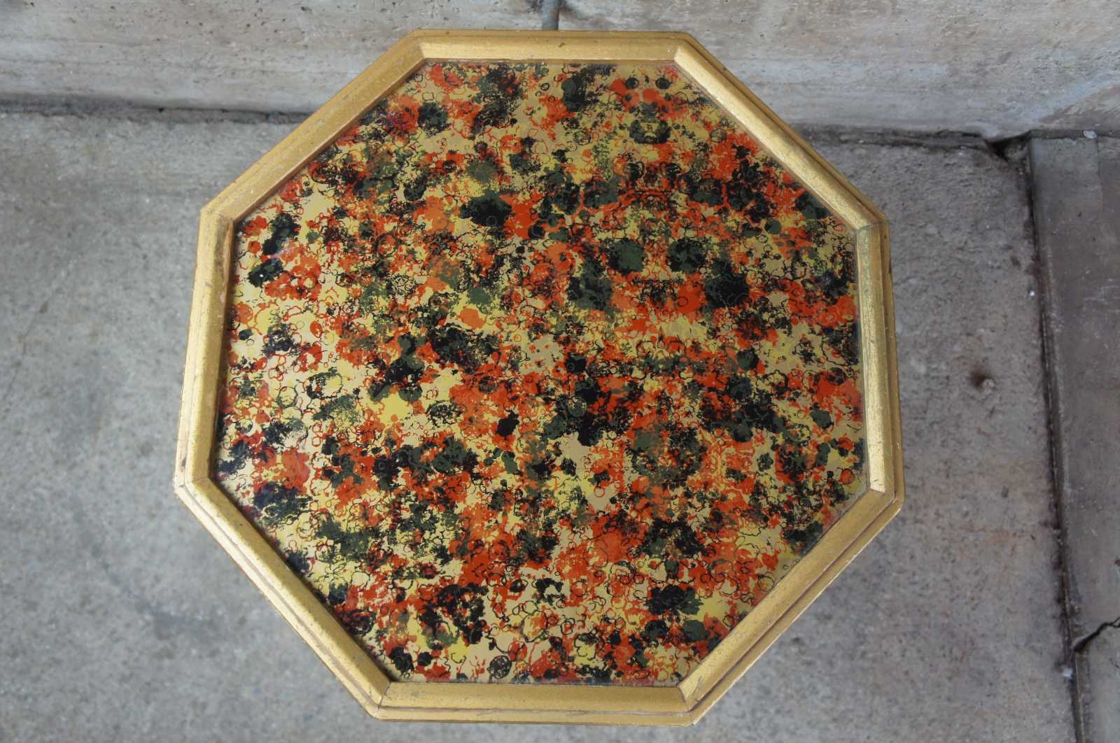 Circa 1970s French inspired gold tone pedestal table with octagon shaped eglomise top. Made in Chicago Illionois.