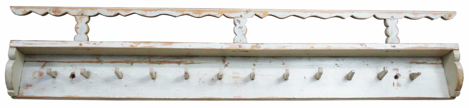 Late 19th century Romanian wall shelf. Often used in European country homes to display plates, cups or kitchen ware. Features three grooves along the top and twelve pegs. This would make a wonderful hanging rack in any mudroom, bathroom, hallway, entryway or kitchen.