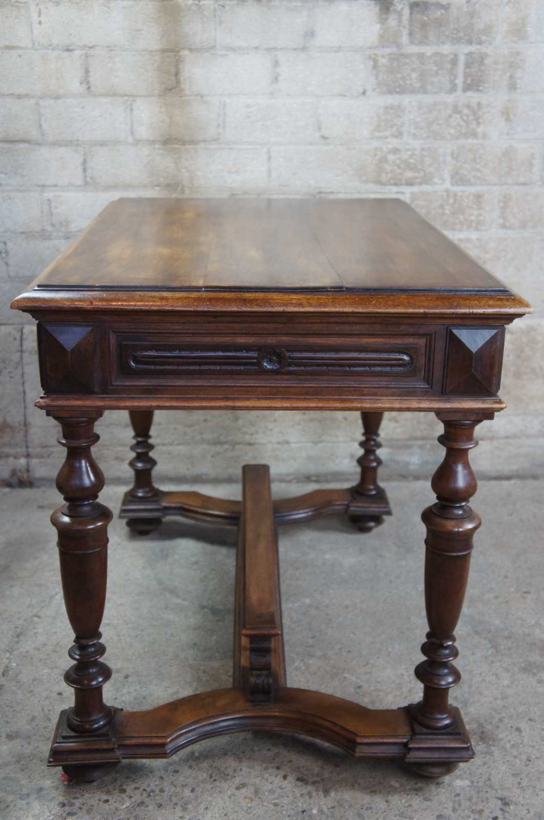 Circa 1890s French library table in Henry II style. Made from walnut with a long carved central drawer over turned legs and trestle base. Brass drawer pull features two delphins (dolphins) connected by a shell. The desk is carved in traditional French fashion and features a unique spindled apron above the trestle.
