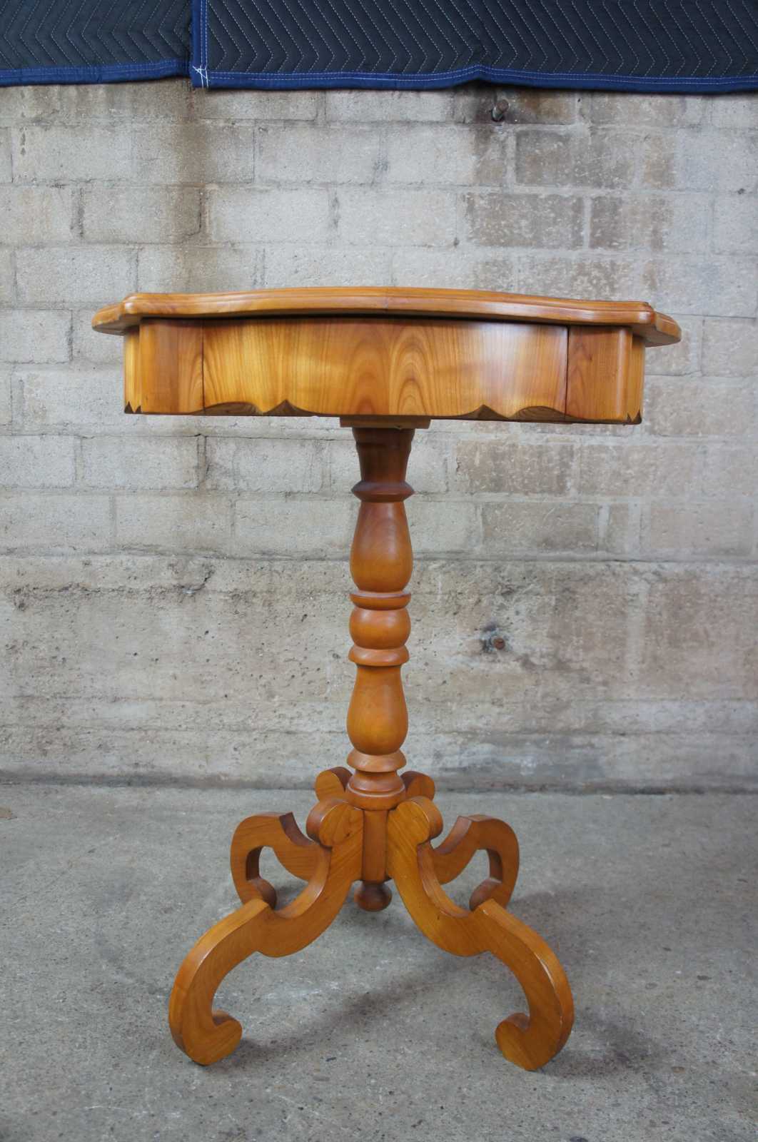 20th century French turtle top side table with drawer. Features a turned center support, scrolled legs and scalloped shape.