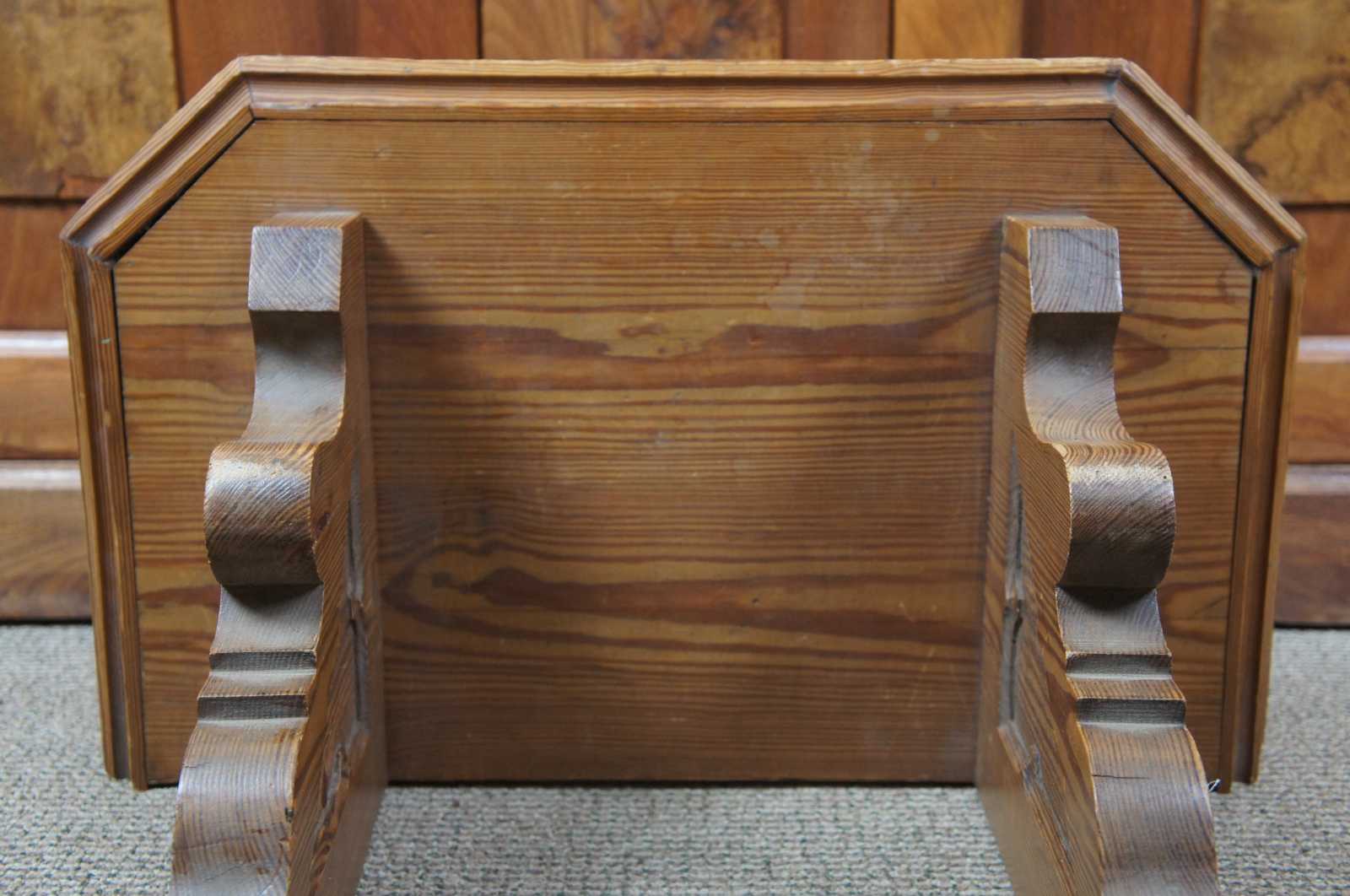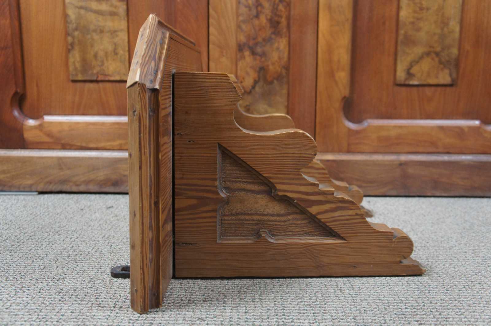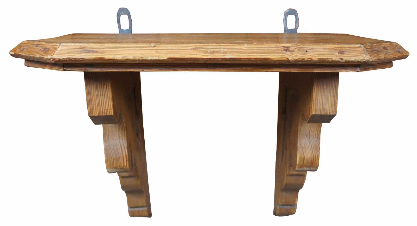 Early 20th century antique european pine wall shelf. Features engraved side panels, serpentine supports and heavy iron bracket for mounting.