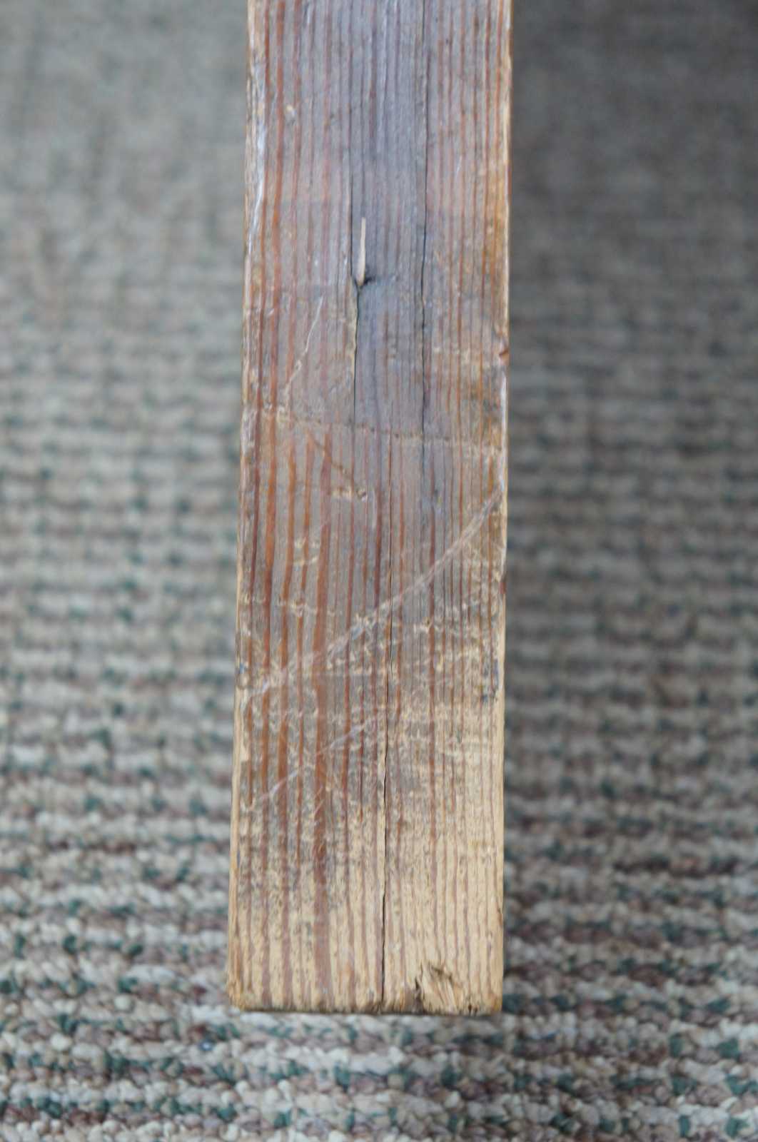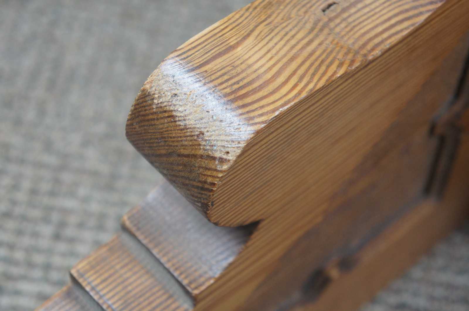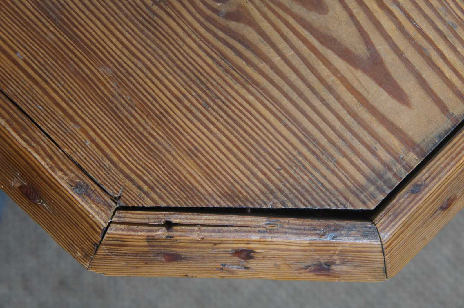 Early 20th century antique european pine wall shelf. Features engraved side panels, serpentine supports and heavy iron bracket for mounting.
