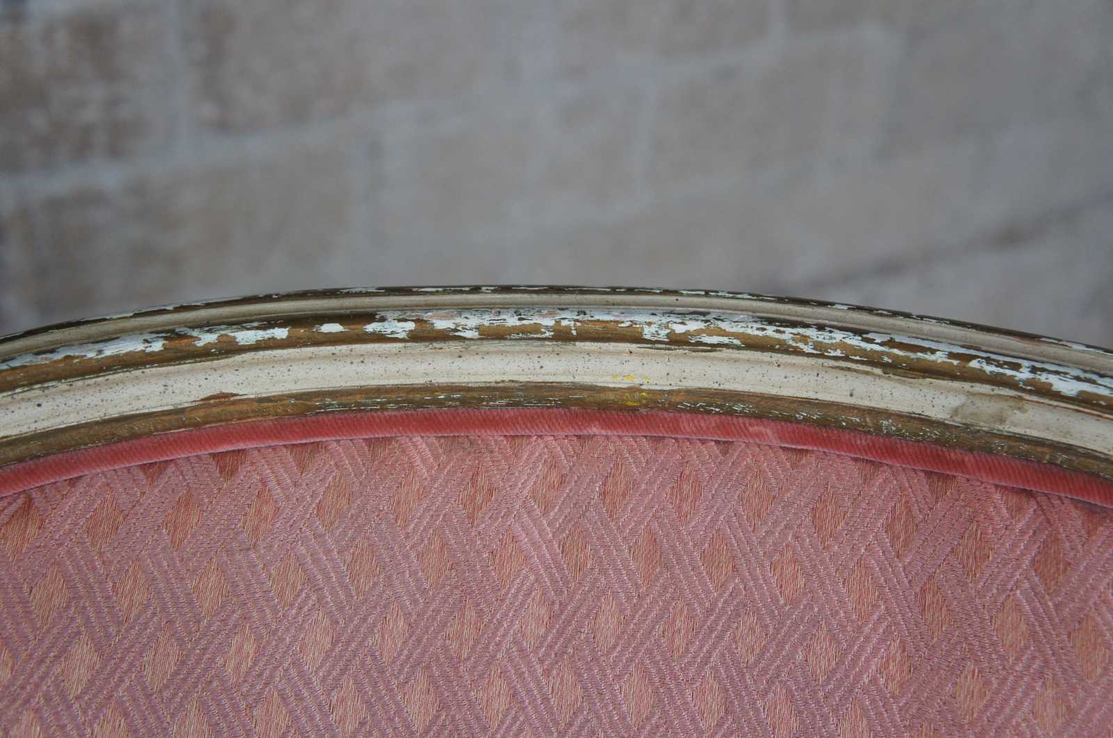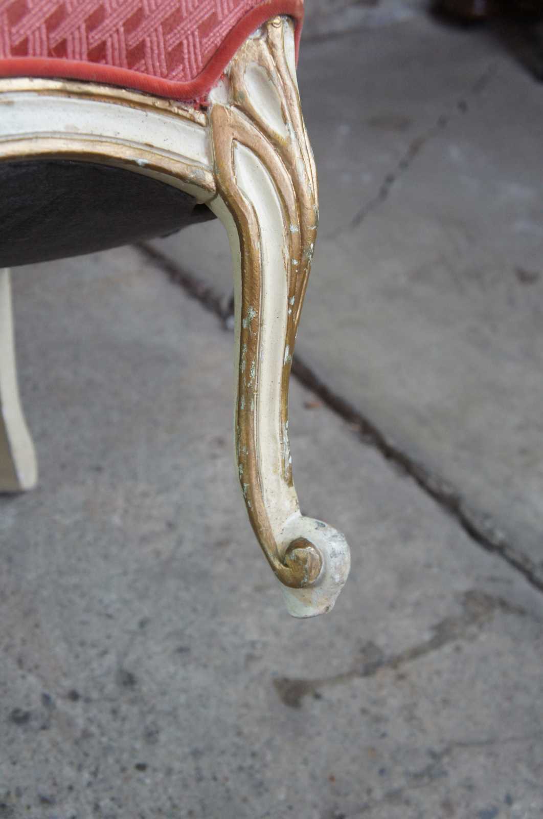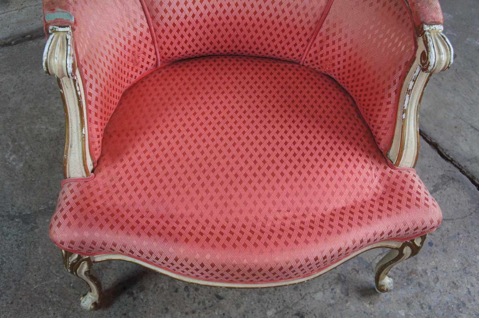 Circa 1930s French Provincial arm chair. Off-white with gold trim and red/pink upsholstery with interwoven design.