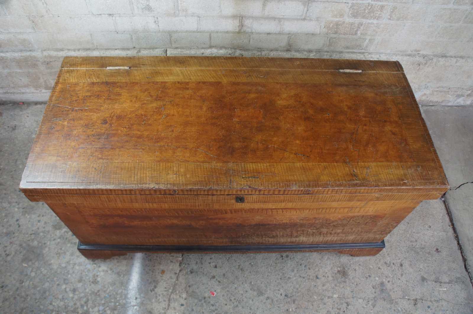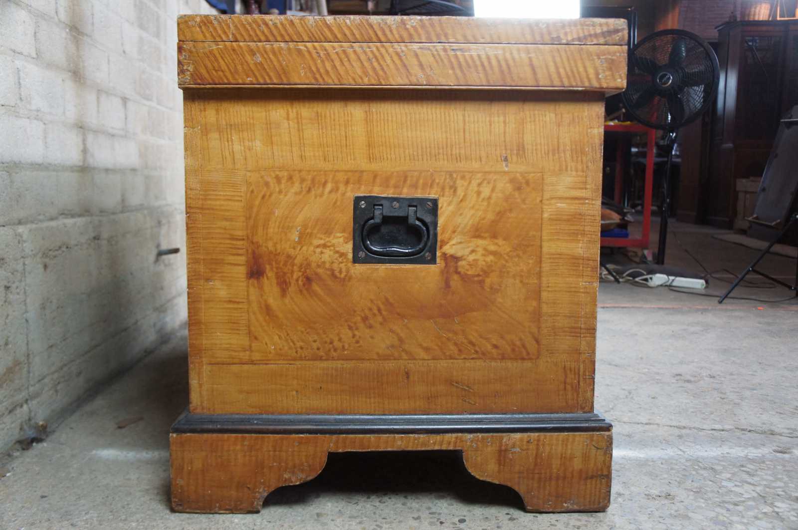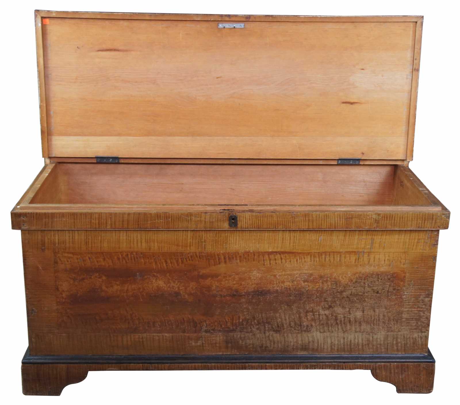 Early 1800s Pennsylvania chest. Made from pine with a tiger maple painted grain exterior. Features inset heavy duty iron handles and bracket feet.