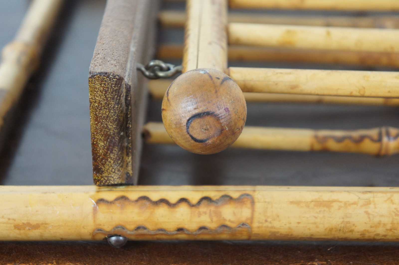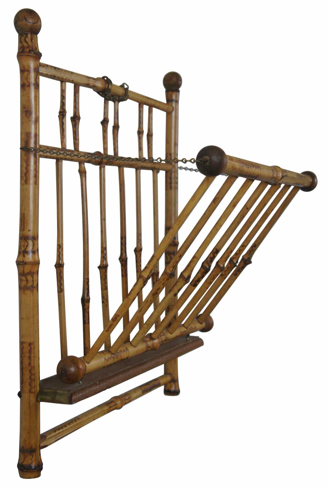 Mid 20th century ball and stick bamboo wall hanging rack. Features a hinged front allowing for stowaway and neat patina. Great for use along a wall or in a bathroom.