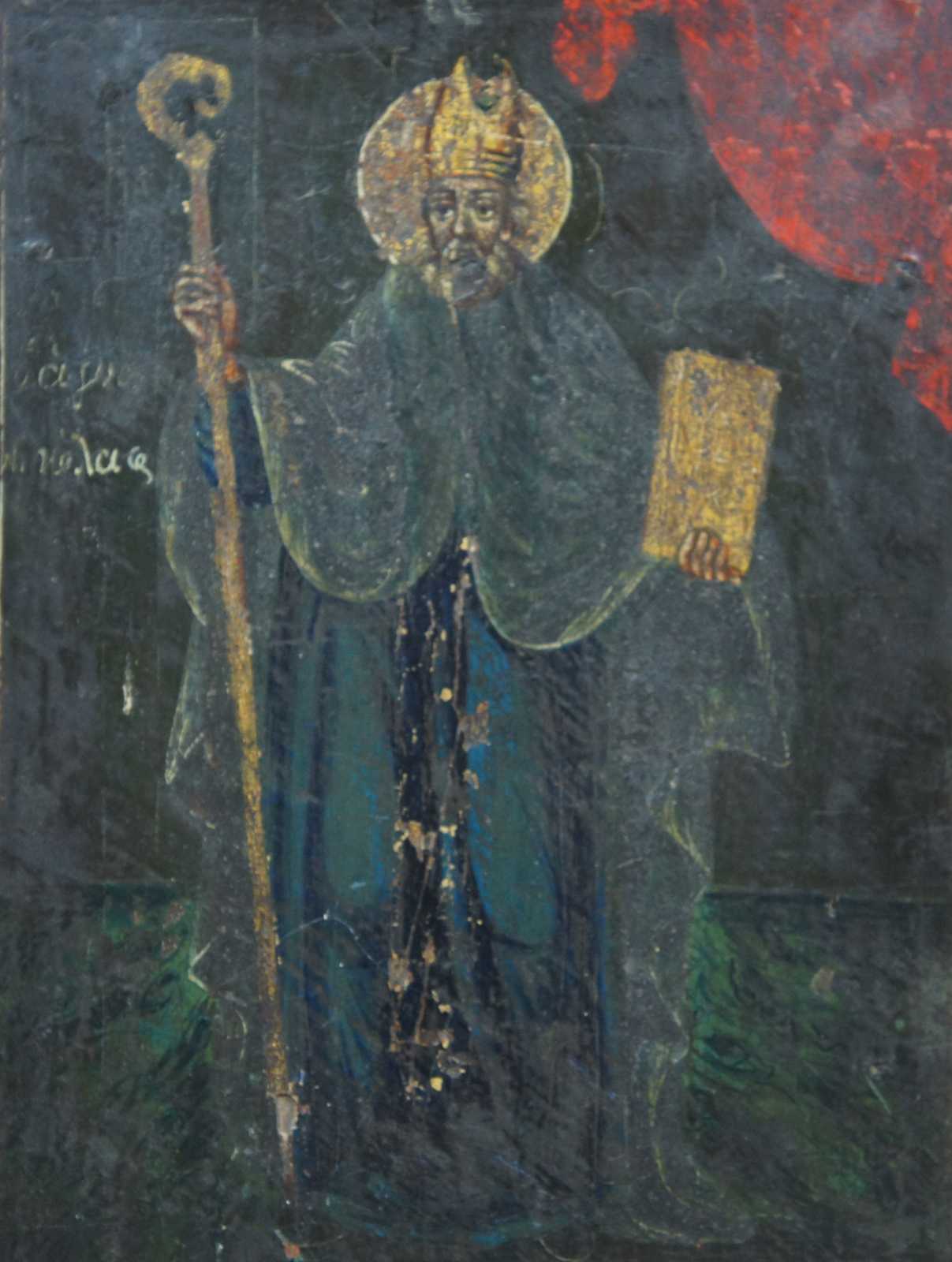 19th century european hand painted icon featuring Saint Patrick on wooded board.
