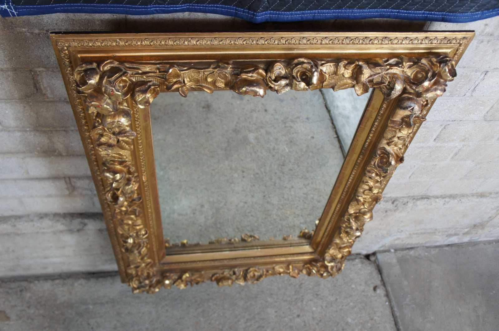 19th century high relief gold mirror. Made from pine with an elaborate rose vine design along the frame. Features gadrooning along the trim and a mirror that could be replaced with artwork if desired.