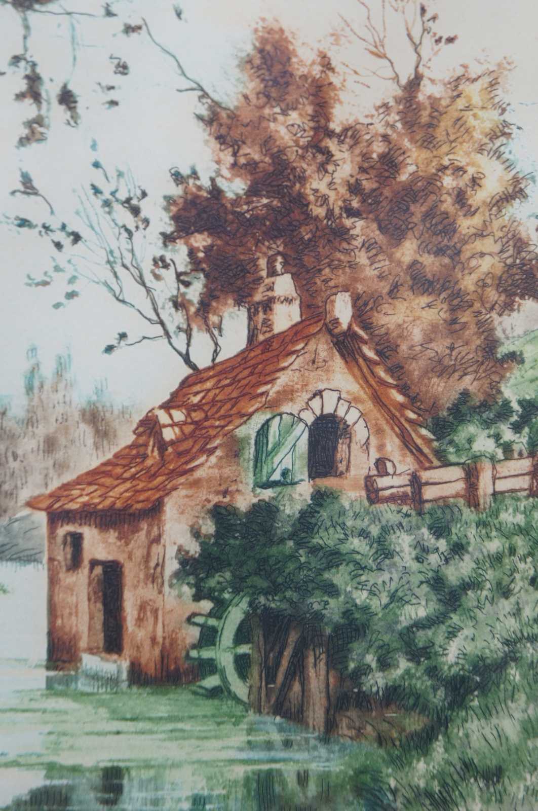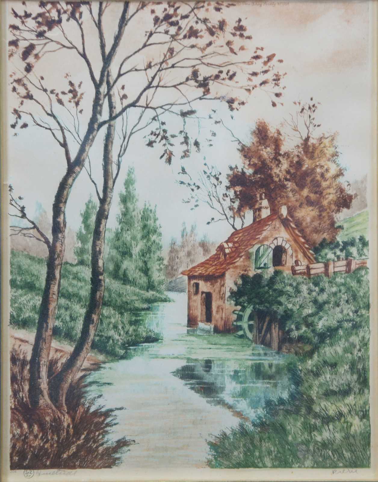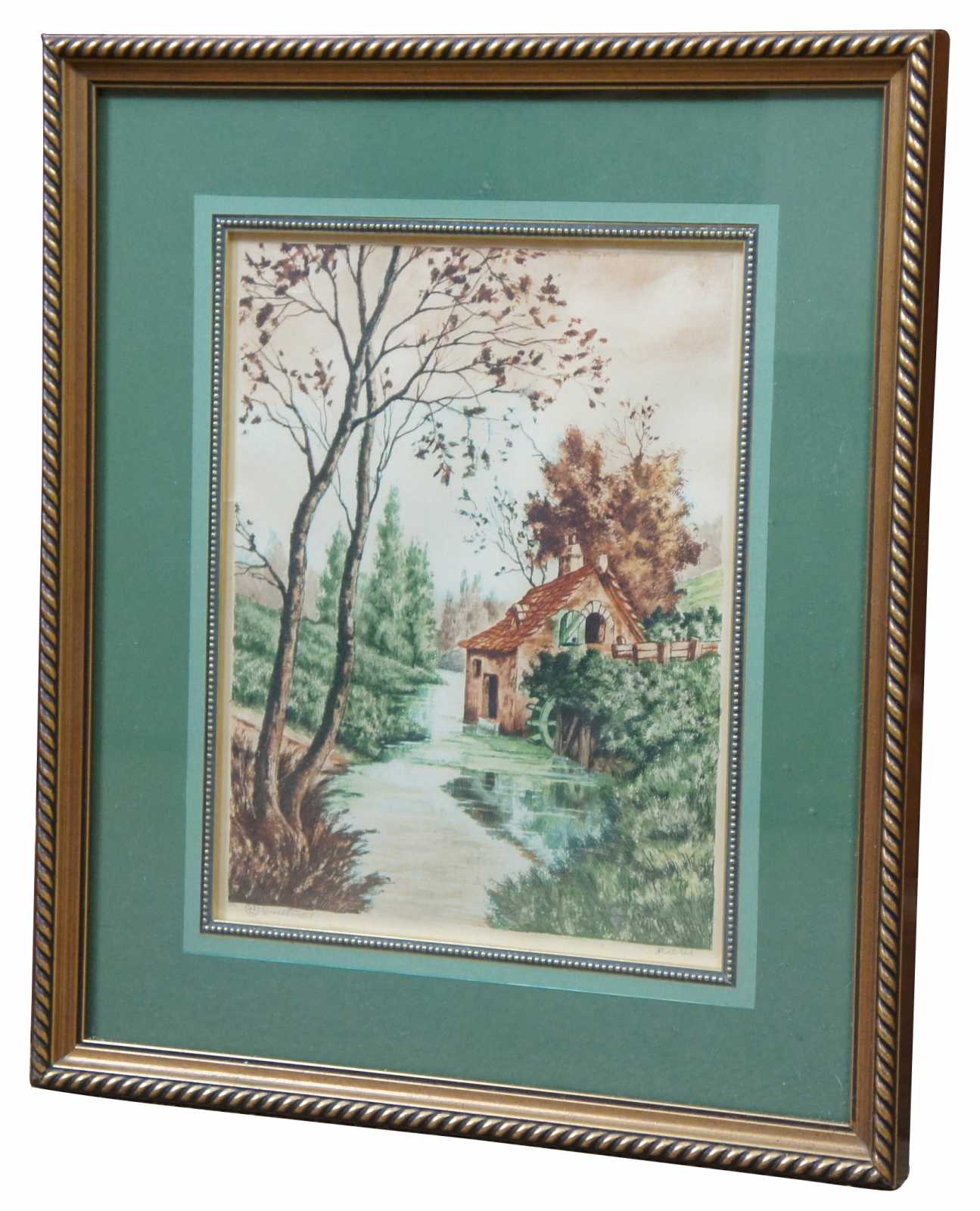 Circa 1930s Waterwheel ethching by Paris Etching Society. Signed Pierre lower right.