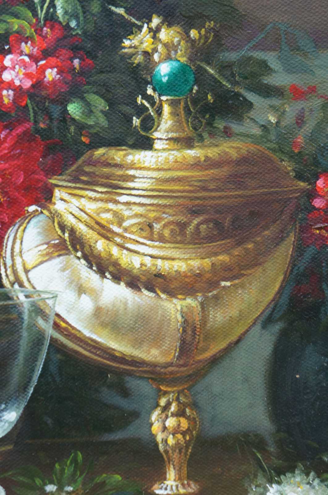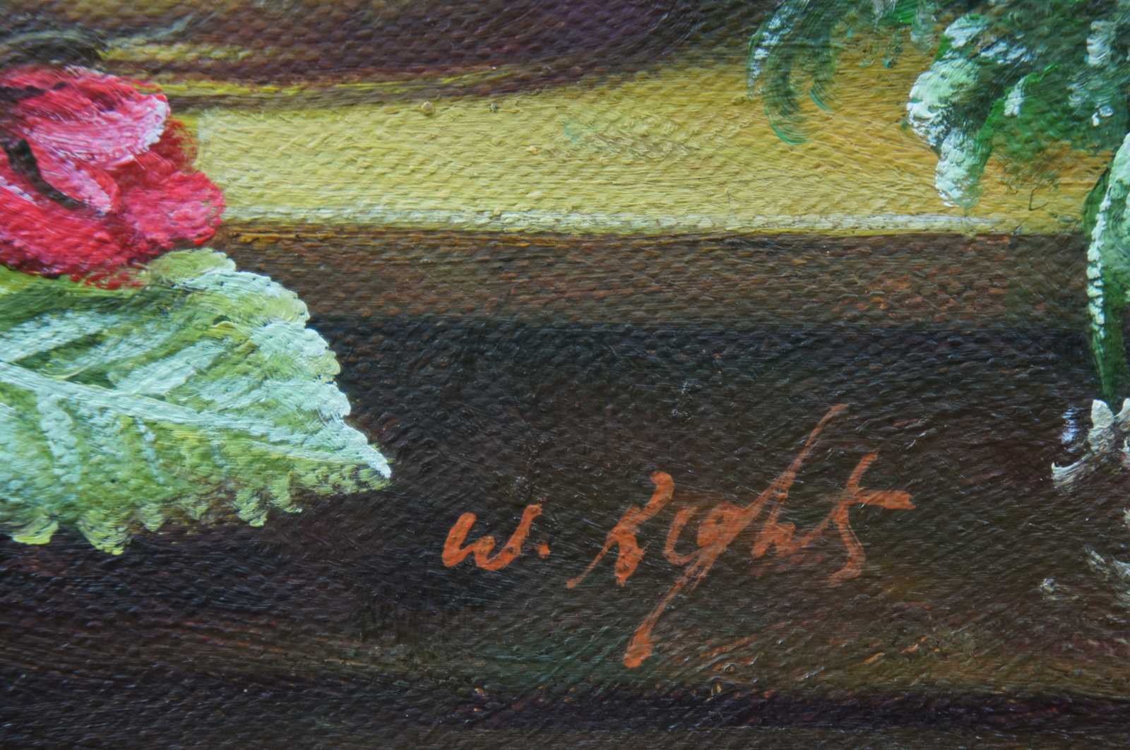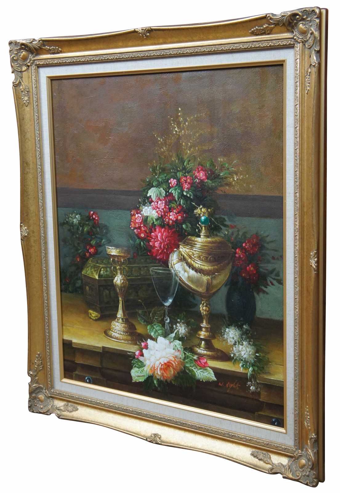 An intriguing 20th century still life by W. Right. Features an altar table with colorful flowers, ornate bronze oil lantern, lantern stand and crystal cordial glass. Canvas signed lower right, French inspired frame.