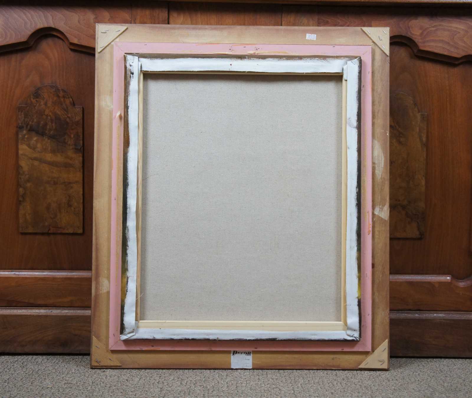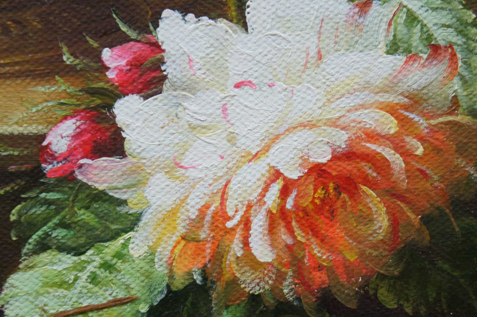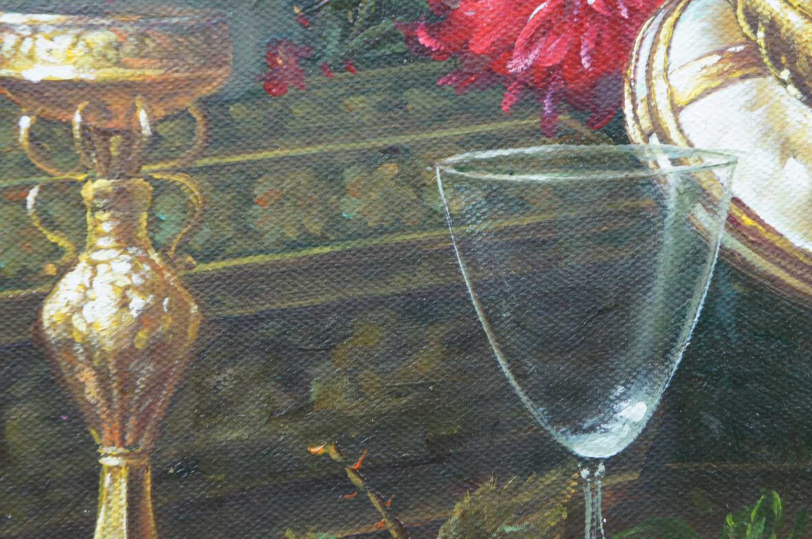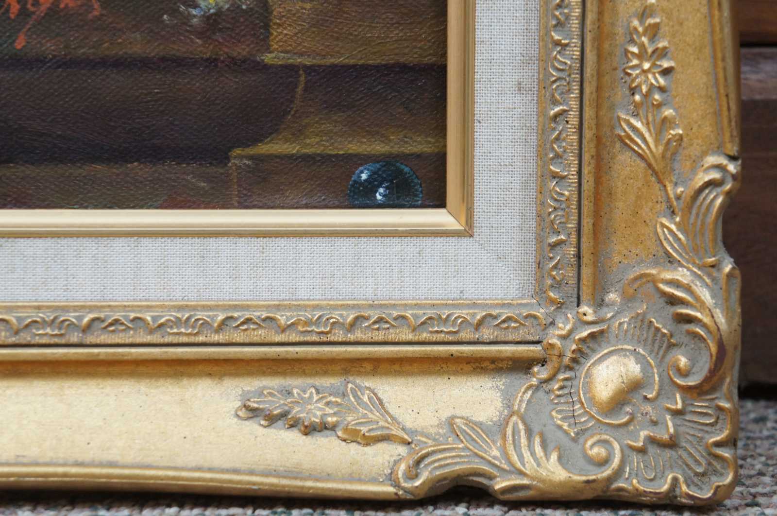 An intriguing 20th century still life by W. Right. Features an altar table with colorful flowers, ornate bronze oil lantern, lantern stand and crystal cordial glass. Canvas signed lower right, French inspired frame.