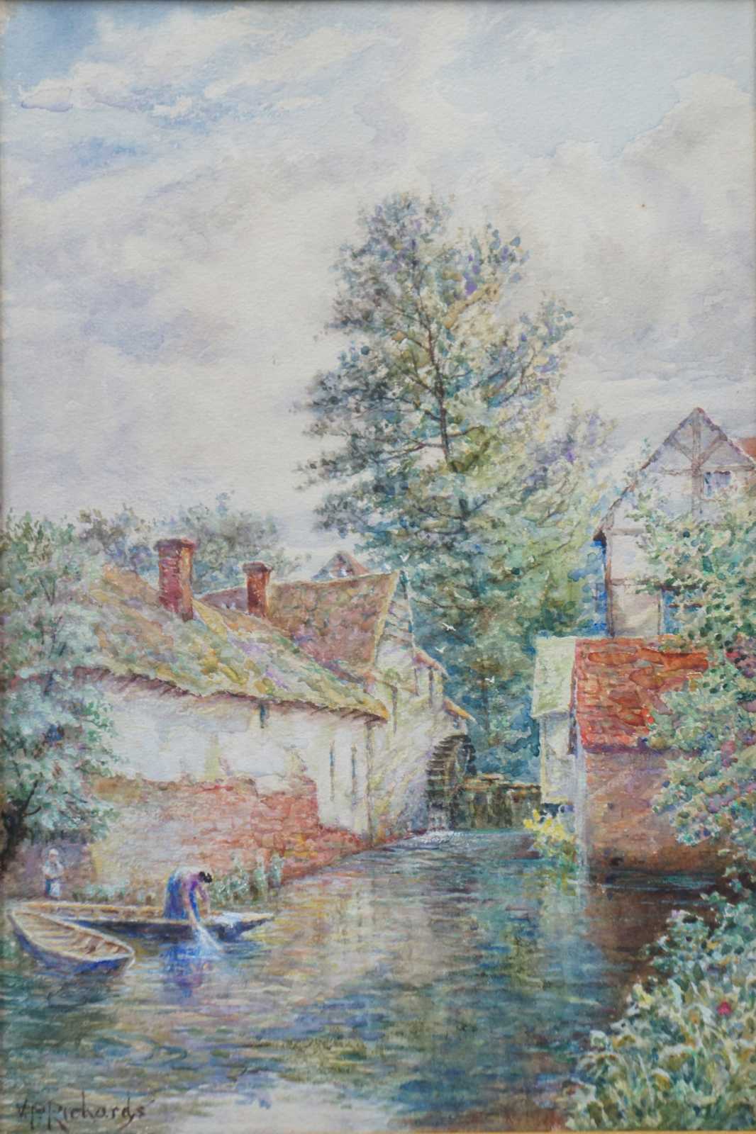 V.P. Richards (British) early 19th century Impressionist artist. A colorful watercolor landscape of Mapledurham Mill, Oxfordshire (England). Painted on Paper, signed lower left and framed. Mapledurham watermill is a historic watermill that was built during the 15th century. Currently a museum.