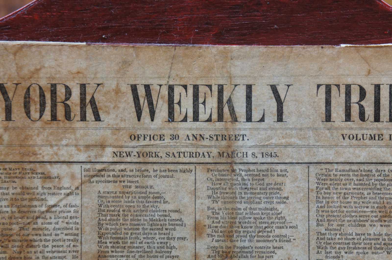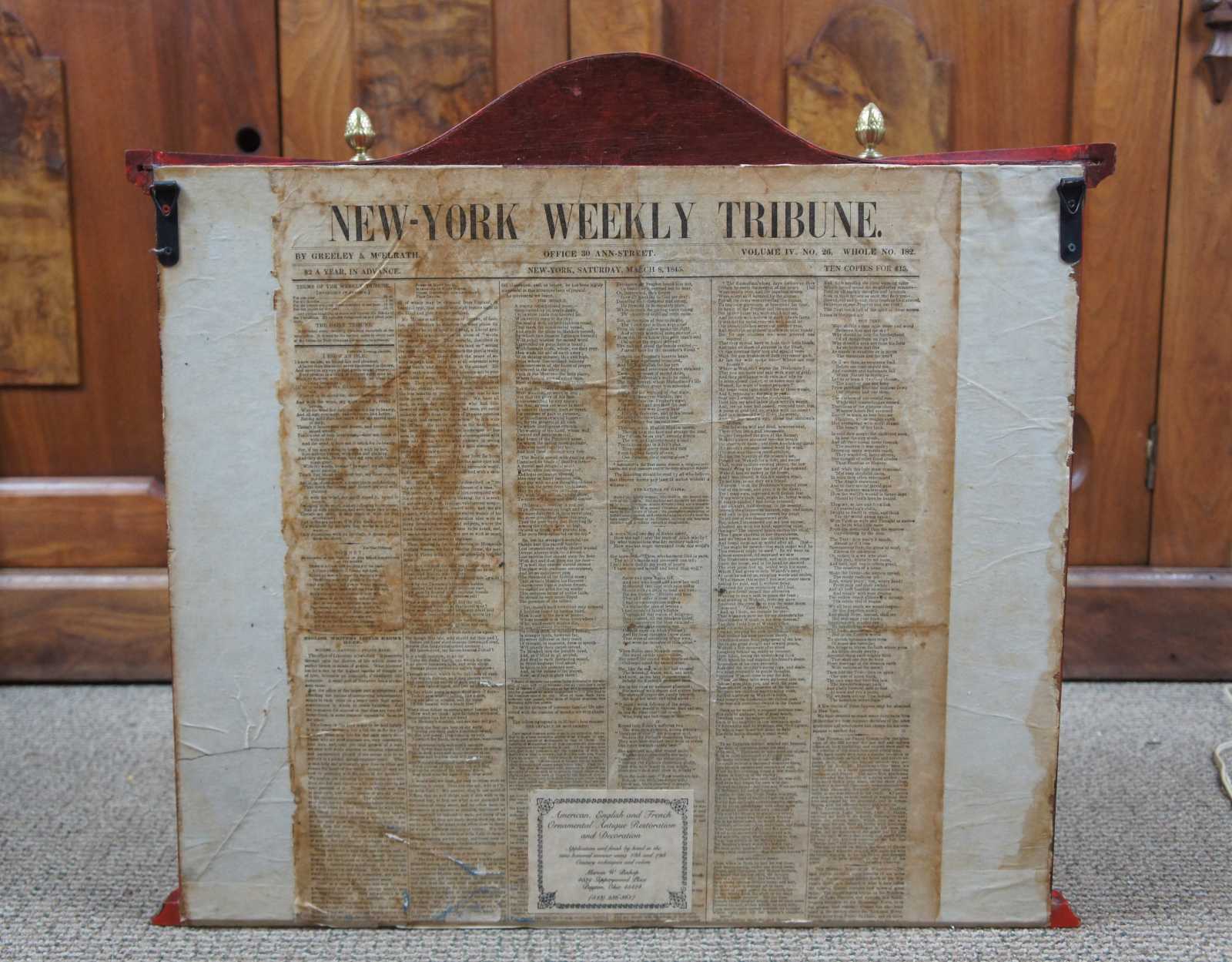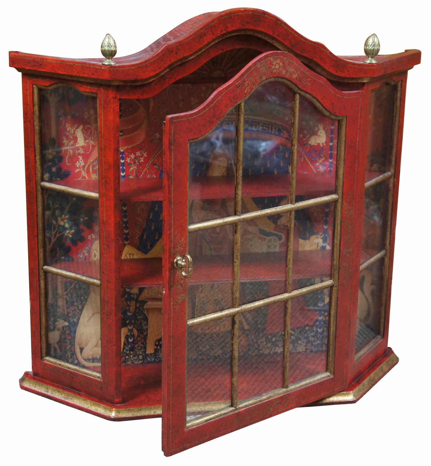 Vintage circa 1970s. wall curio cabinet or display case. Features traditional styling with red and gold distressed paint, glass paneled door and acorn finials. Interior is lined with a Heraldic or Victorian scene.