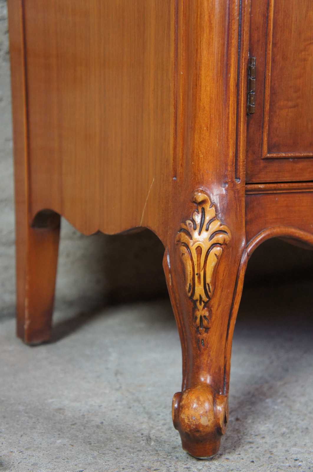 Circa 1940s Mount Airy china cabinet. Made from walnut with a serpentine front and crotch veneered drawers. Features carved accents, scalloped brass hardware and cabriole legs.