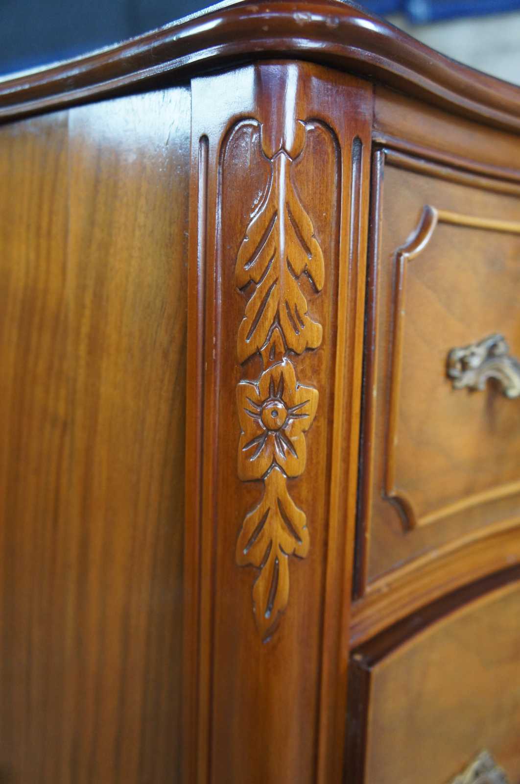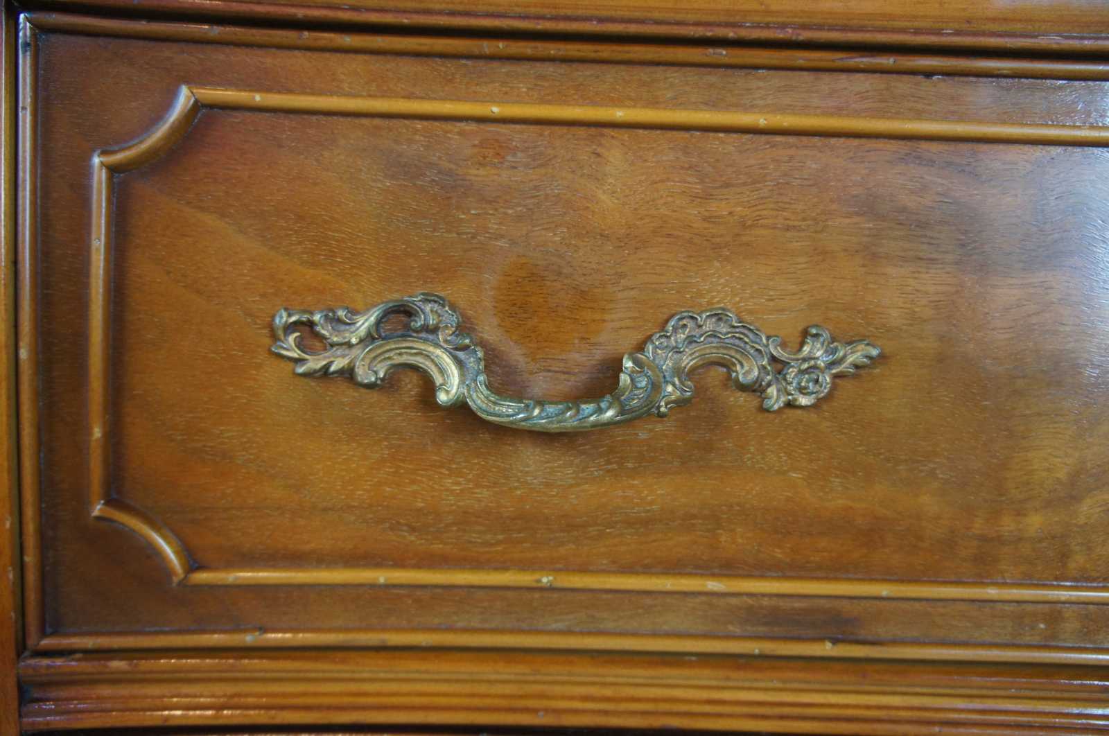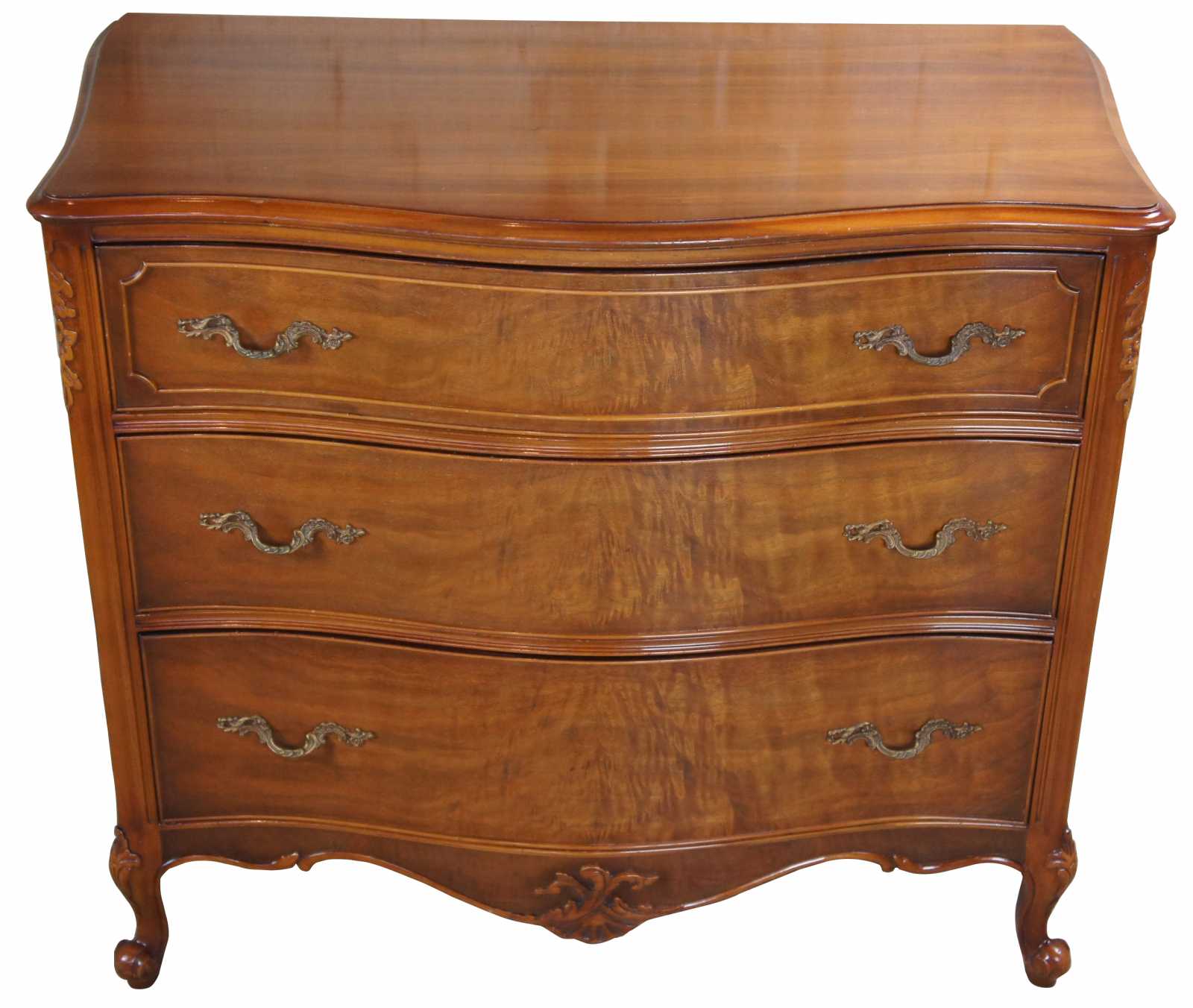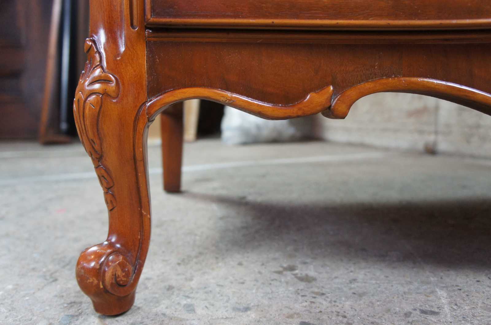 Circa 1940s Mount Airy buffet, server or chest. Made from walnut with a serpentine front and crotch veneered drawers. Features carved accents, scalloped brass hardware, cabriole legs and glass top.